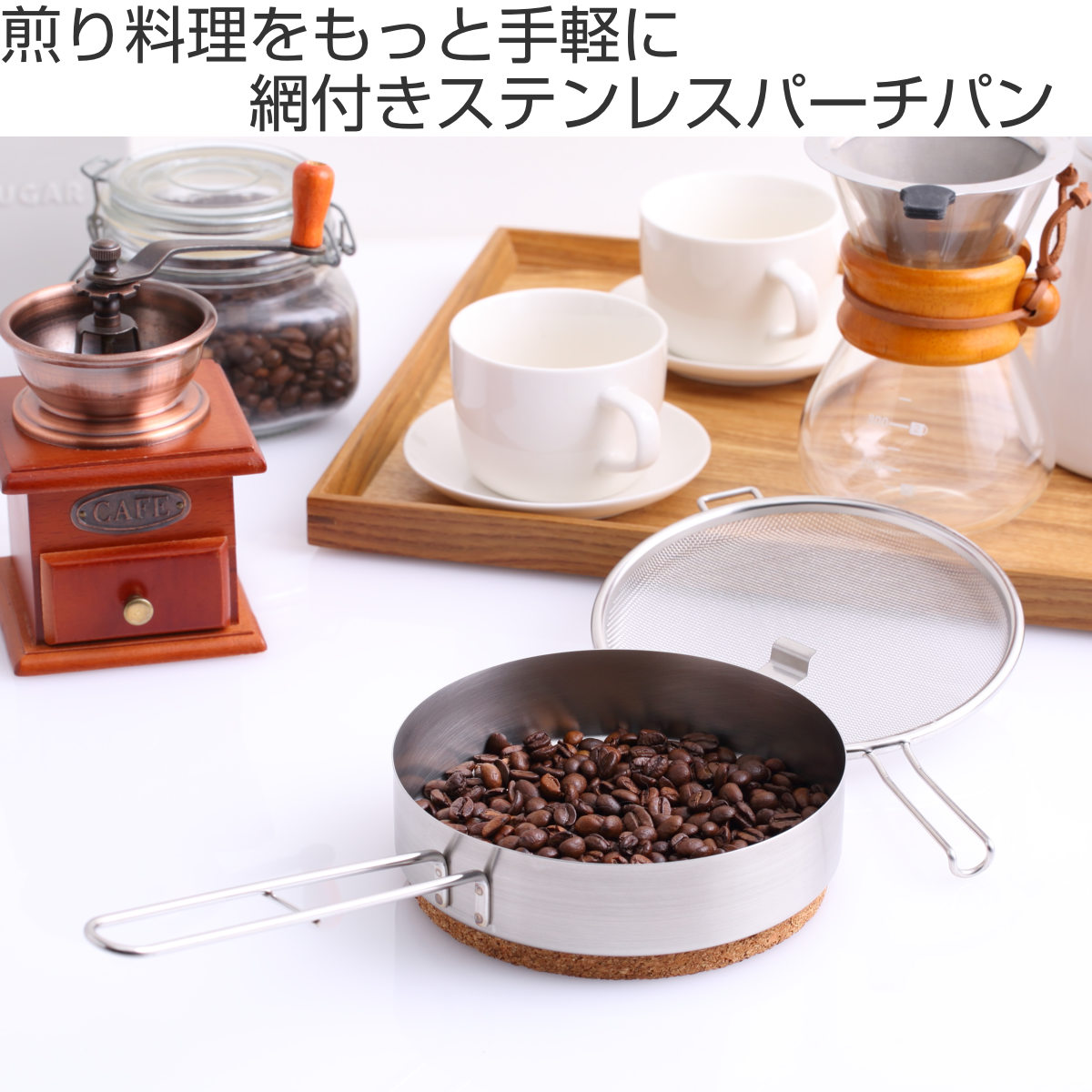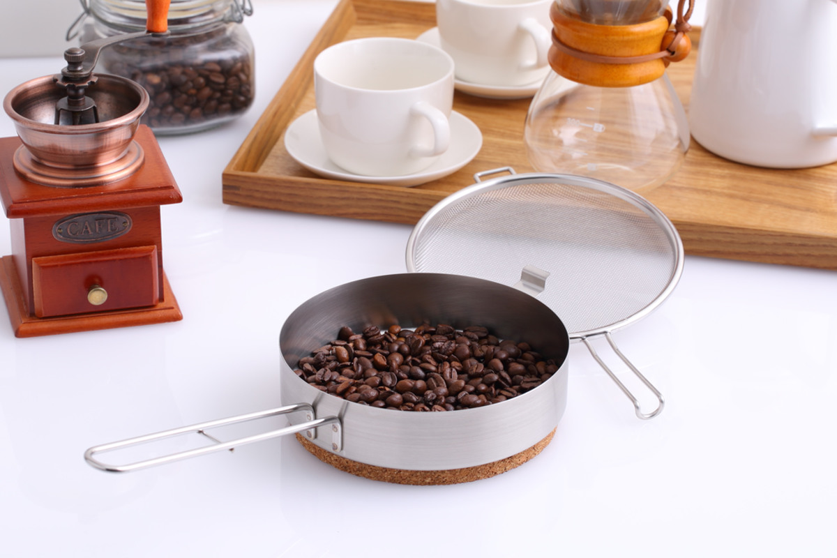 コーヒー豆やごま、銀杏などを手軽に煎ることができる、ステンレス製のパーチパンです。