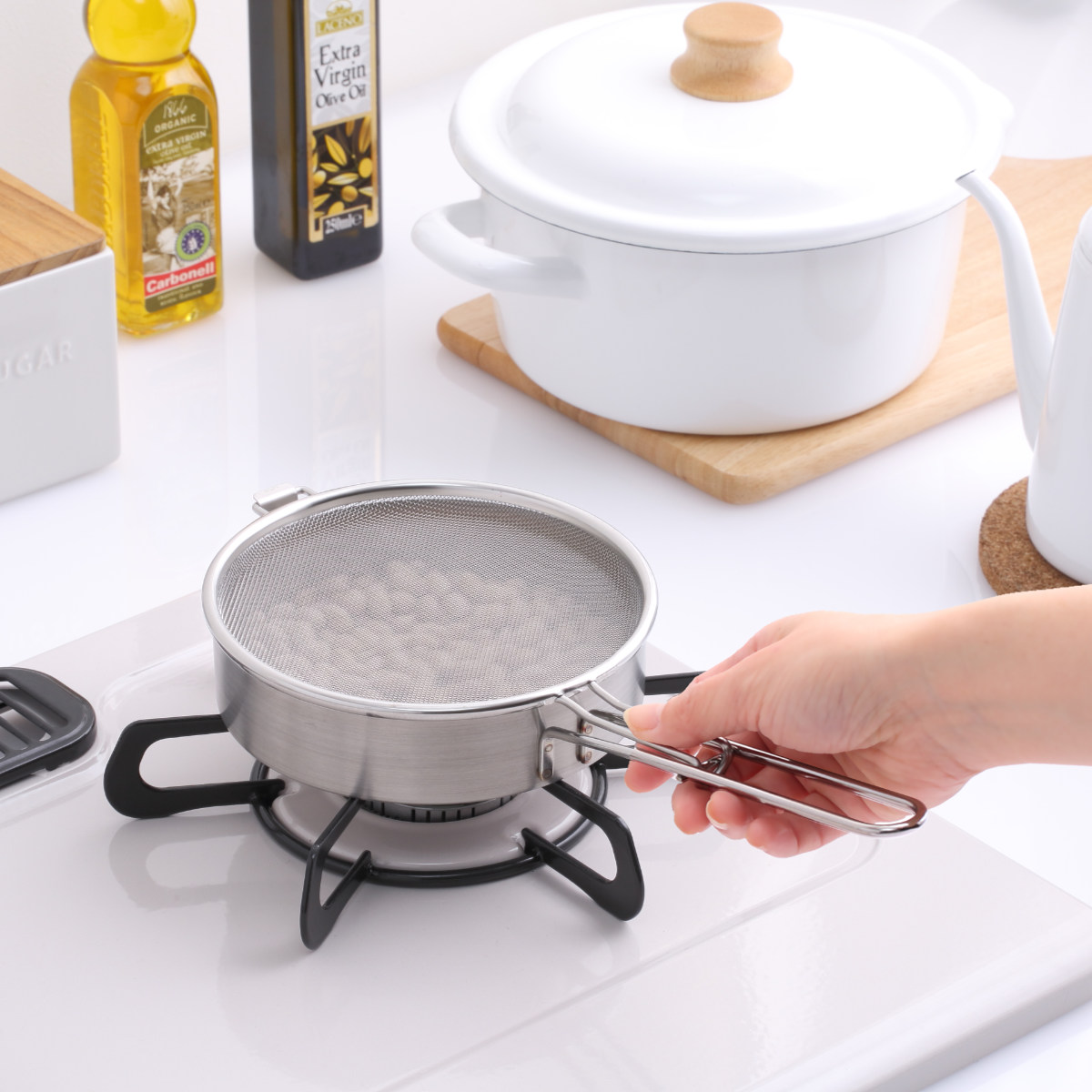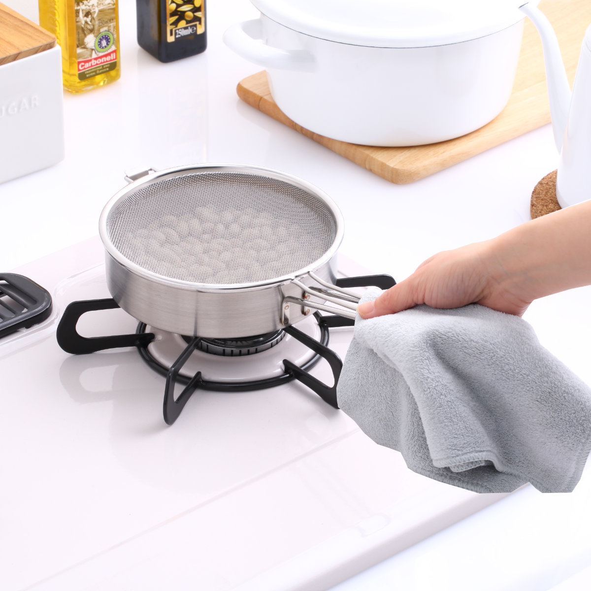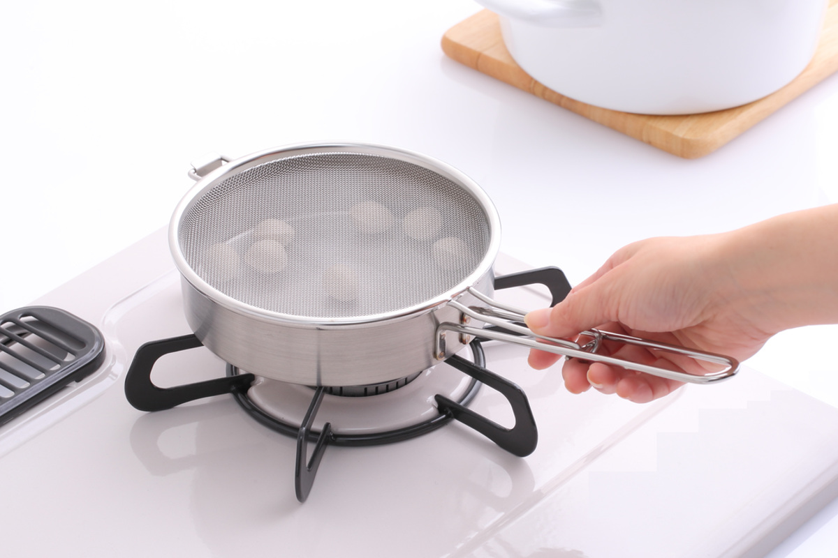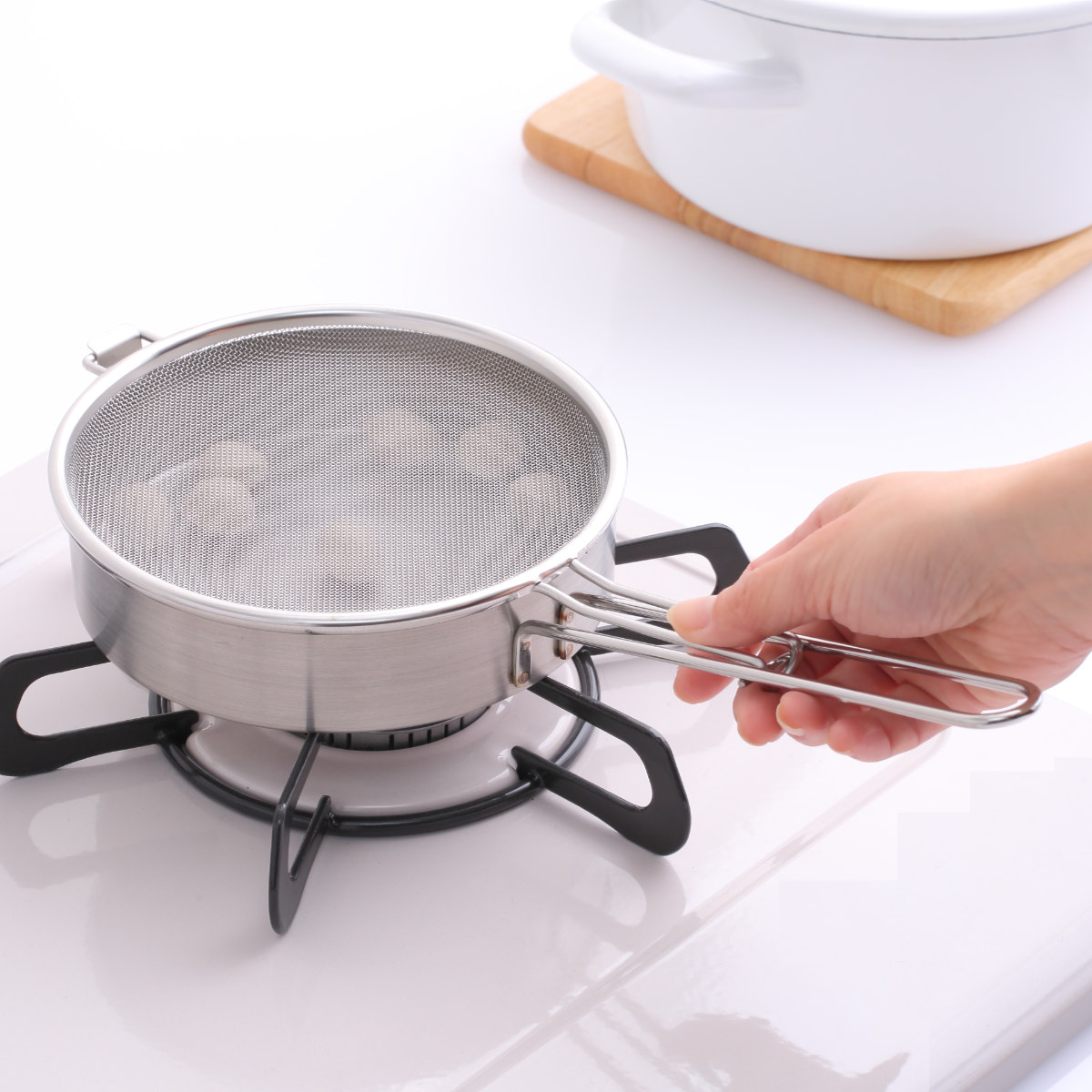 フタのアミが食材の飛び散りを防ぎ、コンロ周りを散らかさず煎り調理ができます。