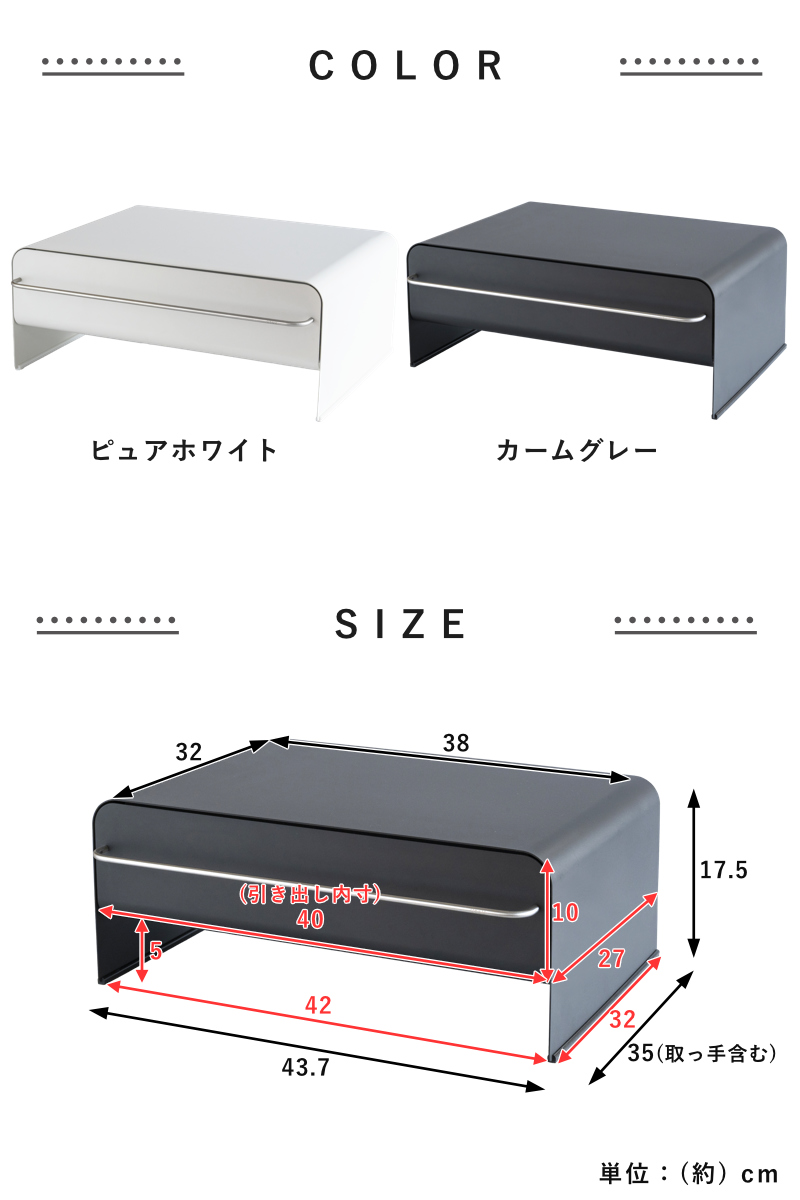 | サイズ | 【外寸】 本体:約 幅43.7×奥行35×高さ17.5(cm) 天板平面:約 幅38×奥行32(cm) 【内寸】 引き出し:約 幅40×奥行27×高さ10(cm) 下部:約 幅42×奥行32×高さ5(cm) |