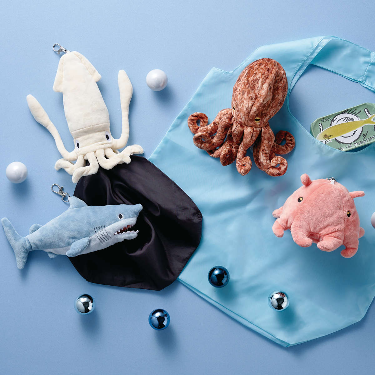 まるで生きものがスミや水を吐き出すようにバッグが現れる、遊び心あふれるエコバッグシリーズ。アクアリウムの世界観をそのまま楽しめる、思わず誰かに見せたくなるデザインです。
