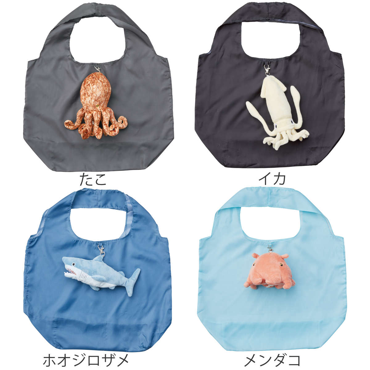 | サイズ | 【エコバッグ】約 横40×縦30(cm) マチ:約 15(cm) ※ハンドル含まず 【たこ】約 幅18×奥行18×高さ15(cm) 【イカ】約 幅14.5×奥行12×高さ18.5(cm) 【ホオジロザメ】約 幅8.5×奥行22×高さ9(cm) 【メンダコ】約 幅14×奥行15×高さ9(cm) |