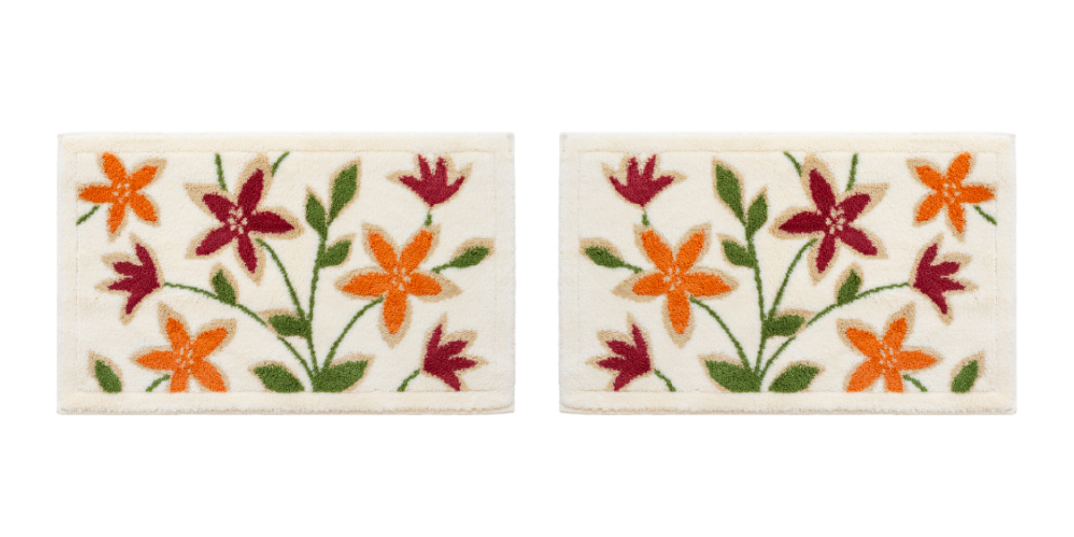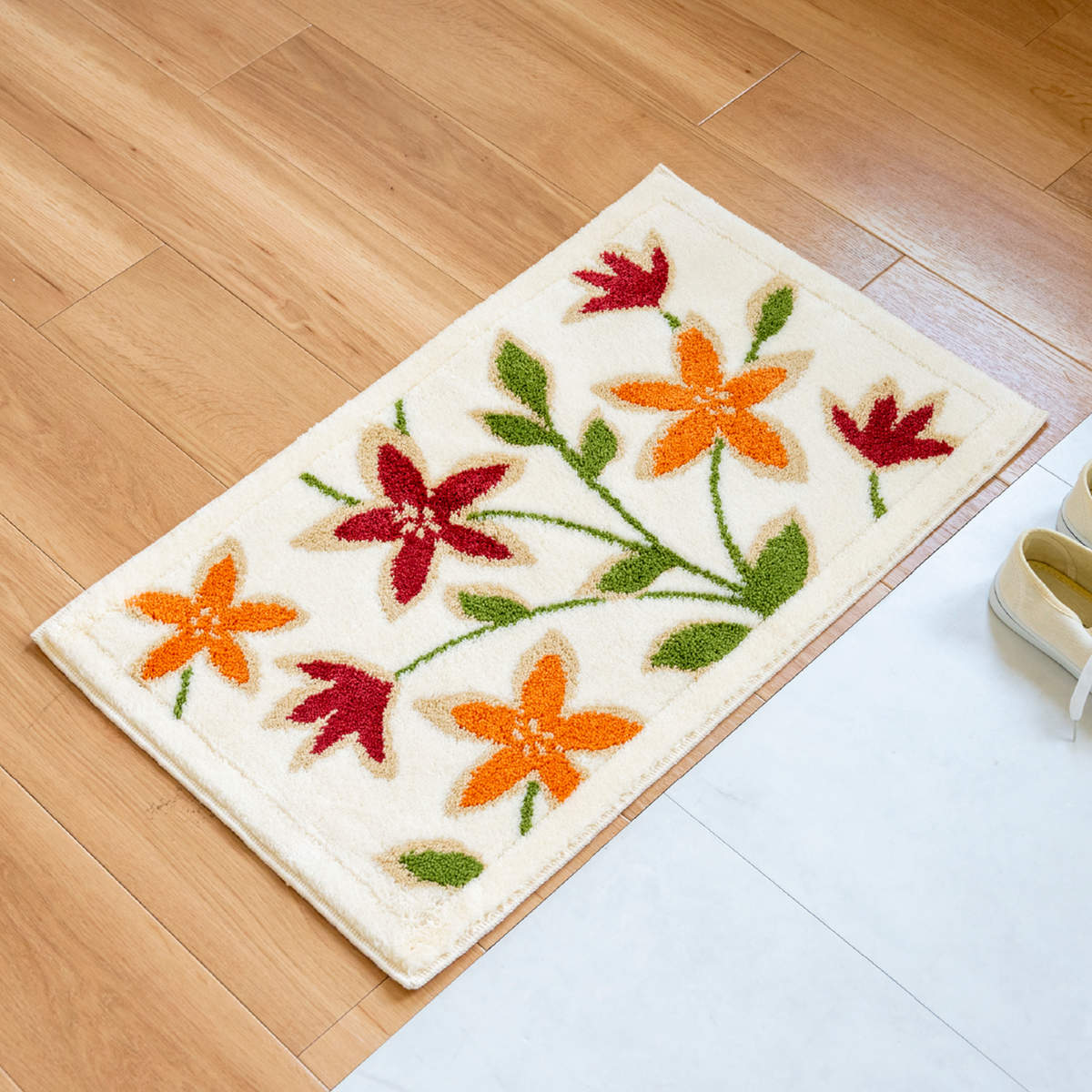 鮮やかな色合いの花柄が美しい玄関マットです。華やかなデザインが足元をパッと彩り、玄関を通るたびに明るい気持ちにしてくれます。薄手で扱いやすく、しっかりとした踏み心地も魅力。玄関はもちろん、ベッドサイドやソファ前など、インテリアマットとしてもお使いいただけます。