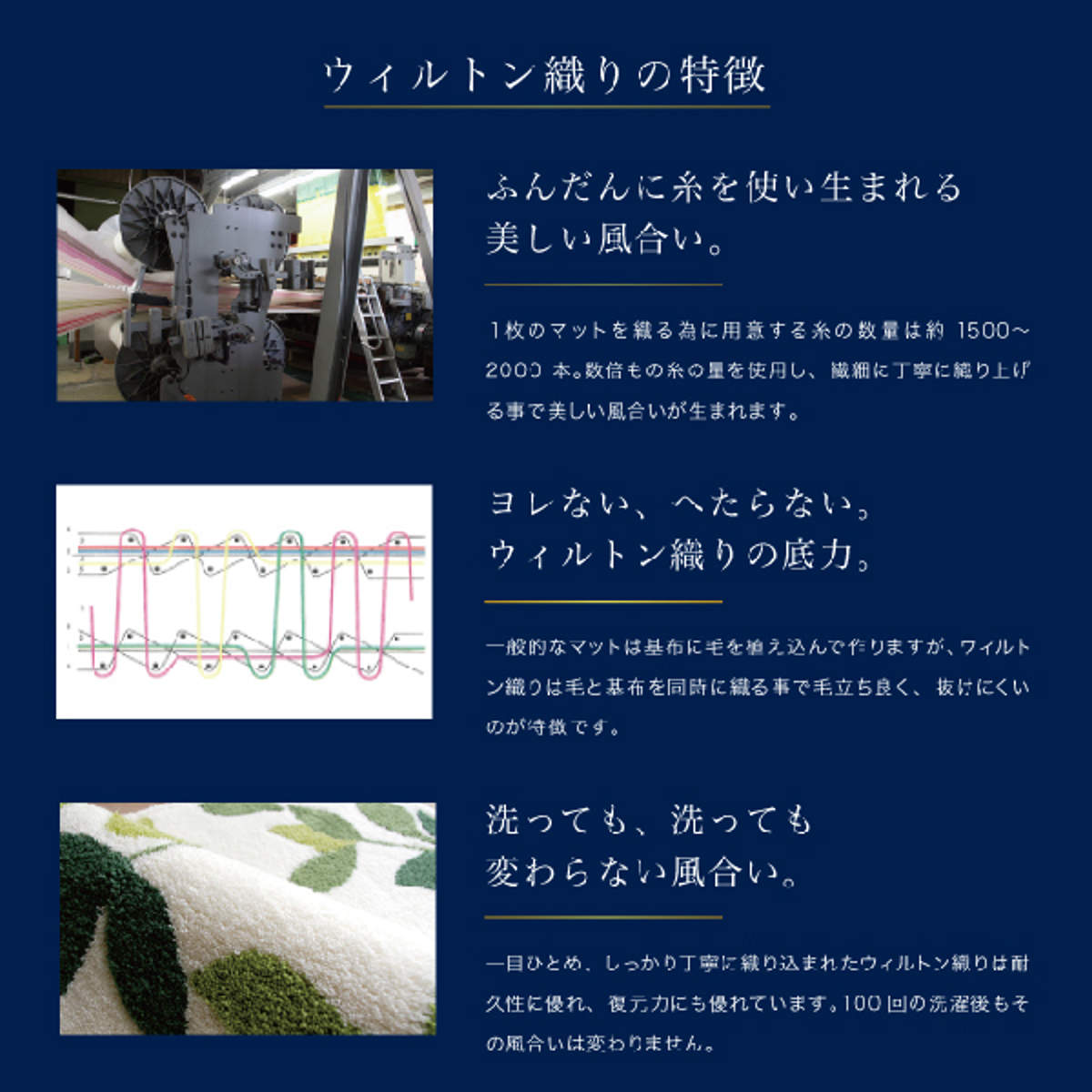 一目ひとめ、しっかり丁寧に織り込まれた、日本製の上質なウィルトン織りのマットです。ウィルトン織りは耐久性と復元力に優れており、繰り返し洗ってもへたれにくいのが特徴です。マットの細部の縫製までこだわり、毛羽立ちが少なく美しい仕上がりです。
