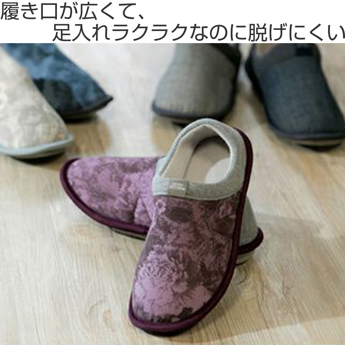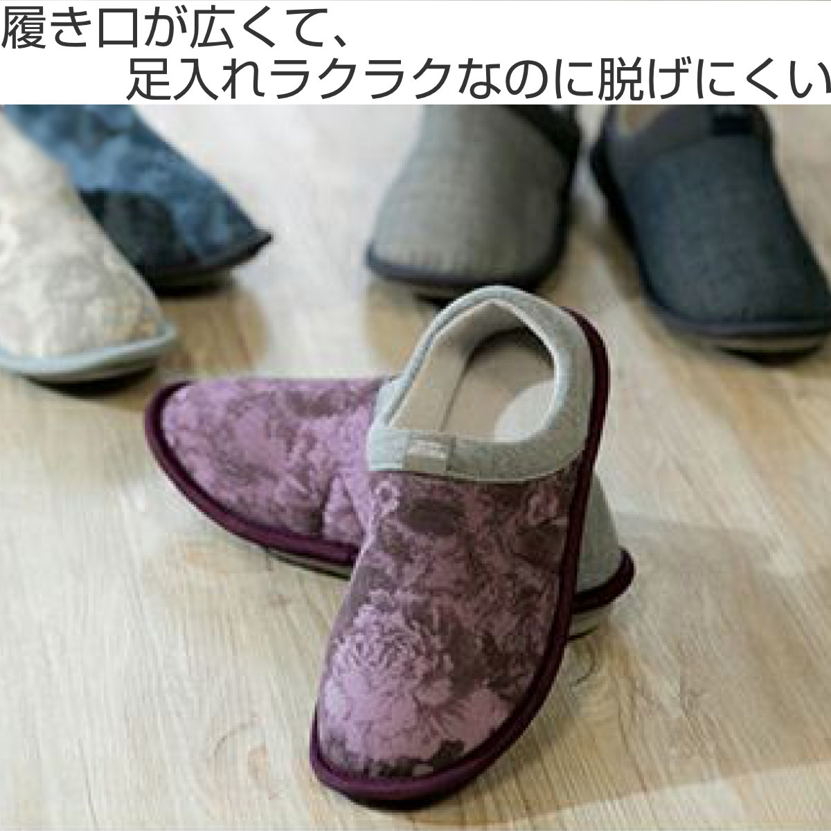 転倒の5割は室内で起きています。お家でも安全にお過ごしいただくため、履きやすく動きやすく、転倒しにくい安心設計です。足入れしやすいのに脱げにくく、足に心地よくフィットします。