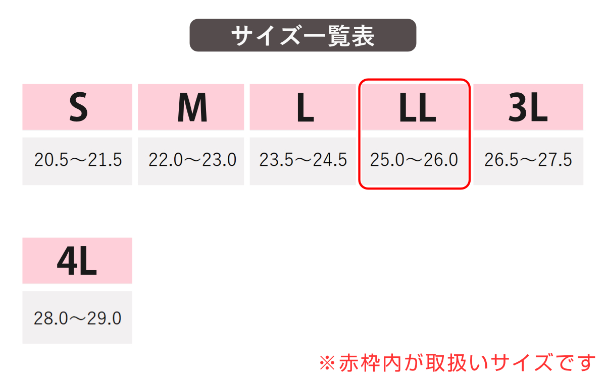![]() LL(25.0~26.0cm) 【▲このページの商品】 | ![]() 3L(26.5~27.5cm) |