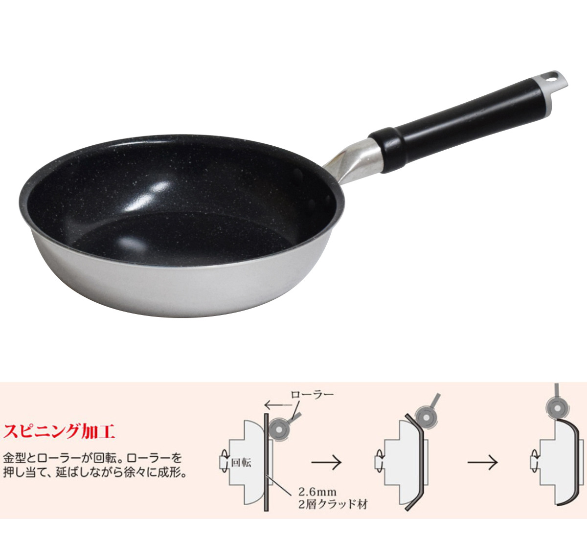 側面を薄く伸ばすスピニング加工により、2層構造でありながら軽量化を実現しました。食材が入った状態でも振りやすく、盛り付けも楽にできます。