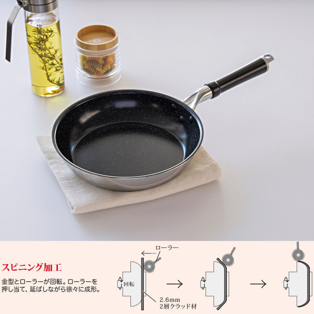 本体にはクラッド材(ステンレスとアルミの複合材)を使用しています。クラッド材は熱伝導に優れているので温まりやすく、スピーディーな調理がかないます。熱をムラなく全体に伝えるので、食材に均一に火が通りおいしく焼き上がります。