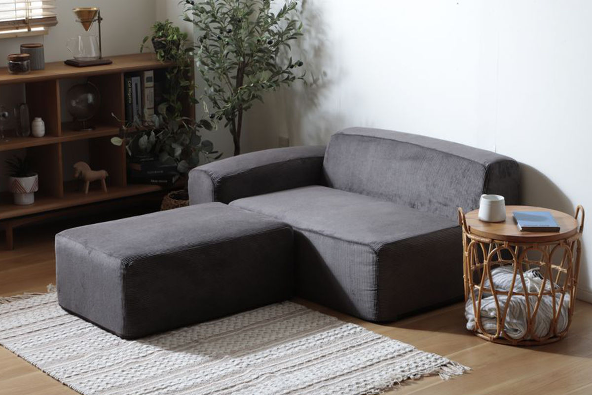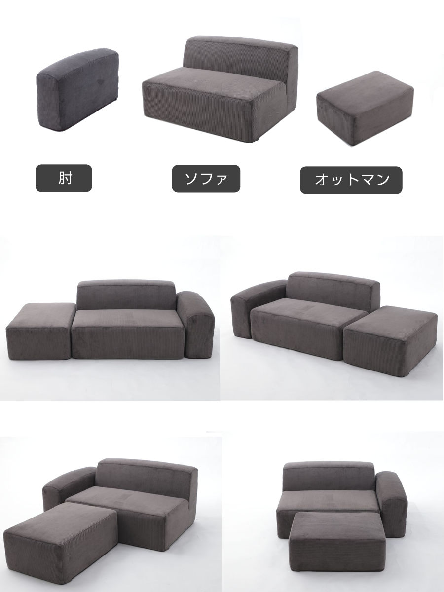 肘・ソファ・オットマンの3つのパーツを自由に組み替えできるデザイン。お部屋の間取りや使い方に合わせて配置を変えられるので、限られたスペースでも無駄なく配置できます。