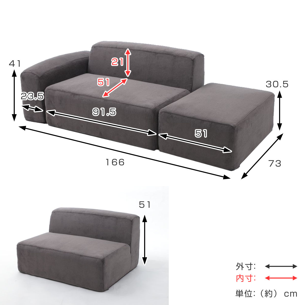 - ソファ:幅91.5×奥行き73×高さ51cm(座面高:30.5cm)