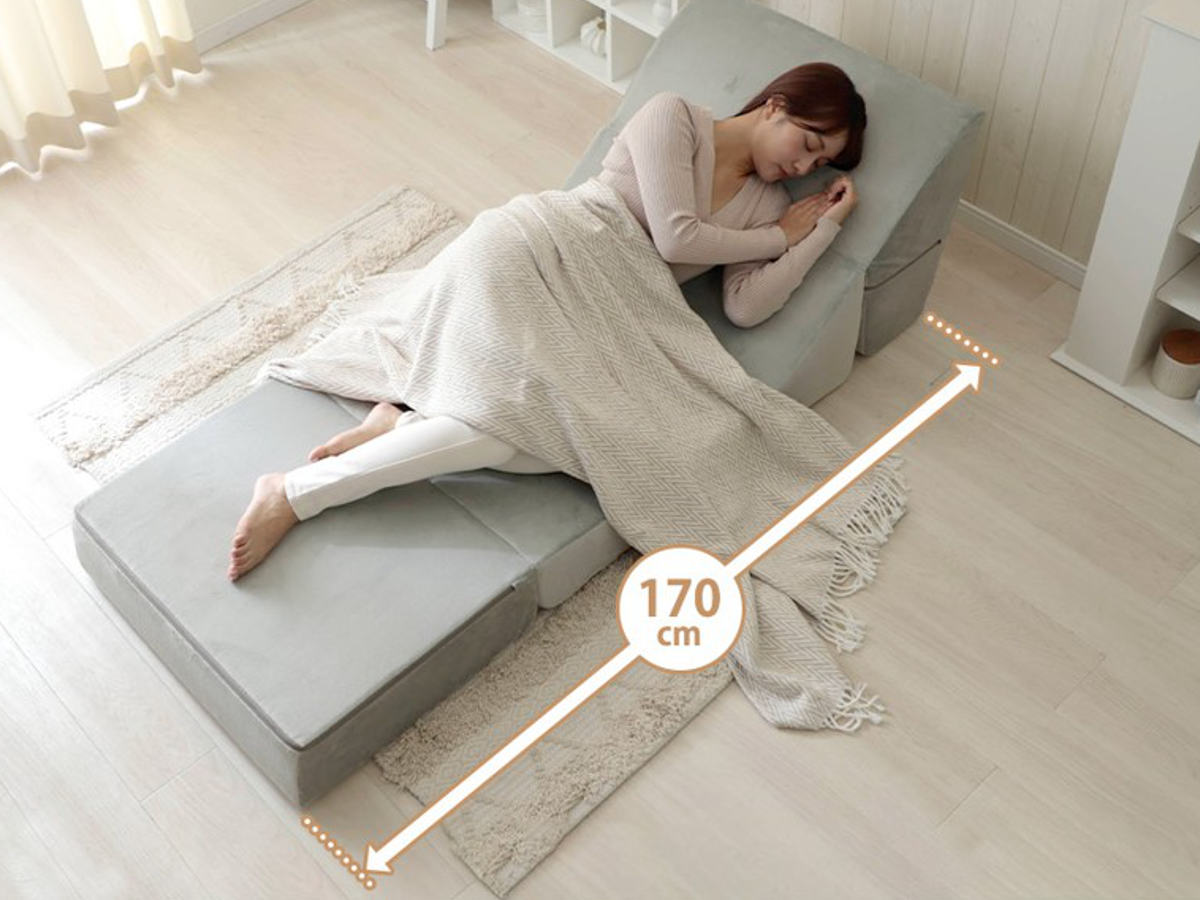 フルフラットにすれば、簡易ベッドとして使用可能。約170cmの長さがあり、足を伸ばしてくつろげます。来客時やお昼寝、リラックスタイムにも便利です。