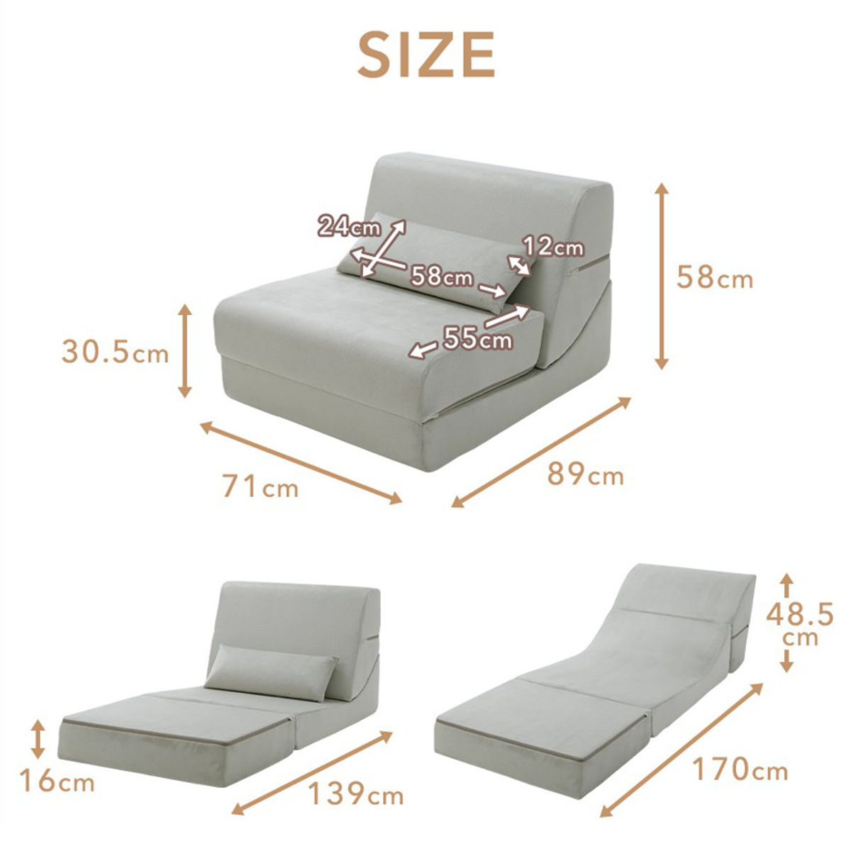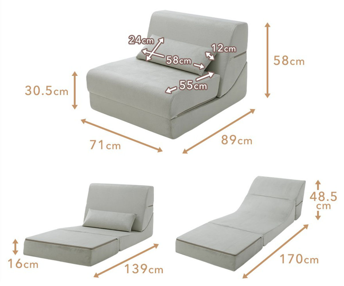 | サイズ | ソファスタイル:幅71×奥行89×高さ58(cm) 座面の高さ30.5cm カウチスタイル:幅71×奥行139×高さ58(cm) 座面の高さ16cm ベッドスタイル:幅71×奥行170×高さ48.5(cm) 座面の高さ16cm |