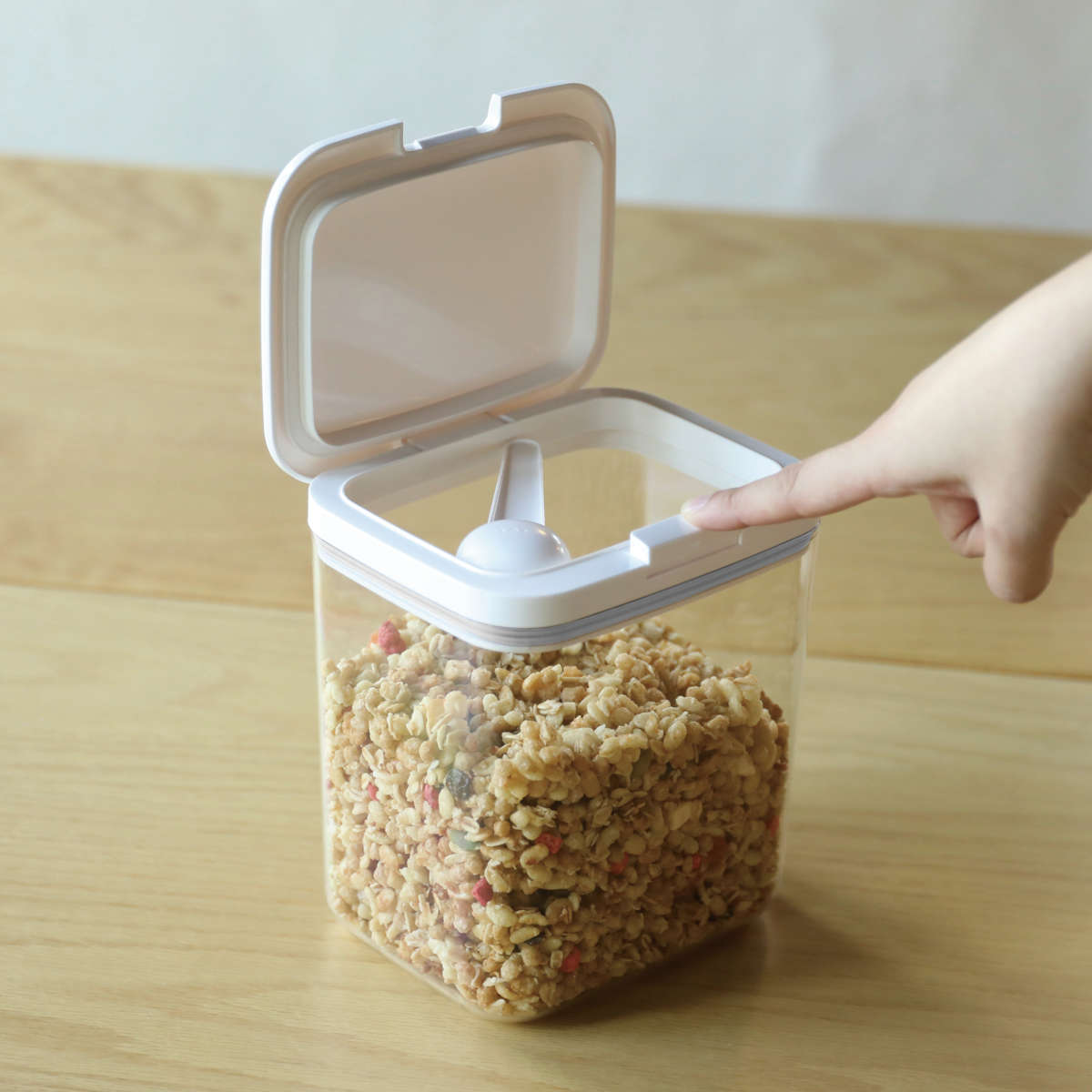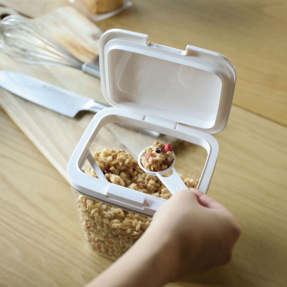 広口形状で食材の出し入れがしやすく、日々の調理や保存がスムーズに行えます。個装のまま入れられるため、詰め替えの手間も省けます。便利な計量スプーンも付いています。