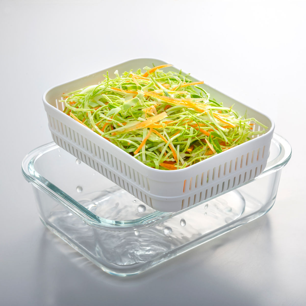 積み重ねて収納できるので、冷蔵庫内をすっきり整理でき、作り置きもしやすくなります。また、保存容器とザルがセットになっているため、使わないときもコンパクトに収納できます。