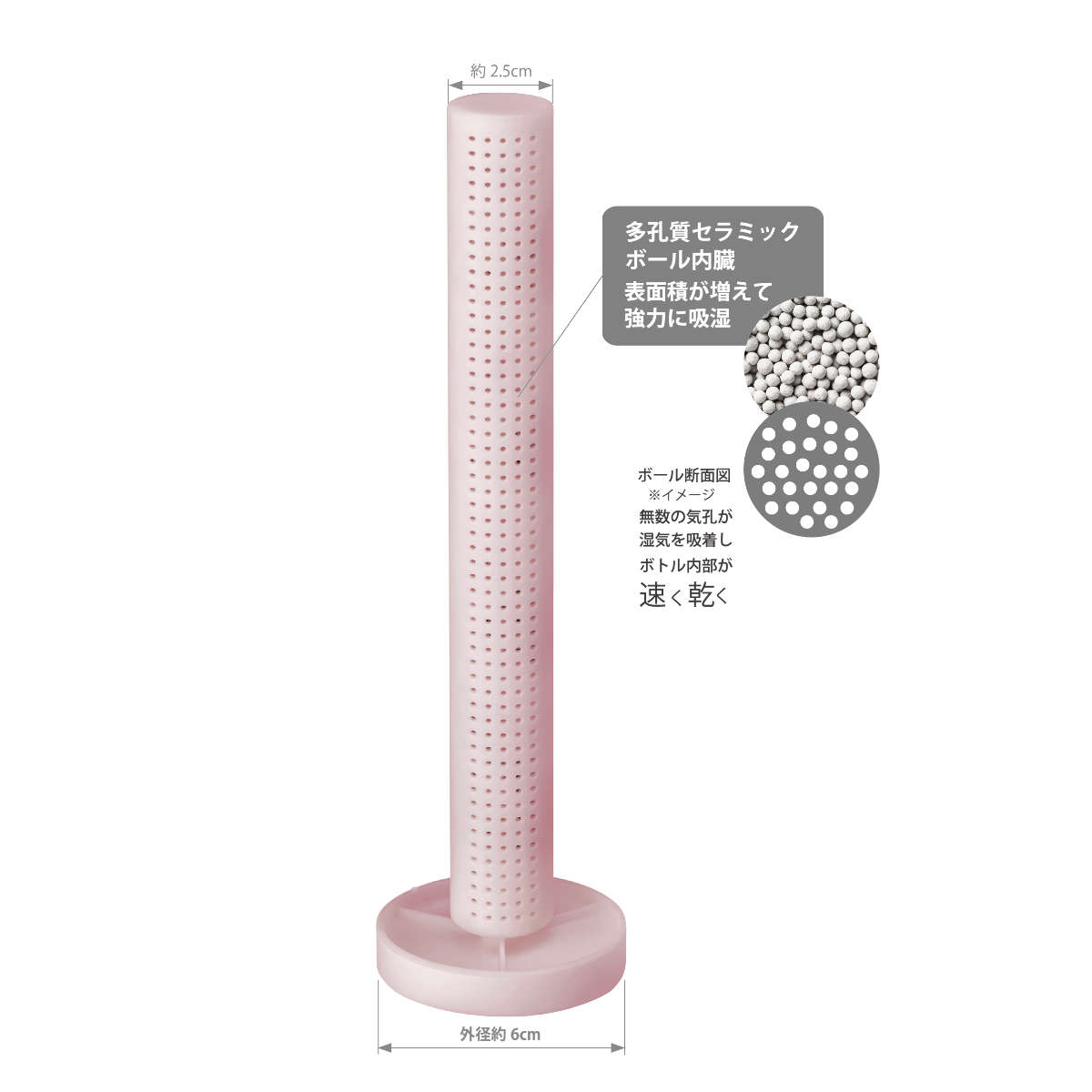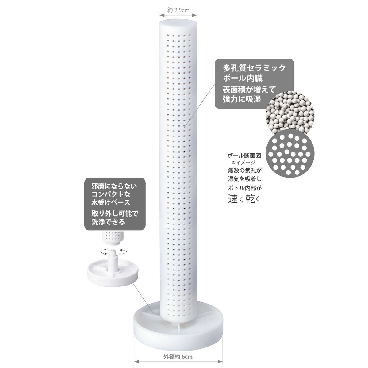多孔質セラミックボールを内蔵した本体が湿気を素早く吸収します。ボール状で表面積が大きいため吸湿力が高く、乾きにくいボトル内部をしっかり乾燥します。