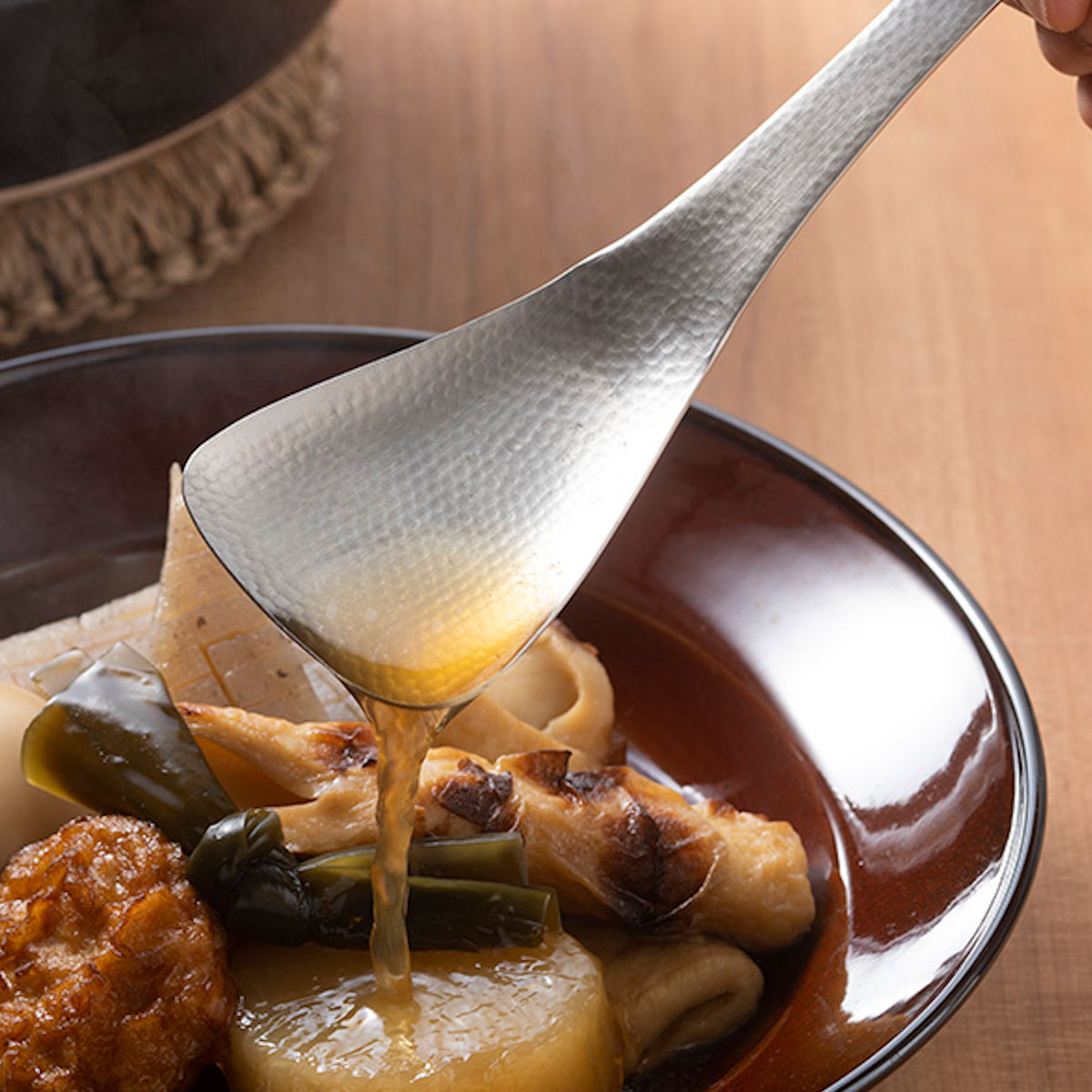 角型形状で料理をすくいやすい、取り分けスプーンの角タイプです。平らな面があるため、料理をしっかり支えます。炒め物や煮物、グラタンなども安定して取り分けられ、盛り付けがしやすいのが特長です。