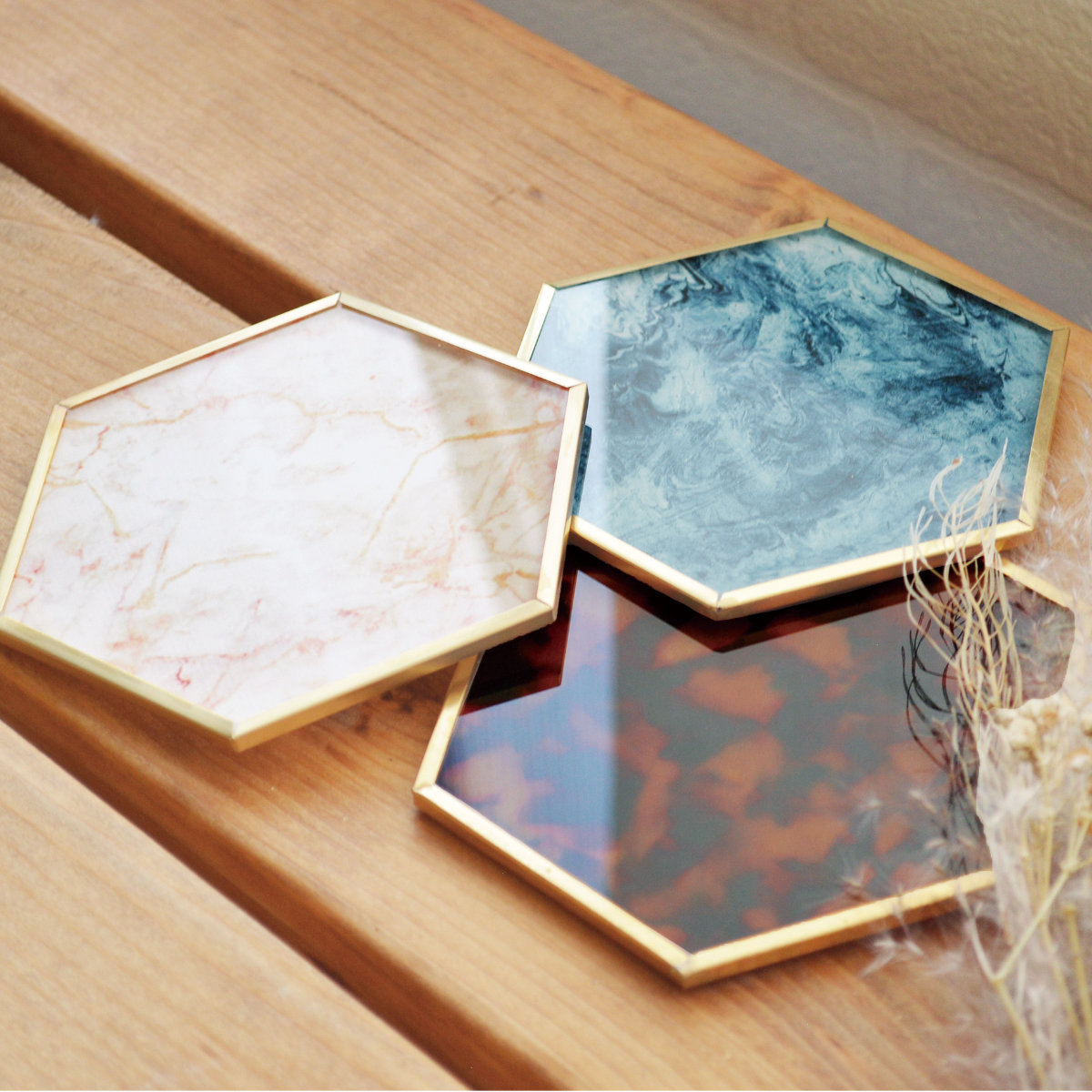 大理石のようなニュアンス模様と上品な光沢がテーブルを華やかに演出します。ドリンク用のコースターとしてはもちろん、アクセサリーや小物を置くミニトレイとしても使えるアイテムです。