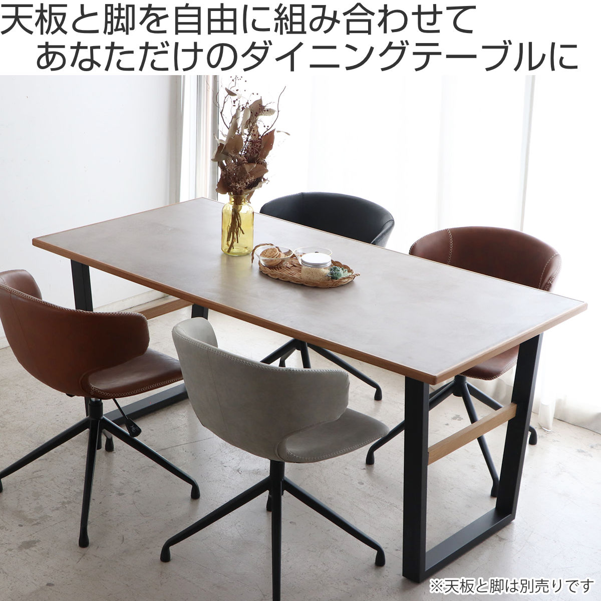 別売りの専用脚と組み合わせることで、ダイニングテーブルとして完成します。