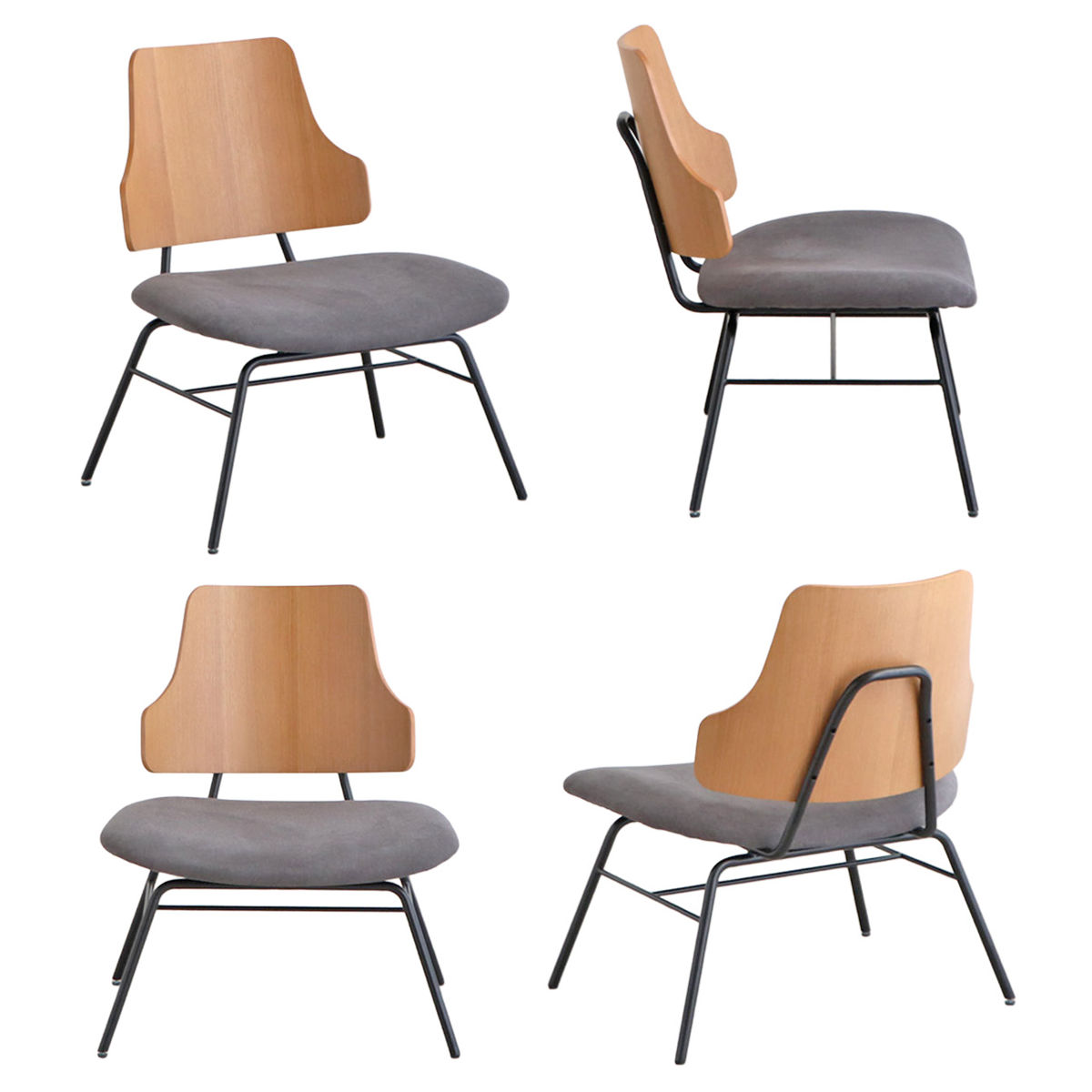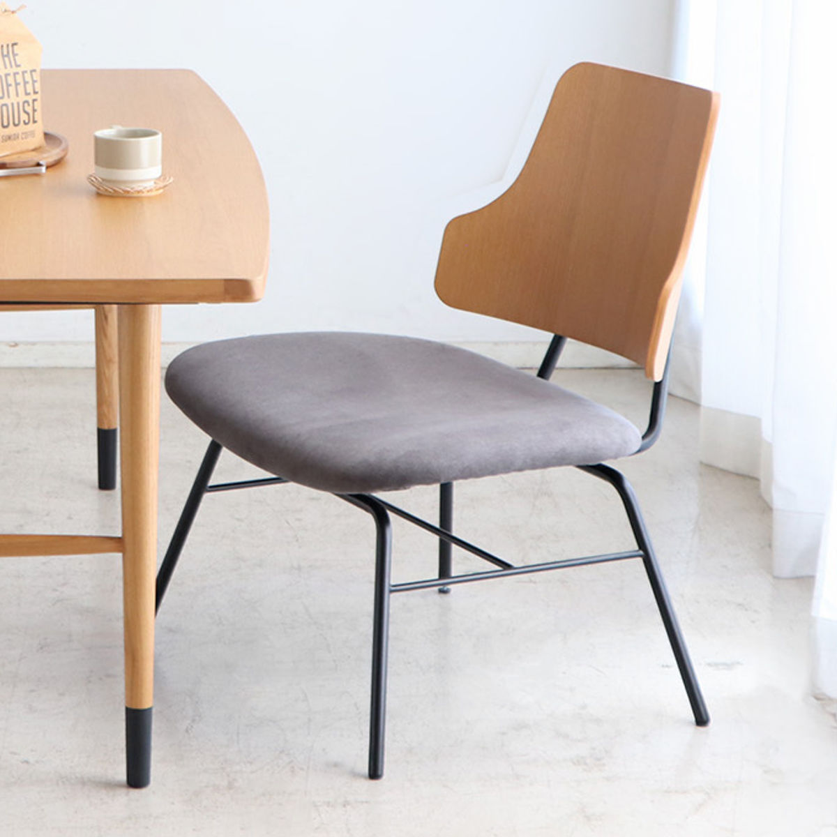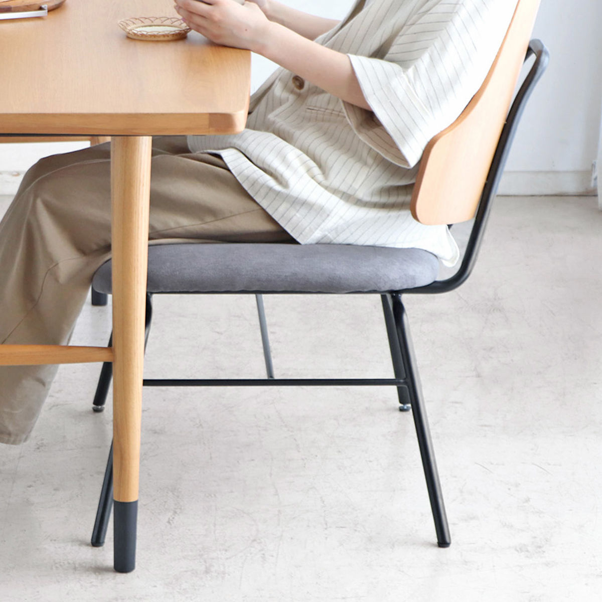 背もたれには、天然木の風合いを活かしたアッシュ材突板を使用。異素材のスチール脚と組み合わせることで、温かみの中に程よいモダンさをプラスしたデザインです。