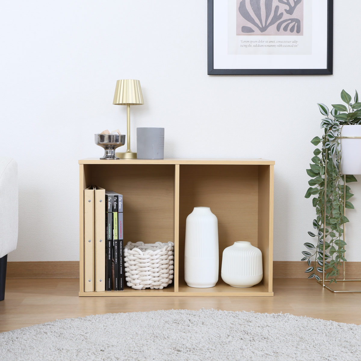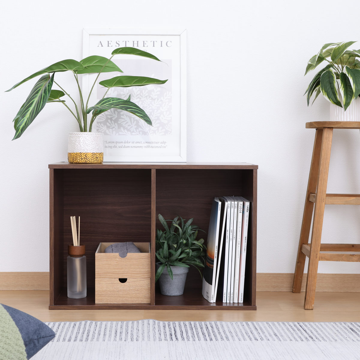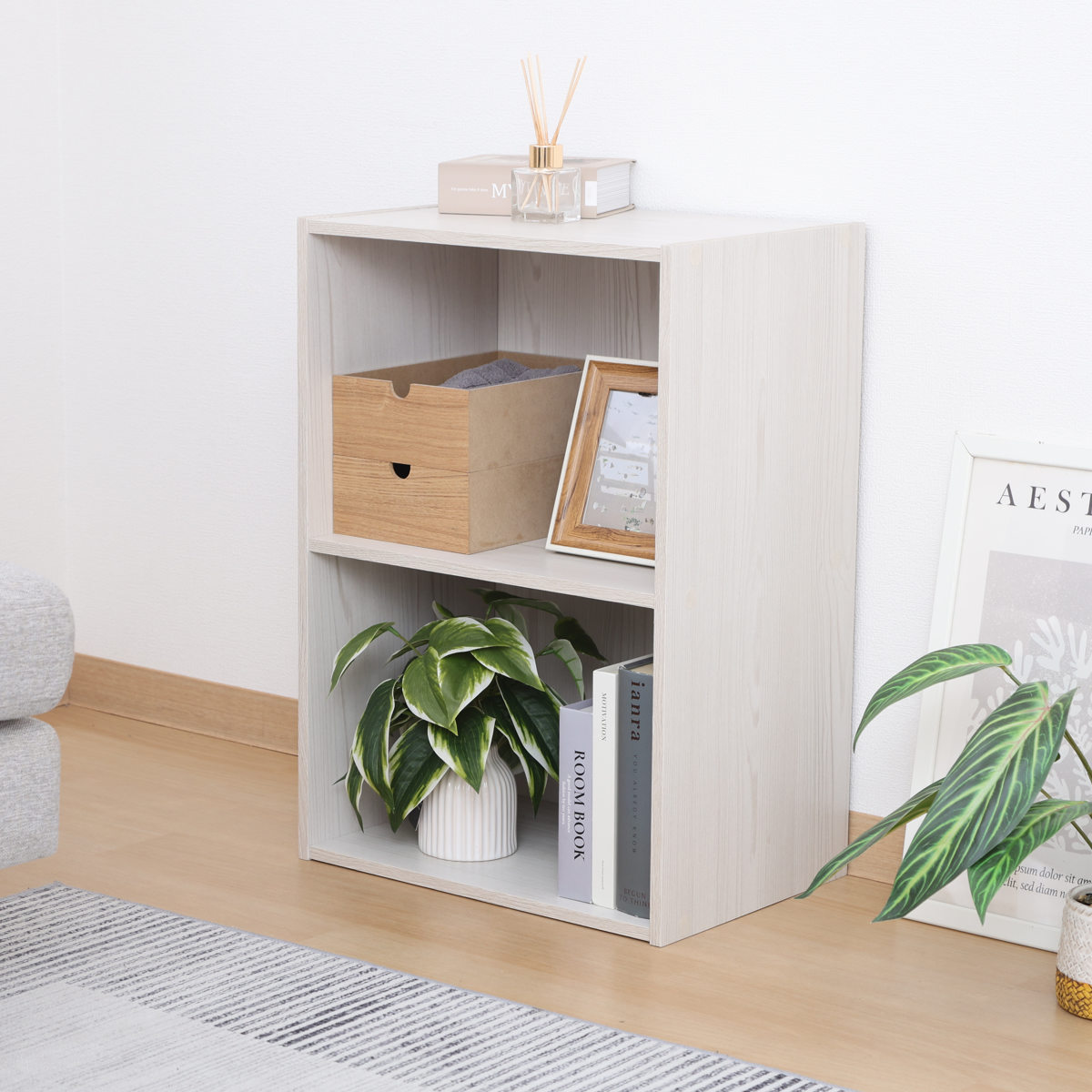 無駄のないシンプルなデザインで、使い勝手のよい2段タイプのカラーボックスです。、リビングや書斎、子ども部屋などさまざまな空間に自然になじみます。本やCDをまとめて収納したり、ディスプレイラックのように、飾りながら収納するのもおすすめです。
