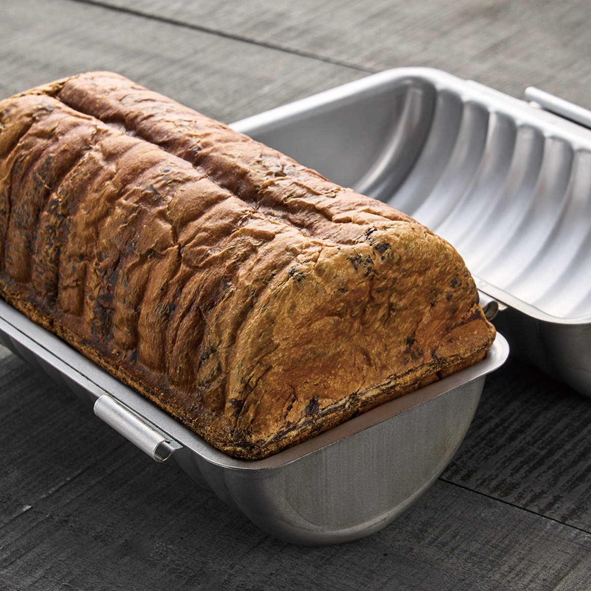 波型フォルムが特徴の、合わせタイプのパン焼き型です。焼き上がりの側面に美しいウェーブ形状がつき、切り口まで表情のある仕上がりになります。