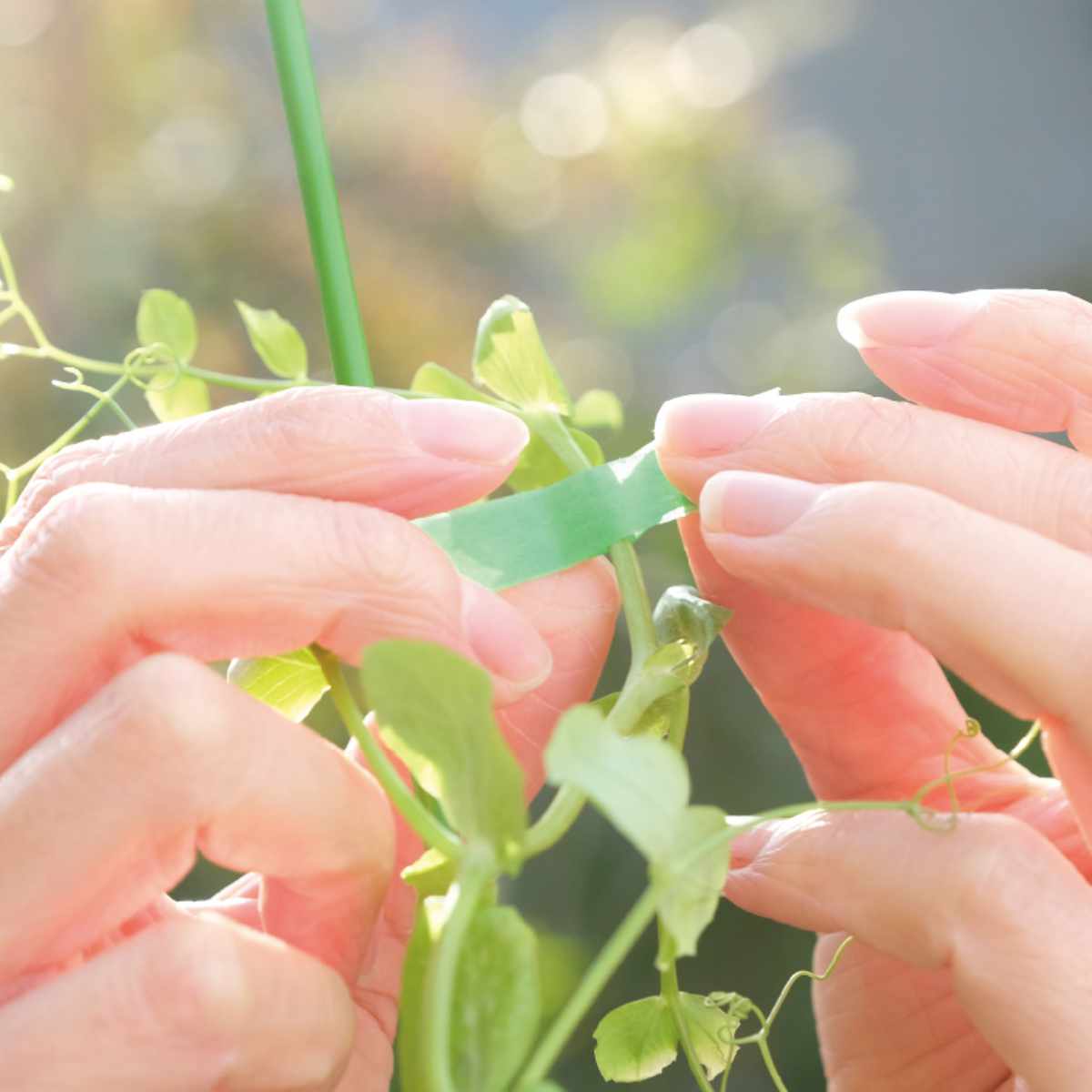 野菜や花の苗木を支え棒と一緒に巻いて留める誘引テープです。苗木やツルをやさしく固定できるので成長を妨げにくく、日々のガーデニングに役立ちます。
