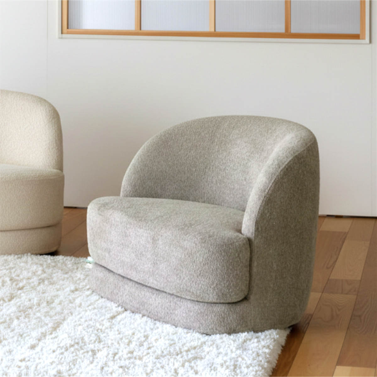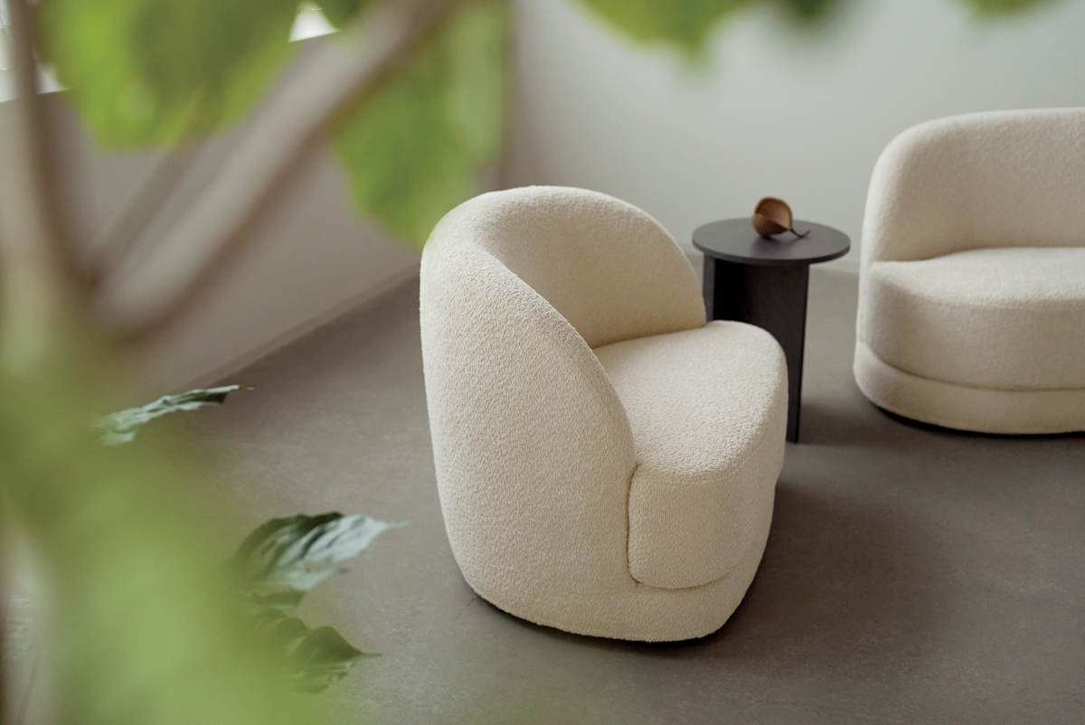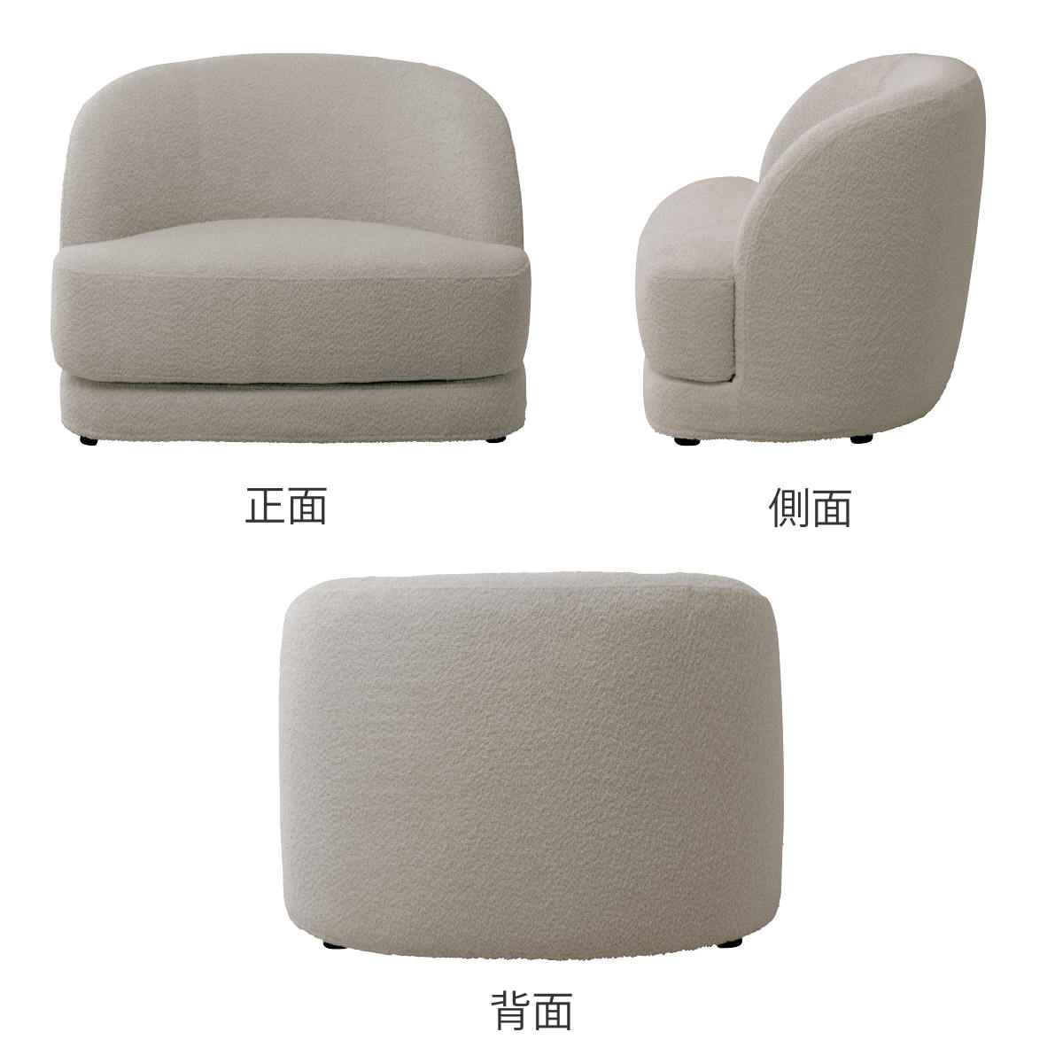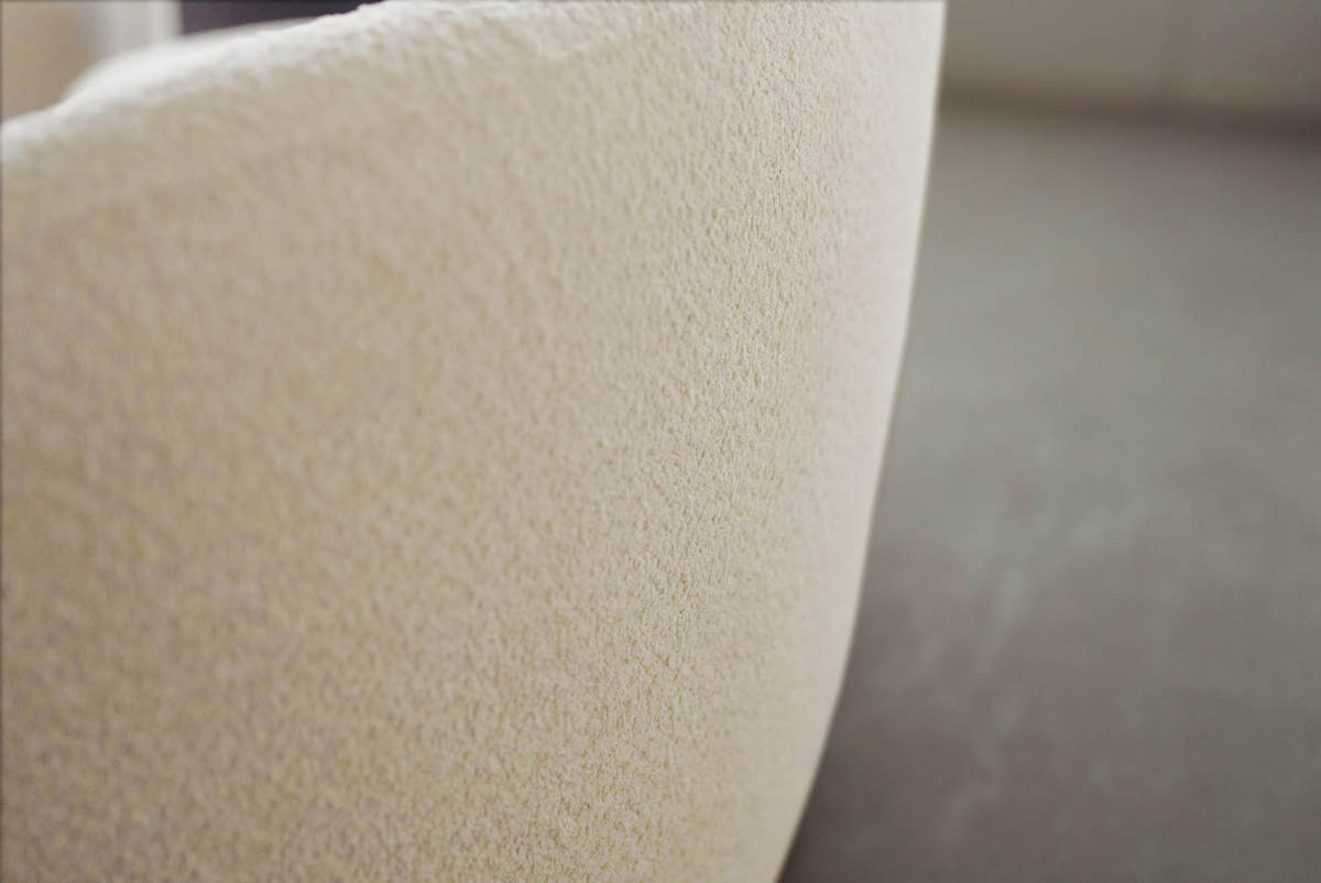 小さなループ状の糸を編んで作られるブークレ調生地。独特のふんわりとした質感が、曲線のフォルムを際立たせます。モダンなデザインでありながら、起毛によって柔らかな印象も与えます。背面まで贅沢に使用し、どこから見ても美しい仕上がりです。