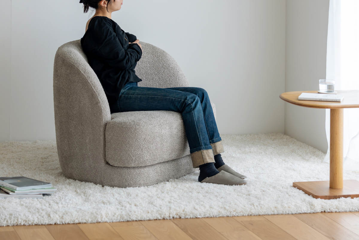 立体感のあるブークレ調の生地と、特長的な曲線が心地よい空間をつくるソファです。ゆったりと贅沢に座れるサイズ感で、毎日の豊かな暮らしに寄り添います。適度な硬さのウレタンクッションを使用し、長時間座っても疲れにくく快適です。