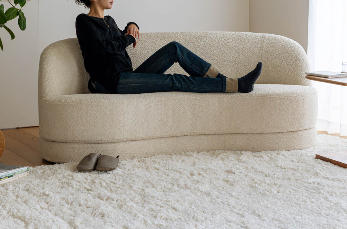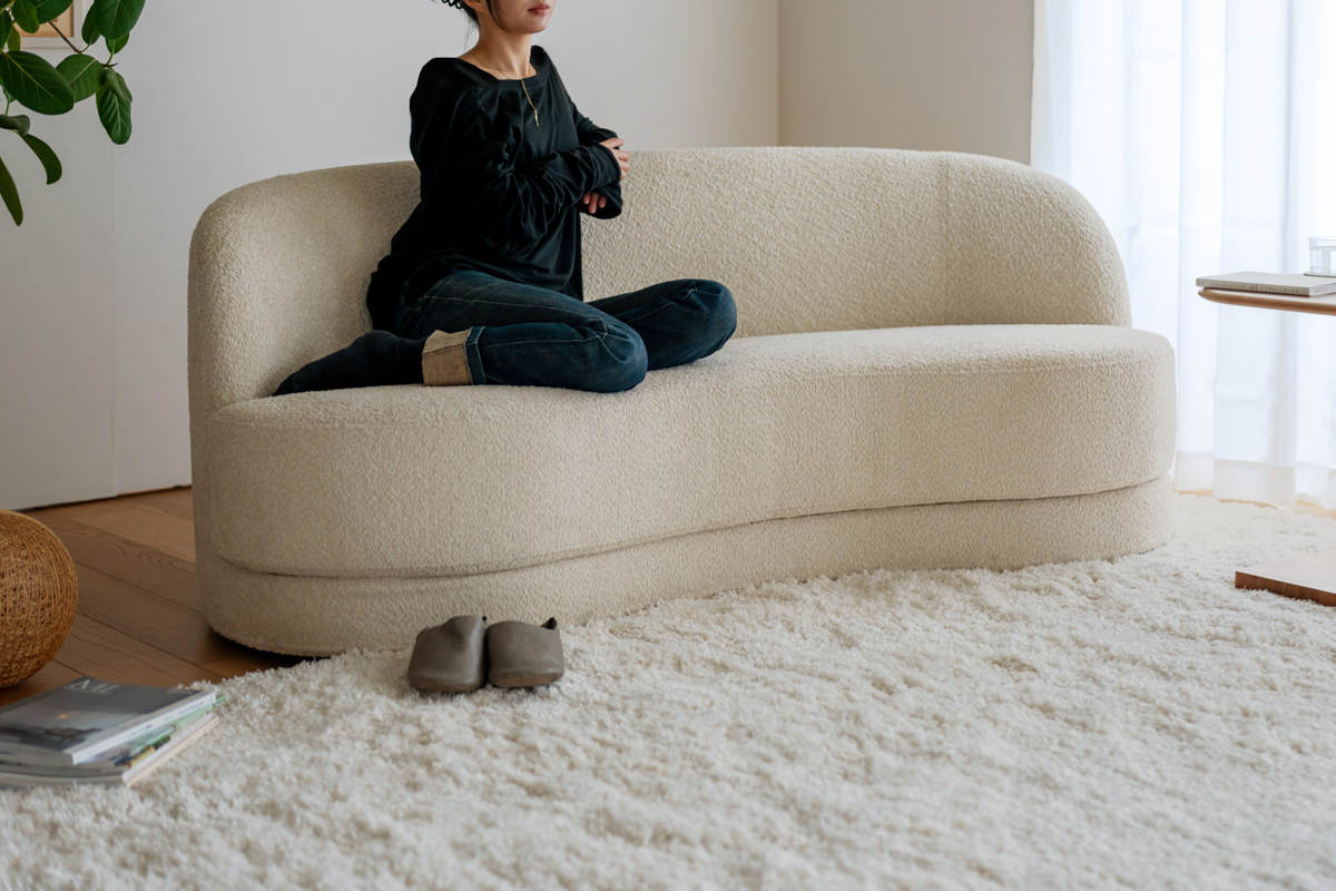 立体感のあるブークレ調の生地と、特長的な曲線が心地よい空間をつくるソファです。ゆったりと贅沢に座れるサイズ感で、毎日の豊かな暮らしに寄り添います。適度な硬さのウレタンクッションを使用し、長時間座っても疲れにくく快適です。