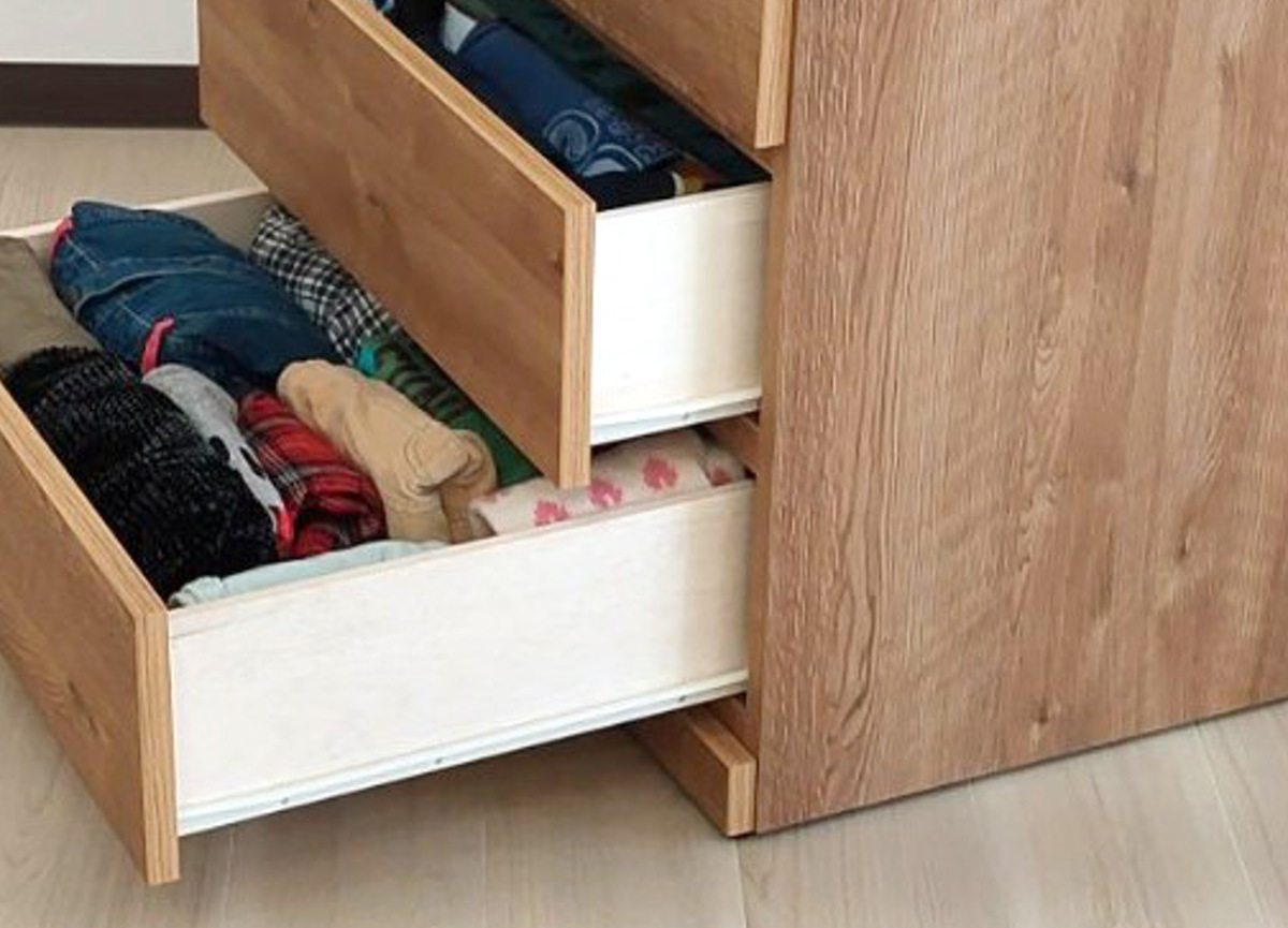 あえて取っ手を付けずにシンプルに仕上げました。引出しは全段スライドレール仕様で、たっぷり収納しても開閉がスムーズです。万が一引き出しすぎてしまっても抜け落ちにくいストッパー付きで安心。引出し下部に手を掛けて開閉してください。