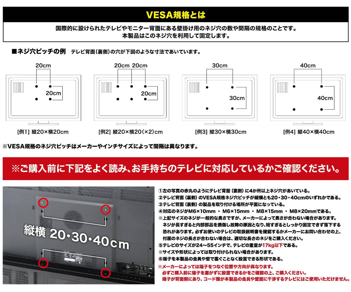 | 対応サイズ | 取り付け可能なテレビ(VESA規格対応) サイズ:24~55インチ 重量:17kg以下 VESA規格ネジ穴ピッチ:縦横 20/30/40cm 背面が平らなテレビ ※テレビの形状や、ネジ穴の間隔など仕様によっては取り付けられない場合があります。 |