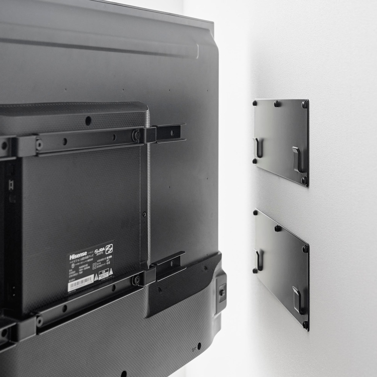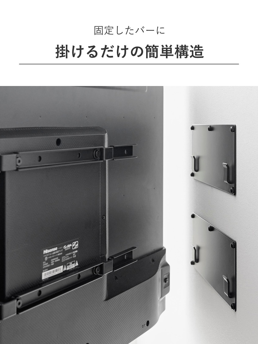 壁に2枚のプレートを取り付け、テレビ背面に固定したバーを掛けるだけの簡単構造です。耐震試験済みで安心してお使いいただけます。
