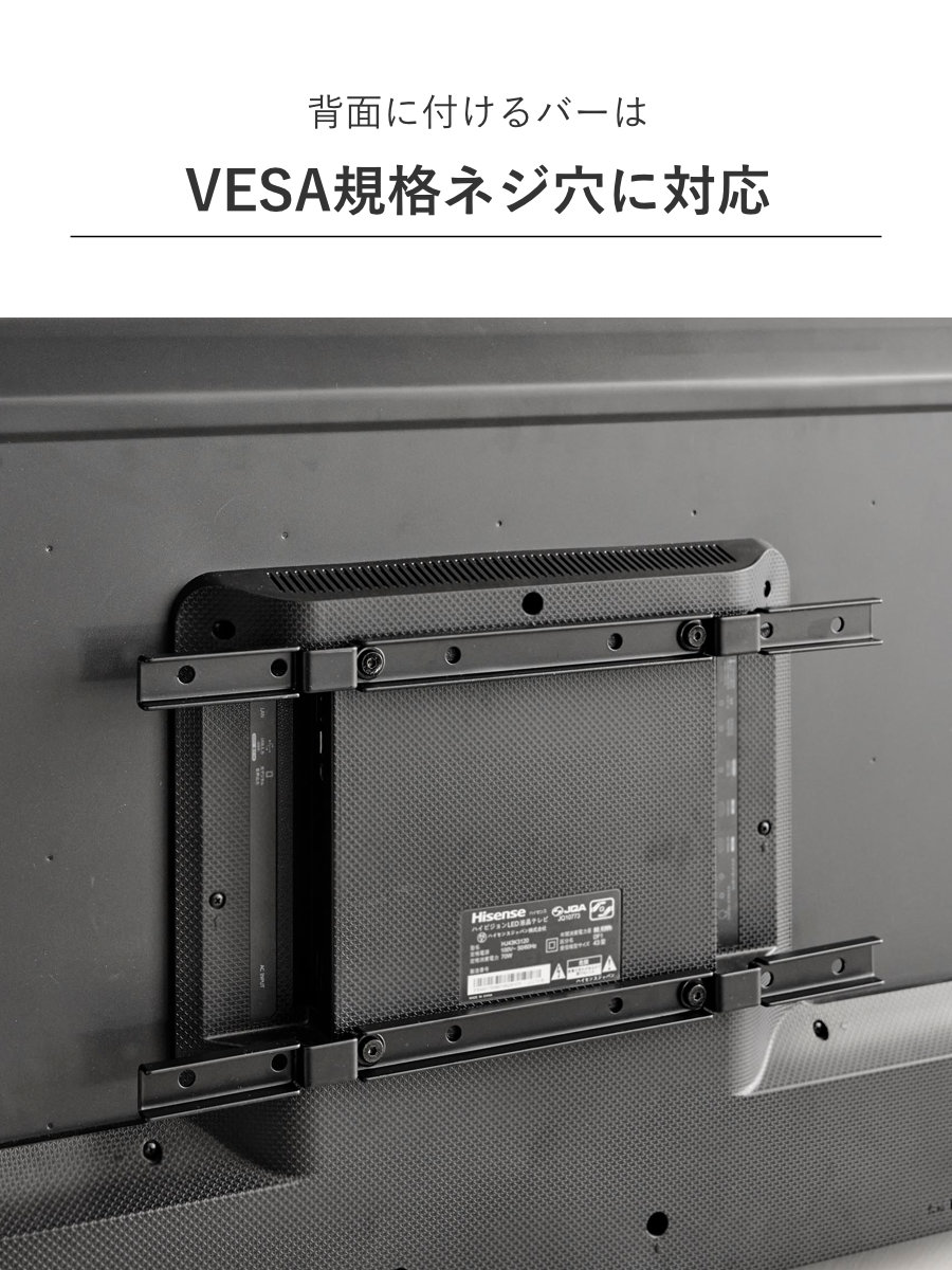 バーは、テレビ背面のVESA規格ネジ穴を利用して取り付けられます。24~55インチまでのテレビに対応しているので、リビングから寝室まで幅広い空間で使用できます。