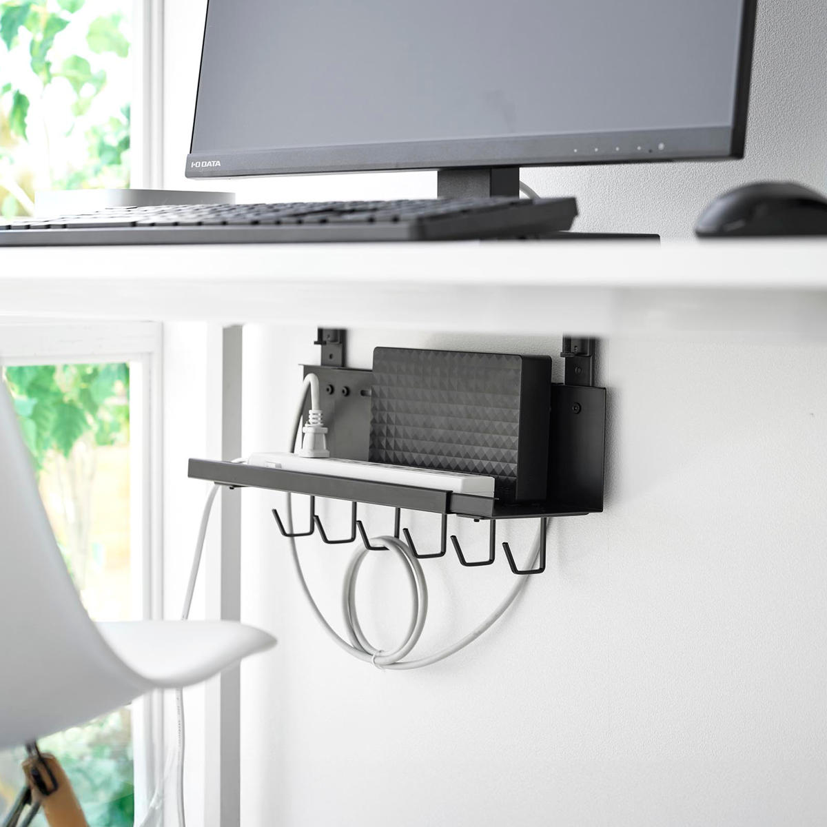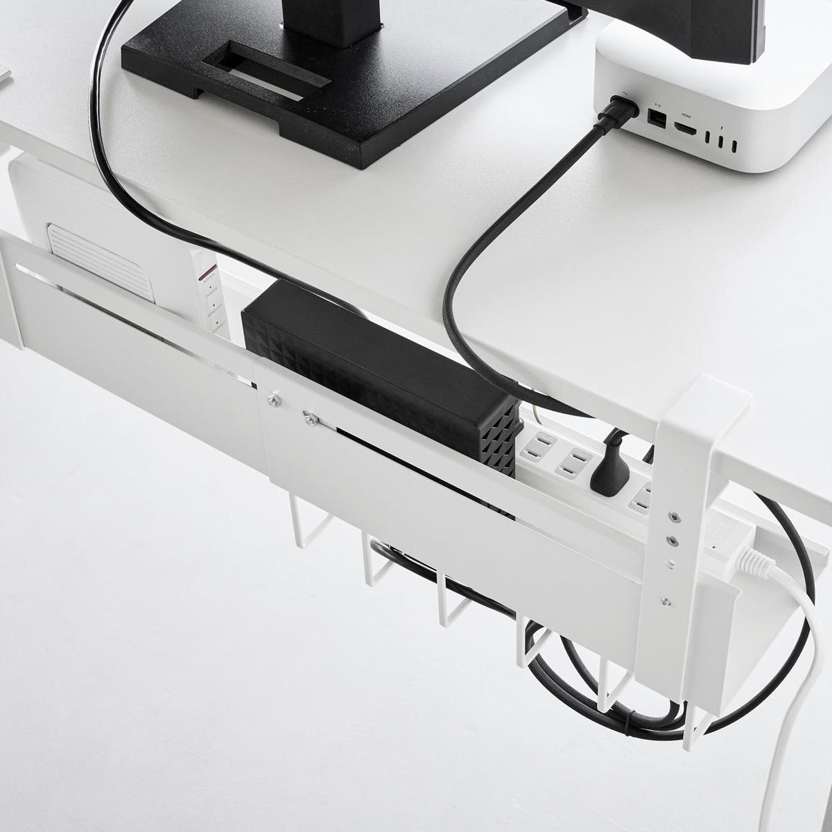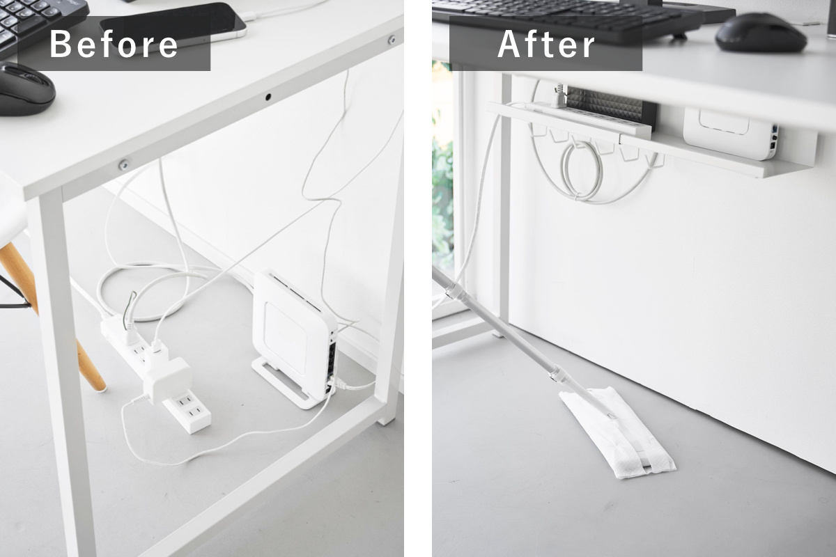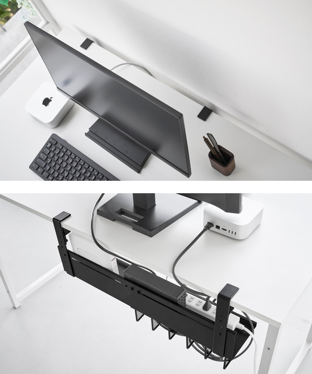 デスクの天板を挟み込むだけで簡単に設置できる、幅37~60cmに伸縮可能なデスク下収納トレーです。散らかりがちなケーブルやタップ類を浮かせて収納できるので、デスク下がスッキリ片付き、床掃除もラクラク。
