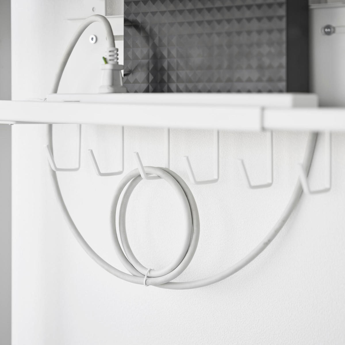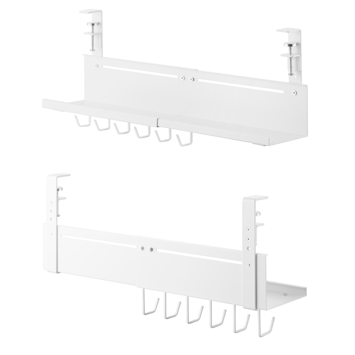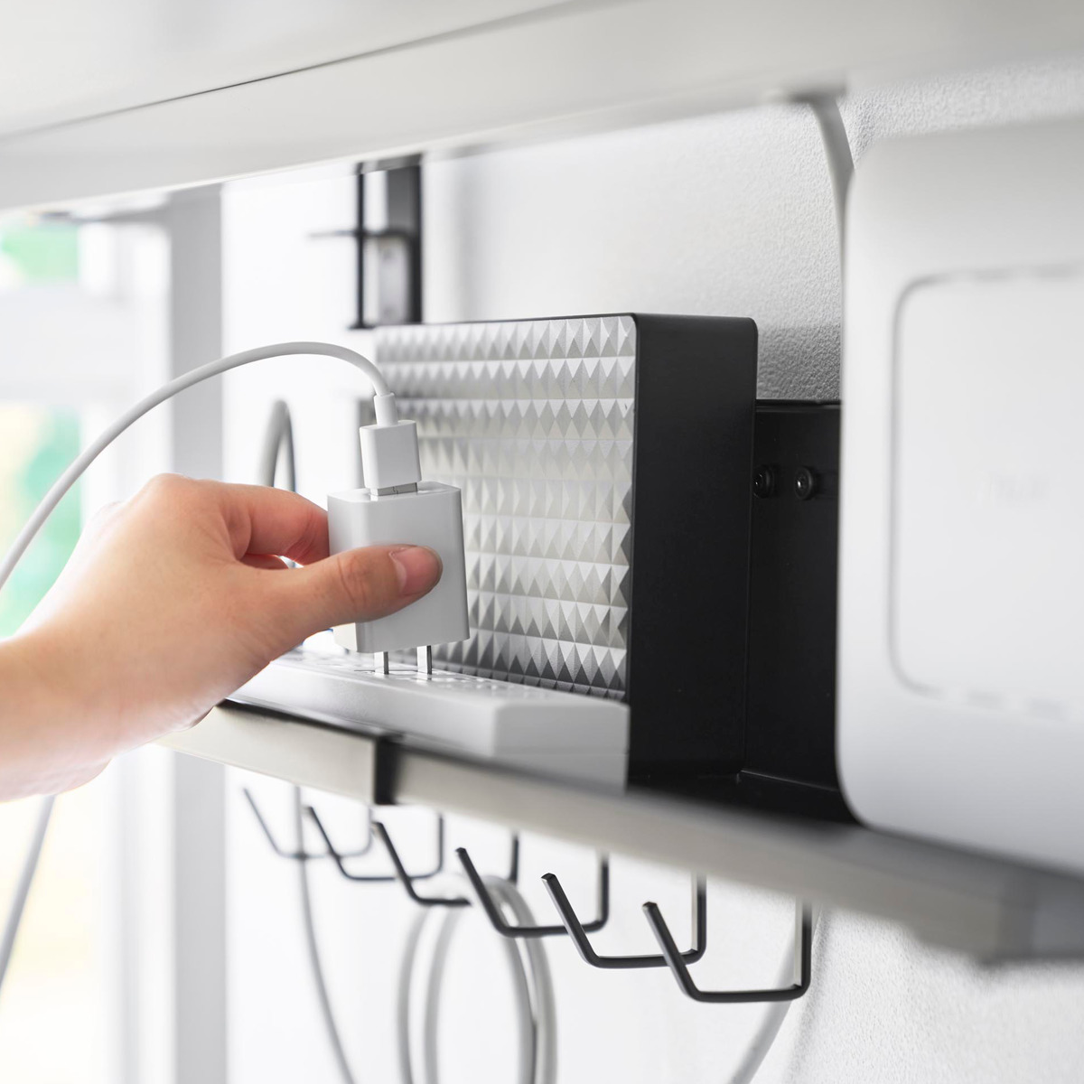 デスクの天板を挟み込むだけで簡単に設置できる、幅37~60cmに伸縮可能なデスク下収納トレーです。散らかりがちなケーブルやタップ類を浮かせて収納できるので、デスク下がスッキリ片付き、床掃除もラクラク。