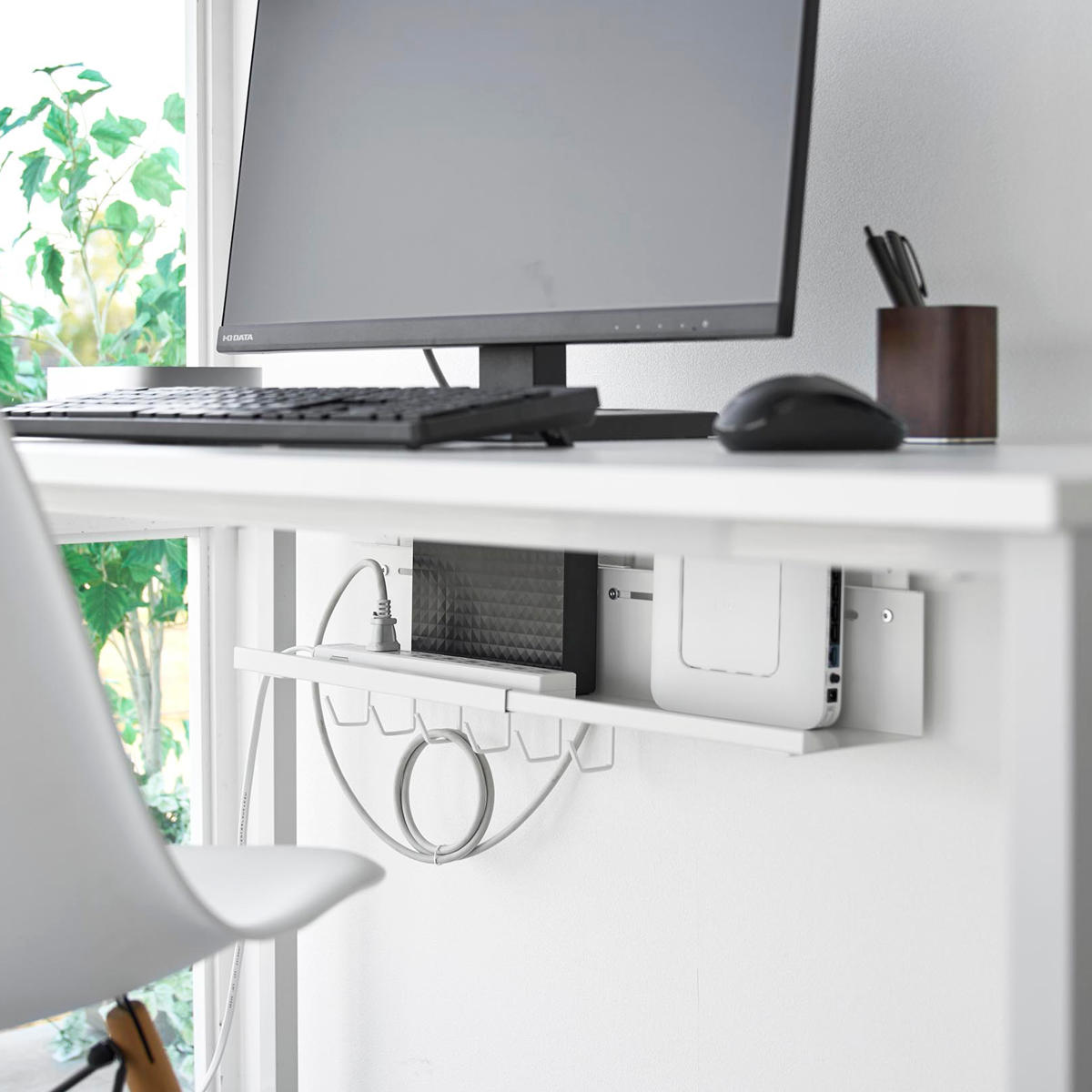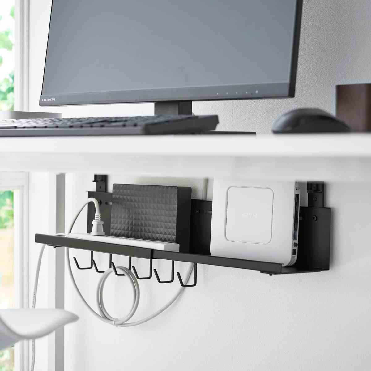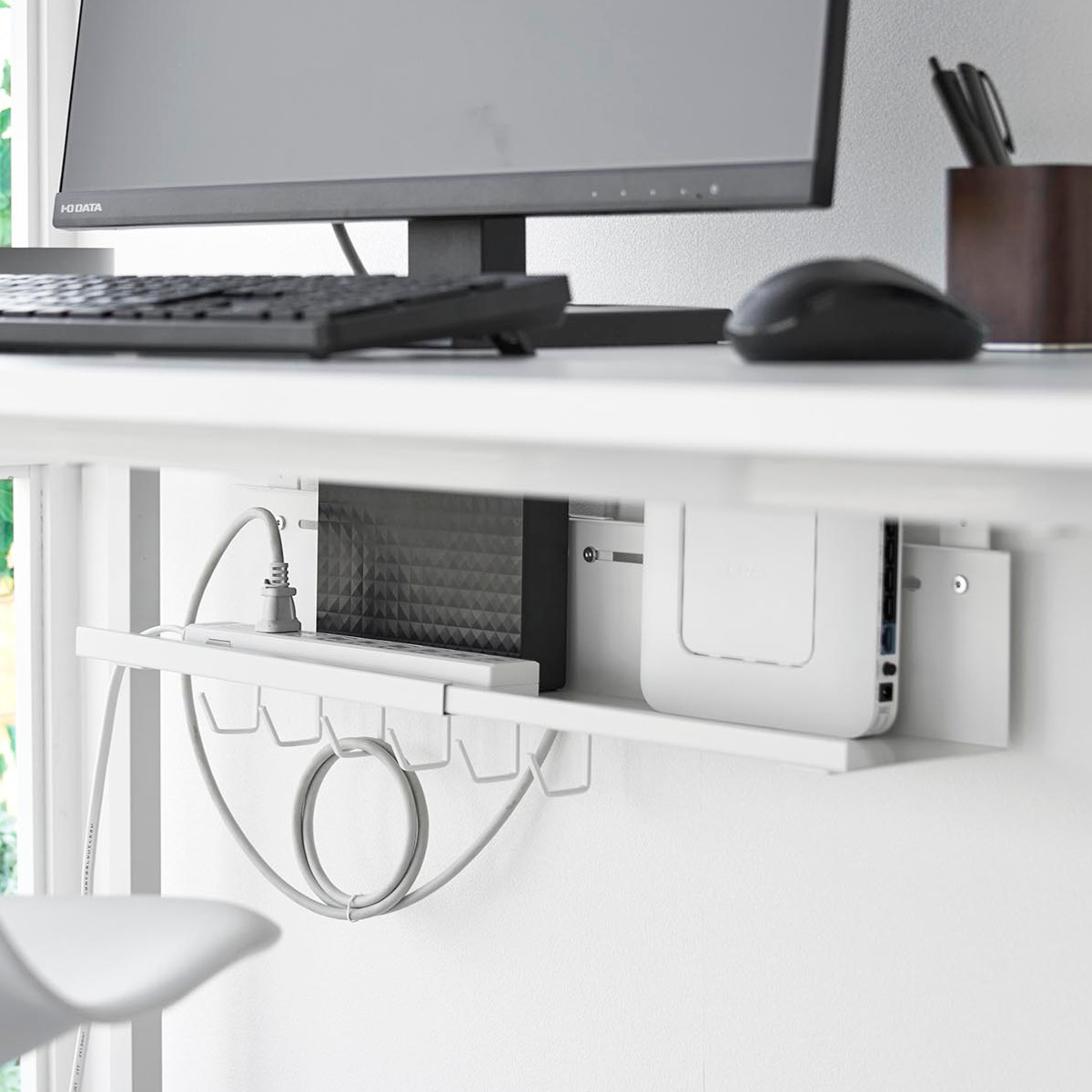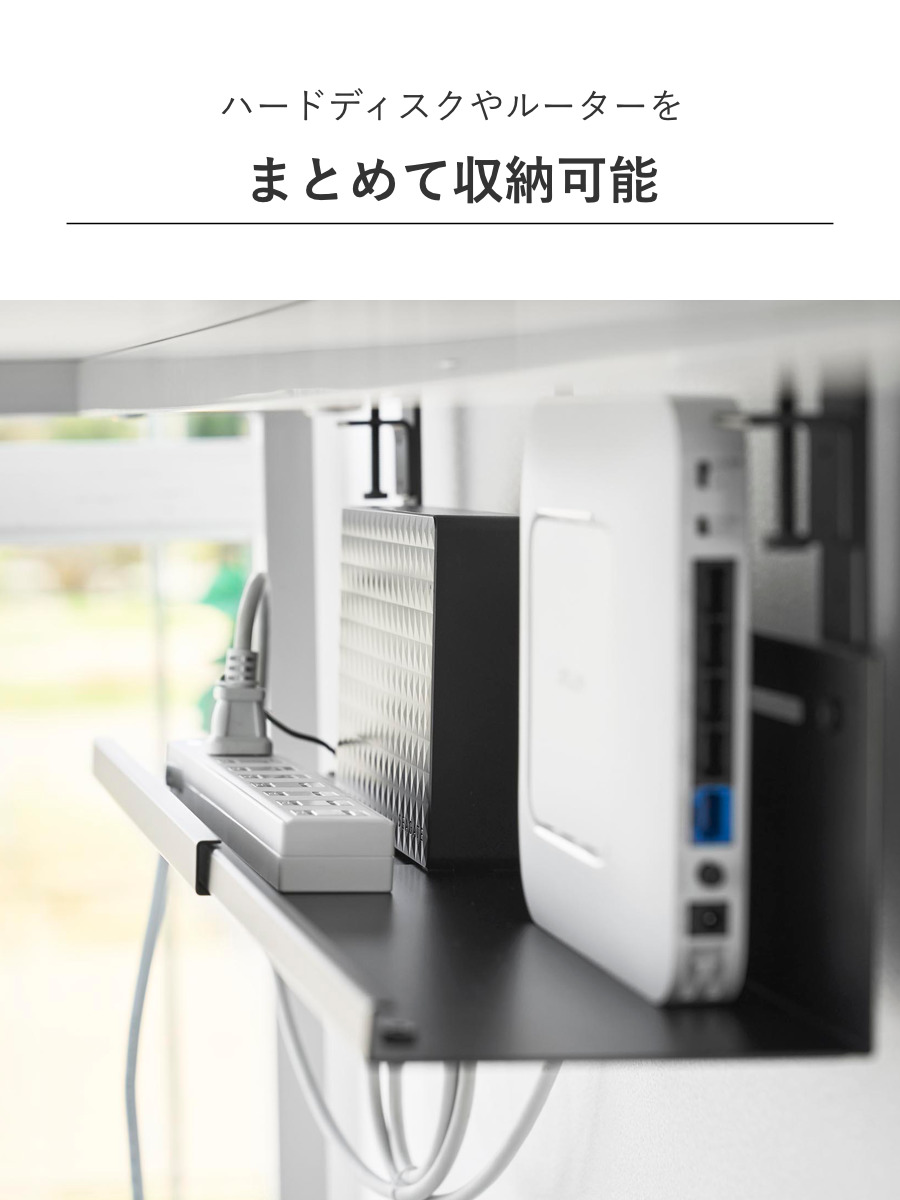 ハードディスクやルーターもまとめて収納することでデスクの上やデスク周りが広く使えます。デスクの天板と本体トレーの間にゆとりがあるため、本体設置後でもハードディスクやルーターのセッティングがスムーズに行えます。