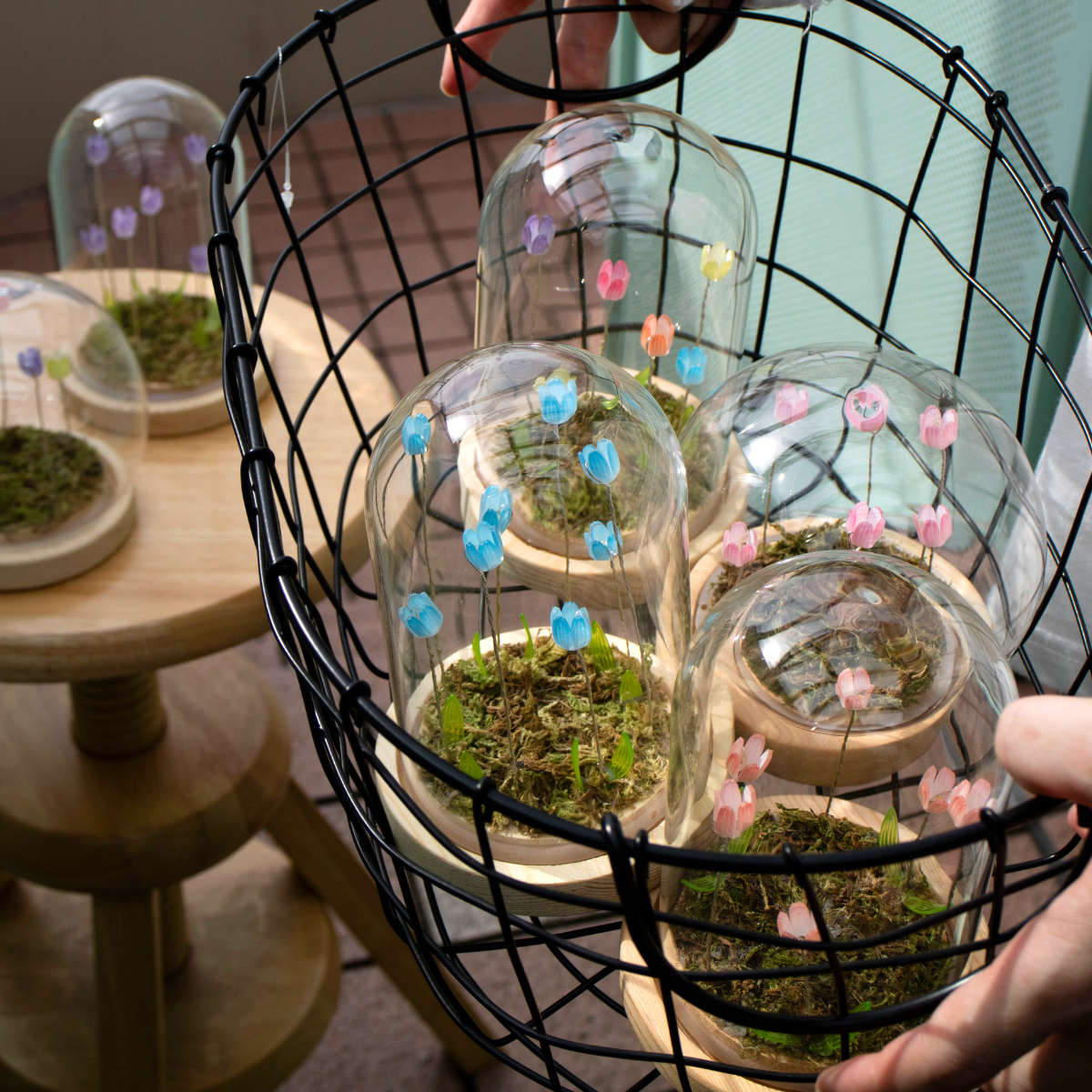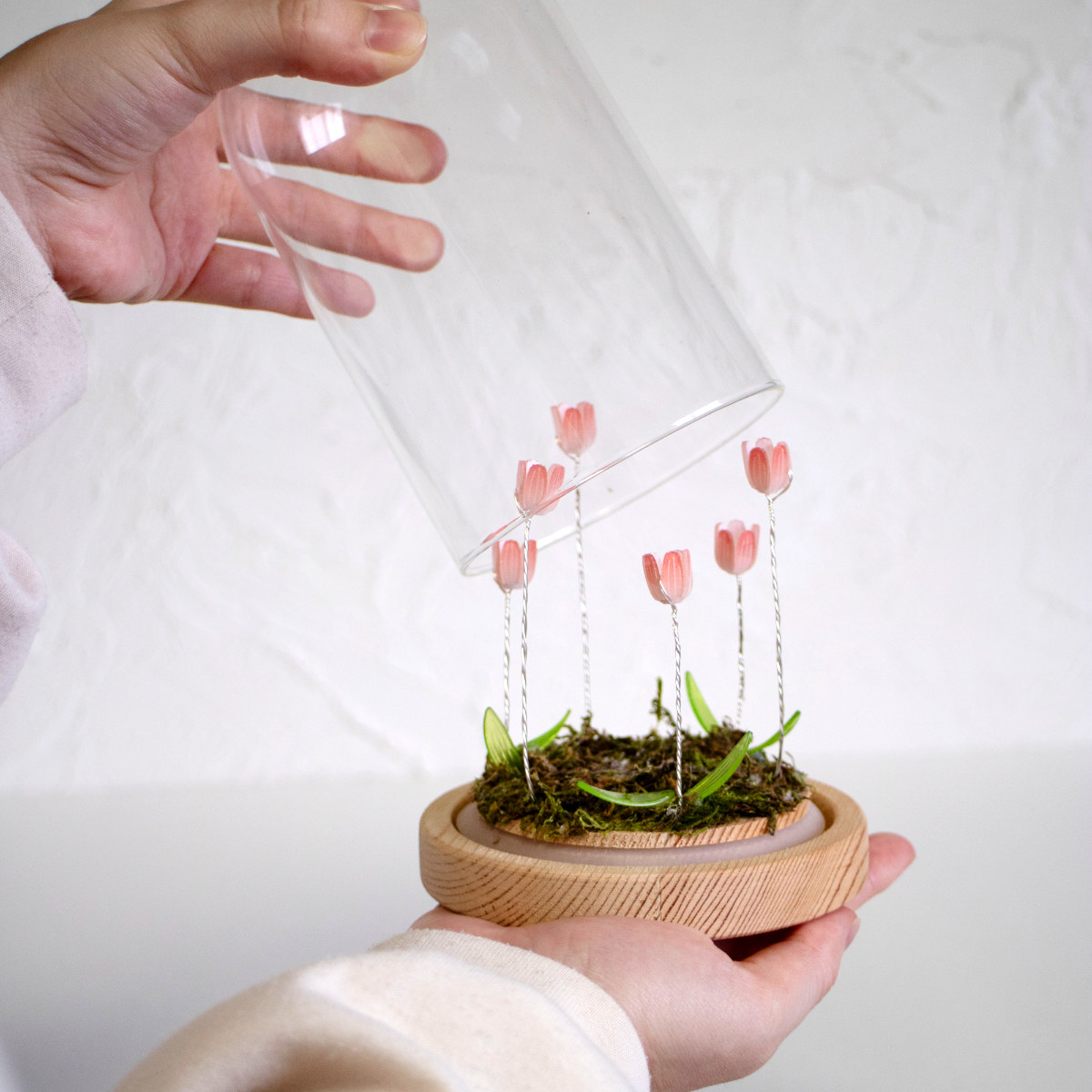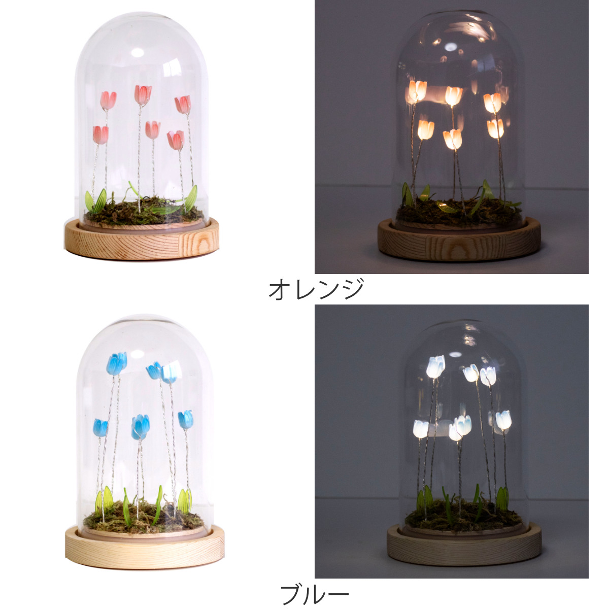 繊細なチューリップのフォルムが、やさしい光に包まれるLEDオブジェ。ガラスドームをかぶせることで、ほこりを防ぎながら上品で特別感のある雰囲気を演出します。