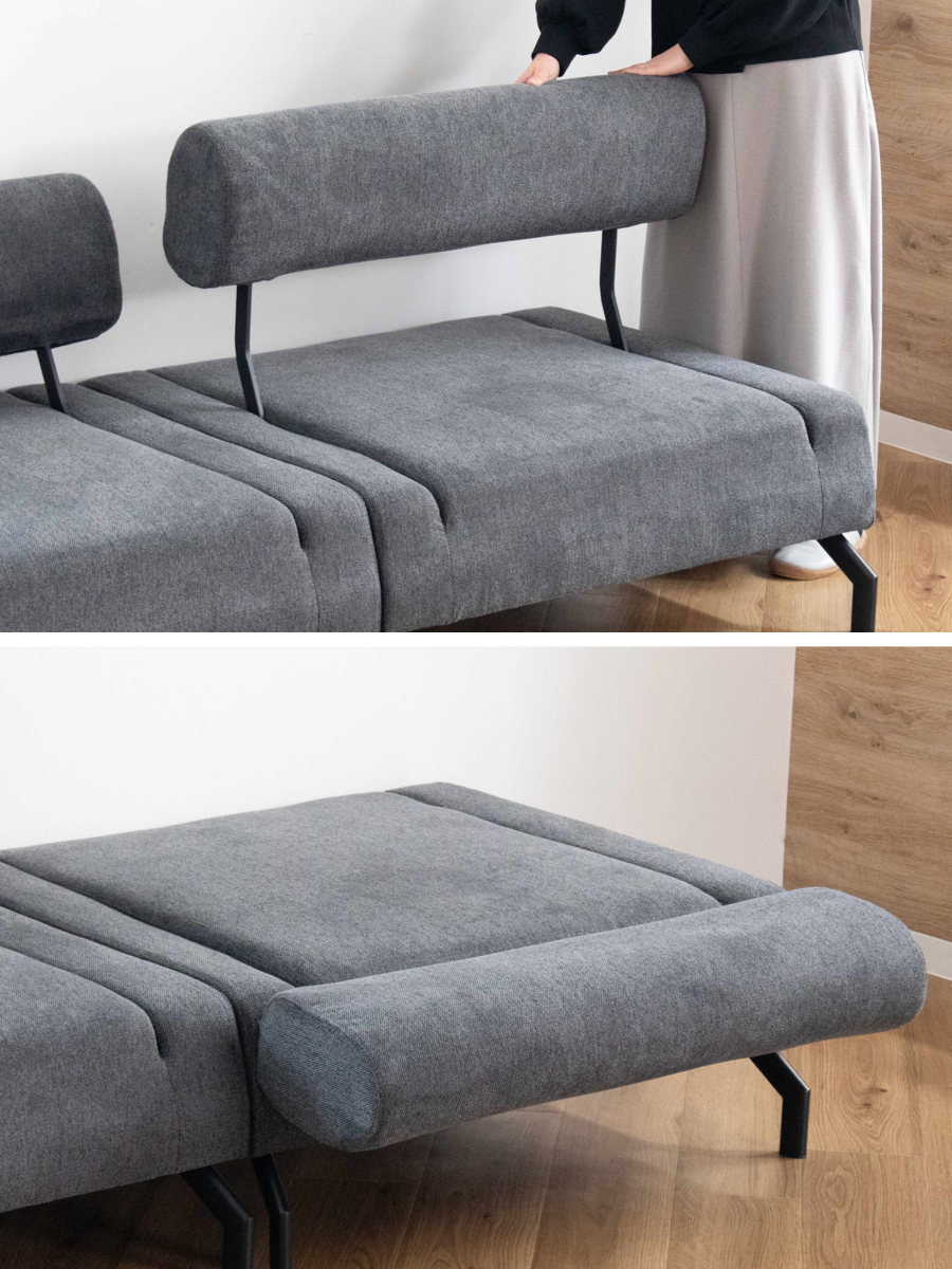 背もたれを倒すだけの簡単操作で、あっという間にベッドに早変わり。壁につけたまま使えるので、動かす手間なくスムーズに切り替えできます。