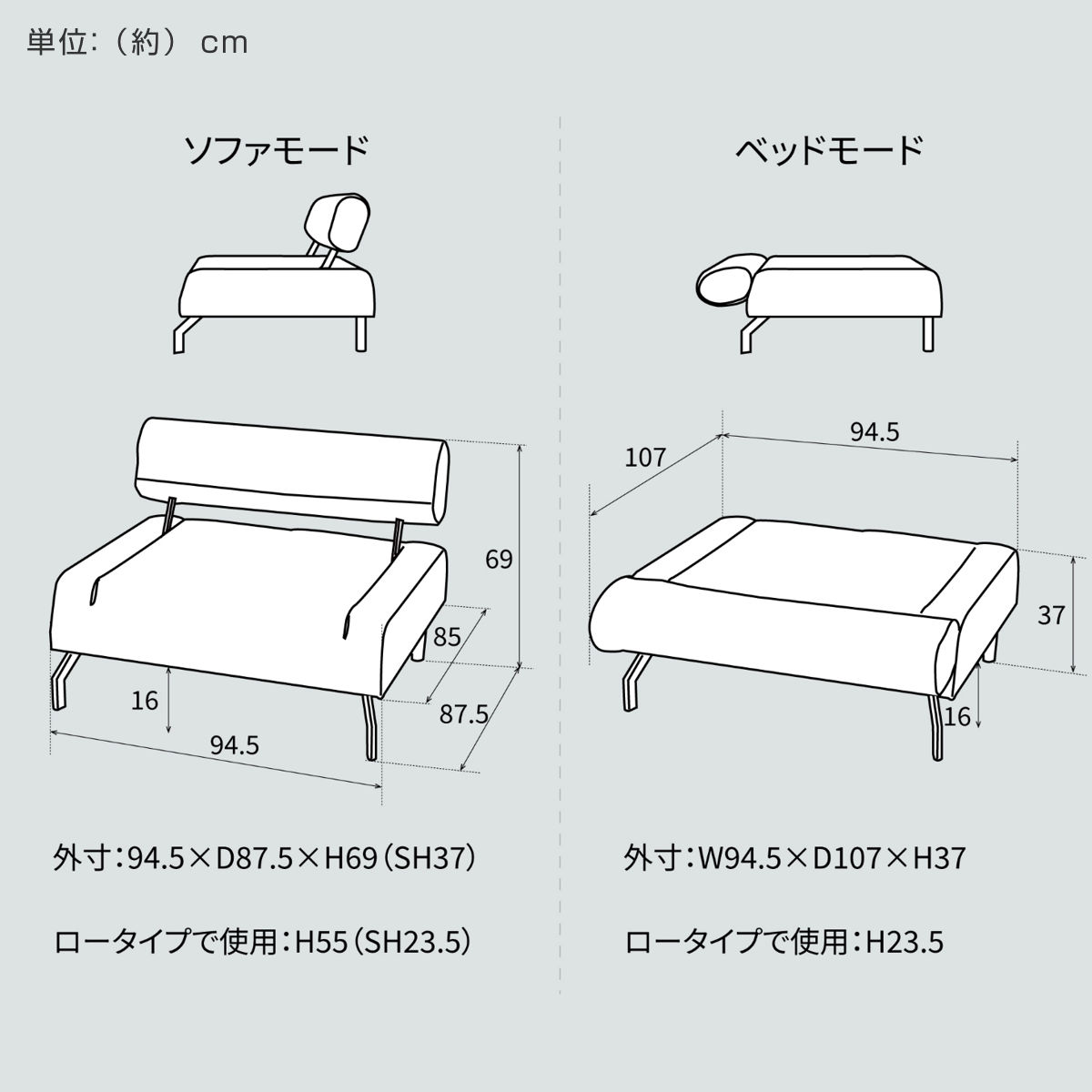 | サイズ | 内寸:約 幅189×奥行87.5×高さ69(cm) 座面高:約 37(cm) ソファ(1台あたり):約 幅94.5×奥行87.5×高さ69cm ベッド(1台あたり):約 幅94.5×奥行107×高さ37cm ロータイプ時 高さ:55cm 座面高:23.5cm |
