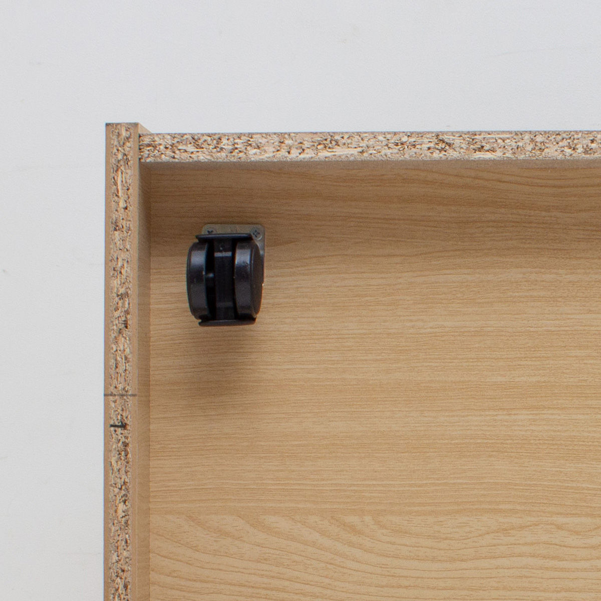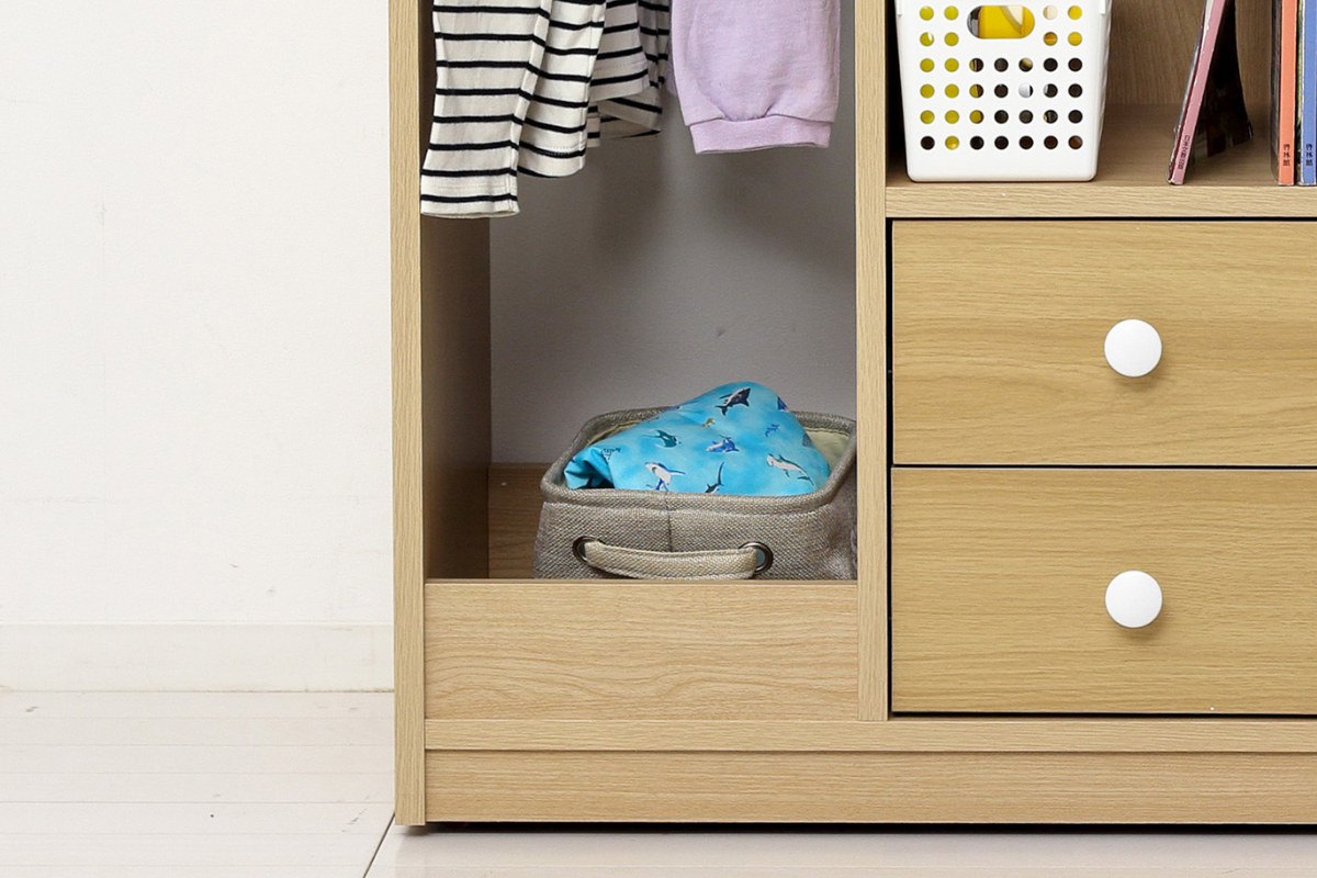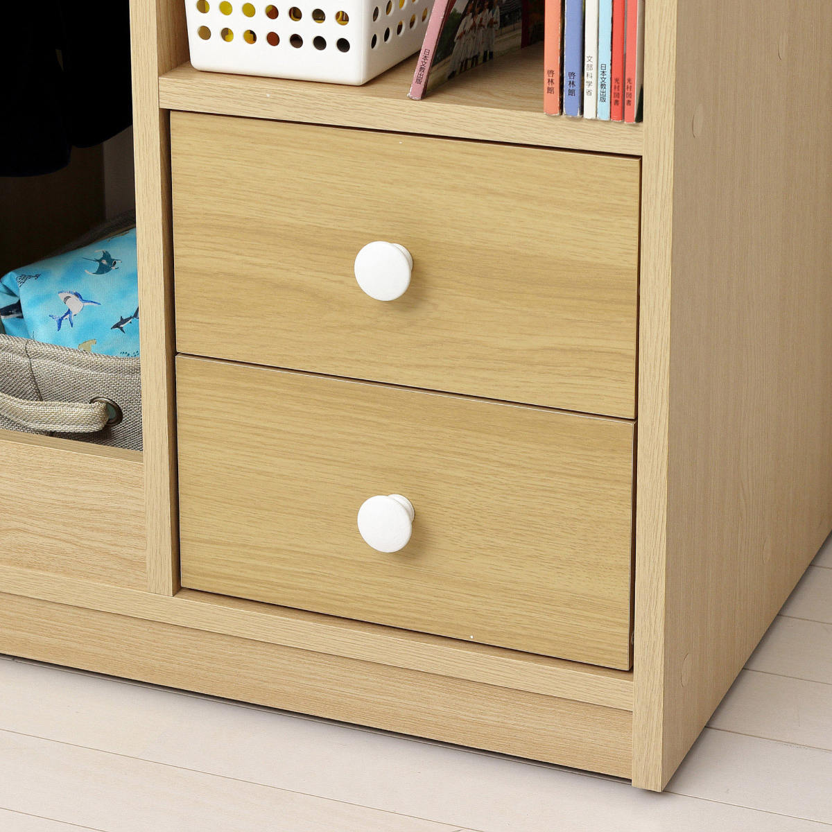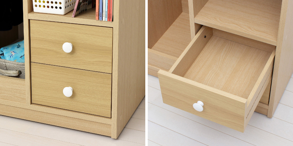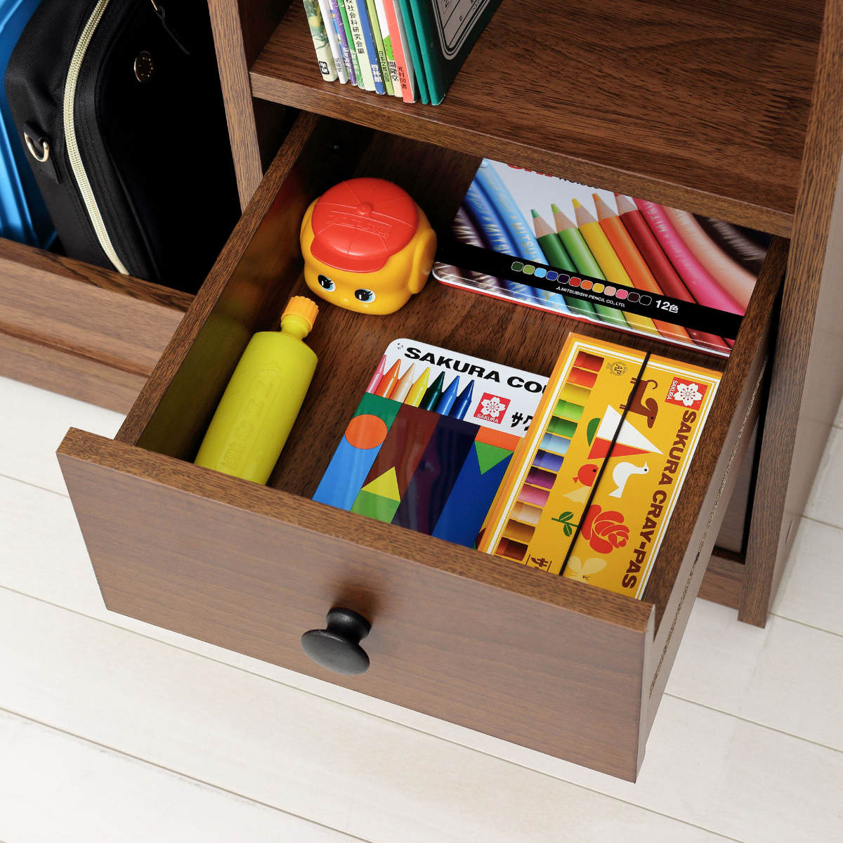 文具などのごちゃつきやすい小物類をすっきり収納できる引き出し付きです。抜け落ち防止のストッパーを備え、出し入れも安心です。コロンとした丸い取っ手でつかみやすく、子どもでも使いやすい設計です。