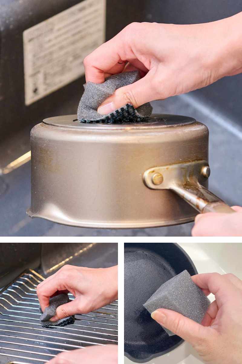 ●洗剤を使わずに、たわしでは落としにくい頑固な汚れもしっかり落とすスポンジです。