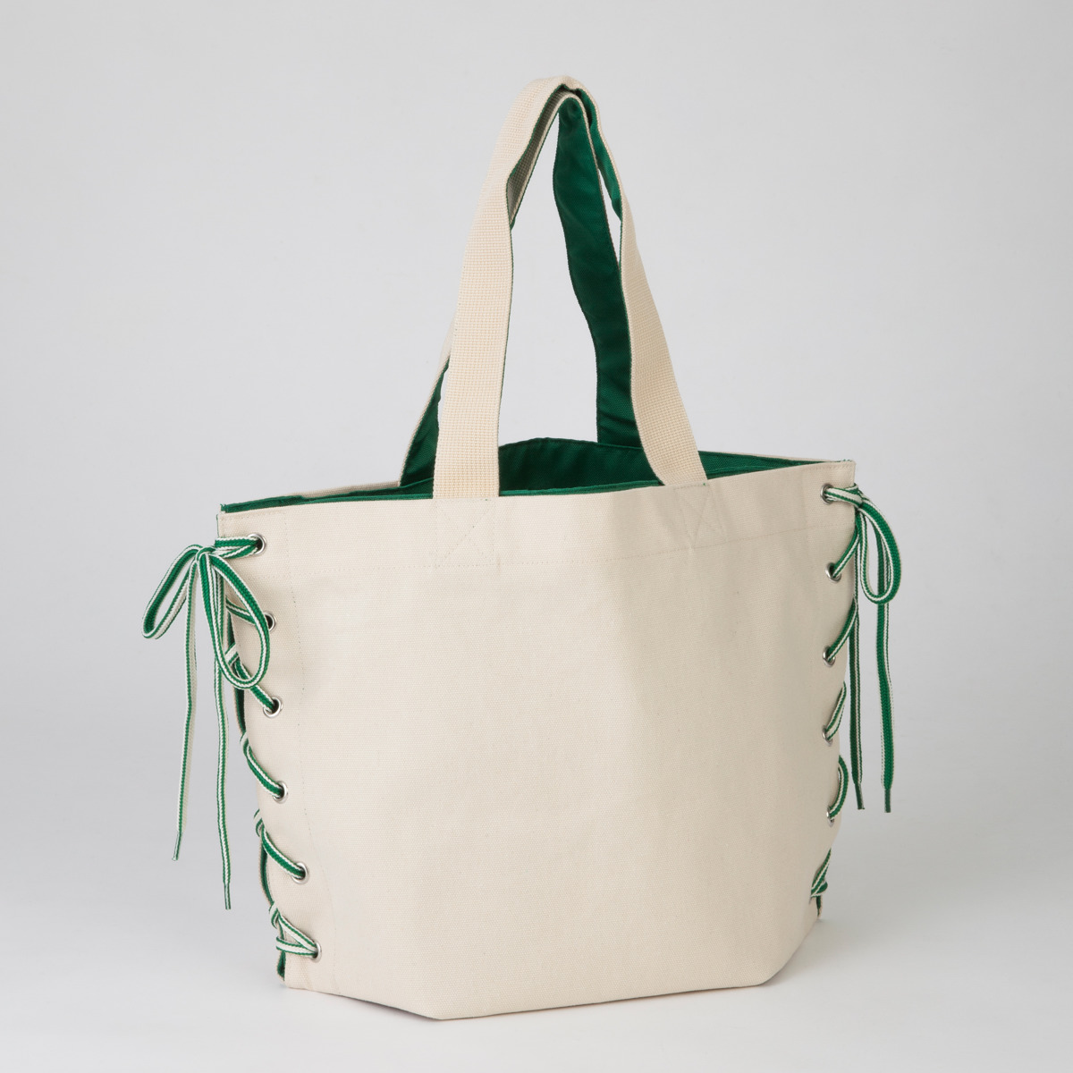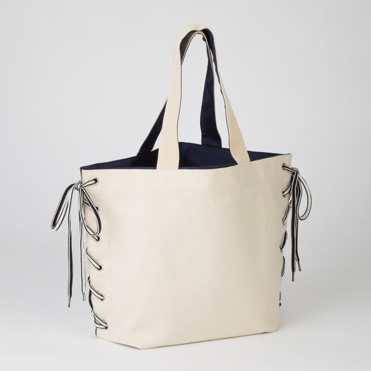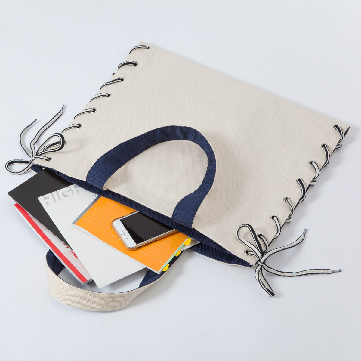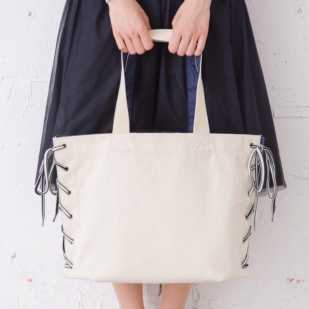 折り目を変えて紐を結ぶことで、形や大きさを変えられるトートバッグです。ちらりとのぞく裏地の色味がおしゃれな印象を与えます。