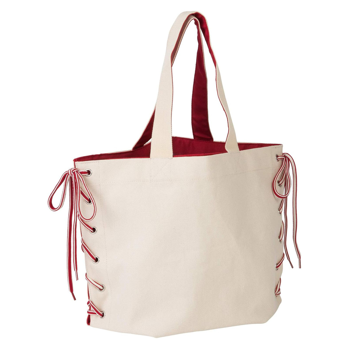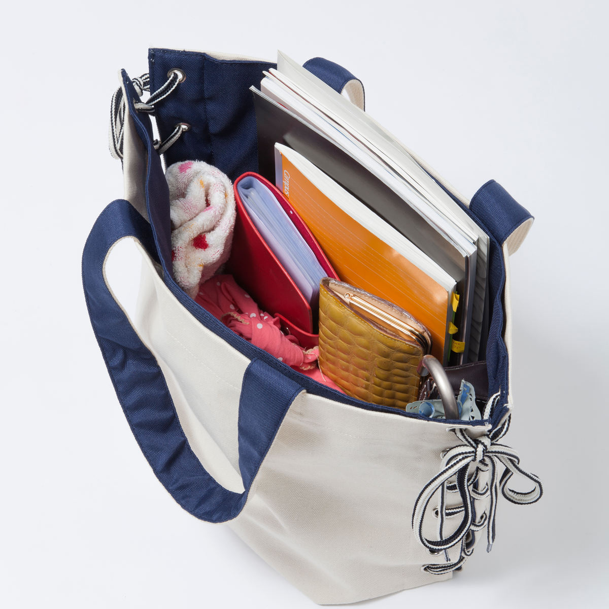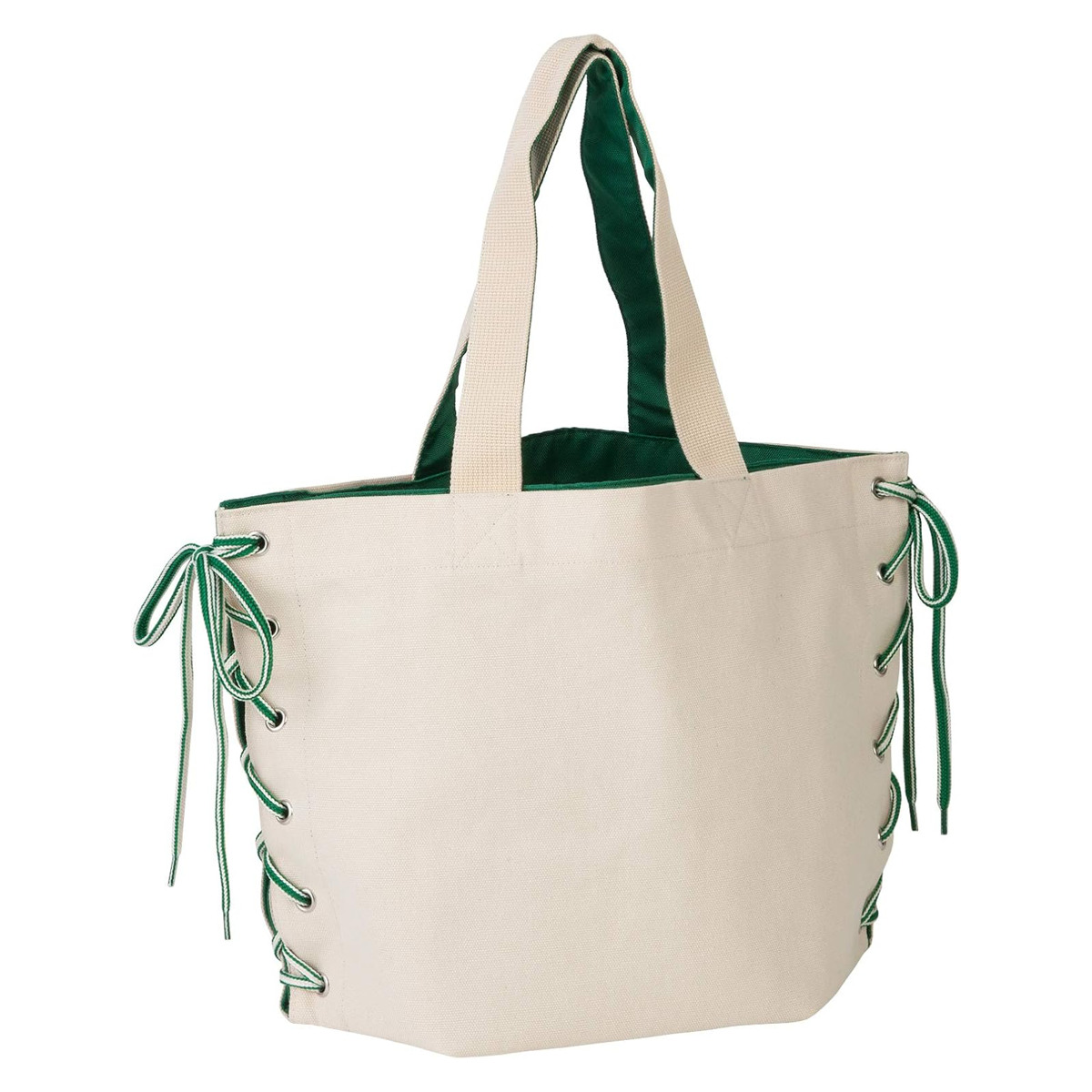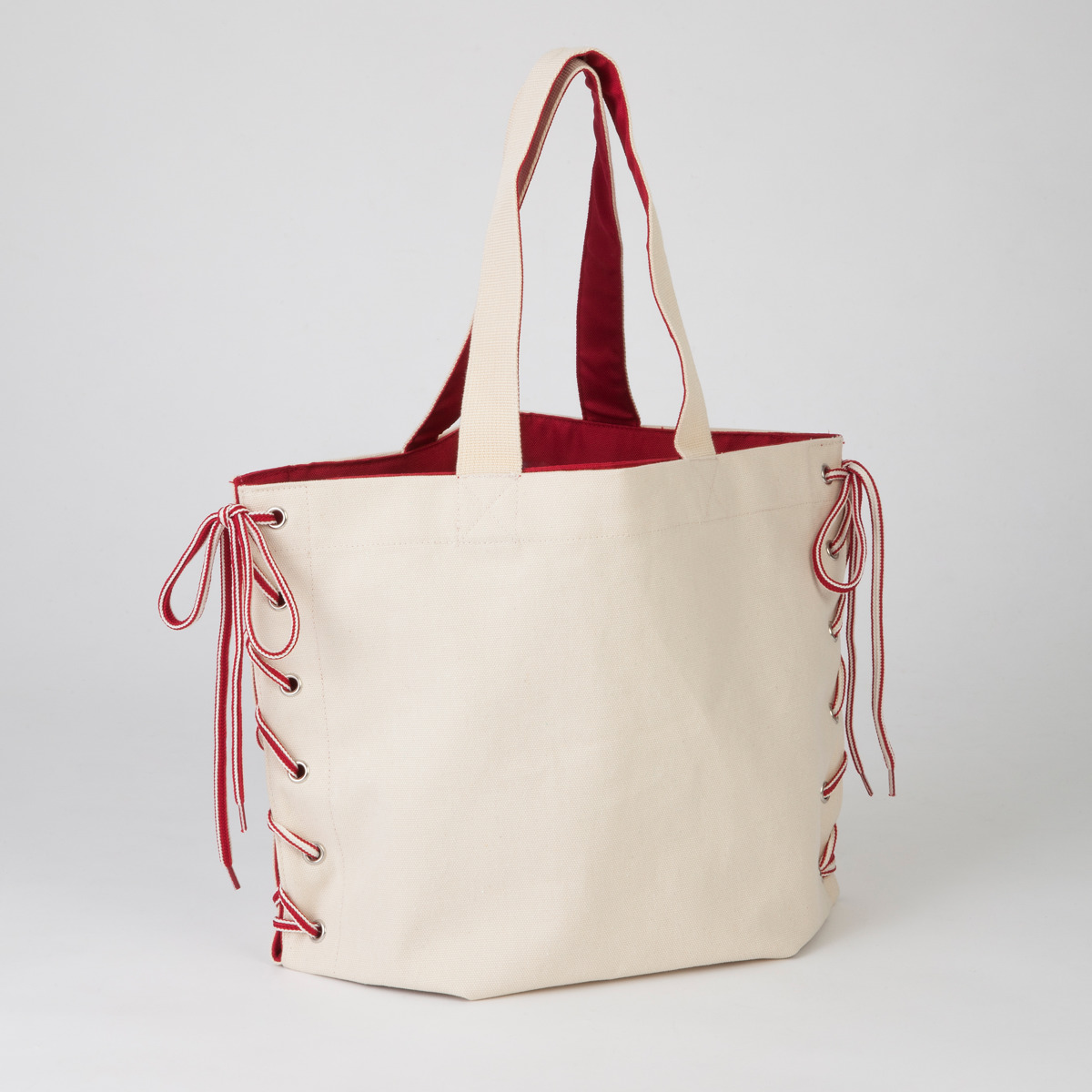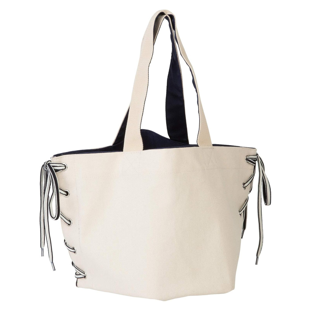 折り目を変えて紐を結ぶことで、形や大きさを変えられるトートバッグです。ちらりとのぞく裏地の色味がおしゃれな印象を与えます。