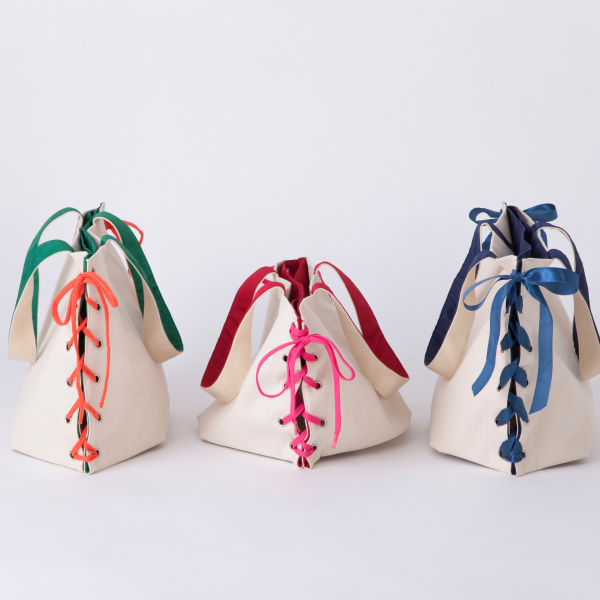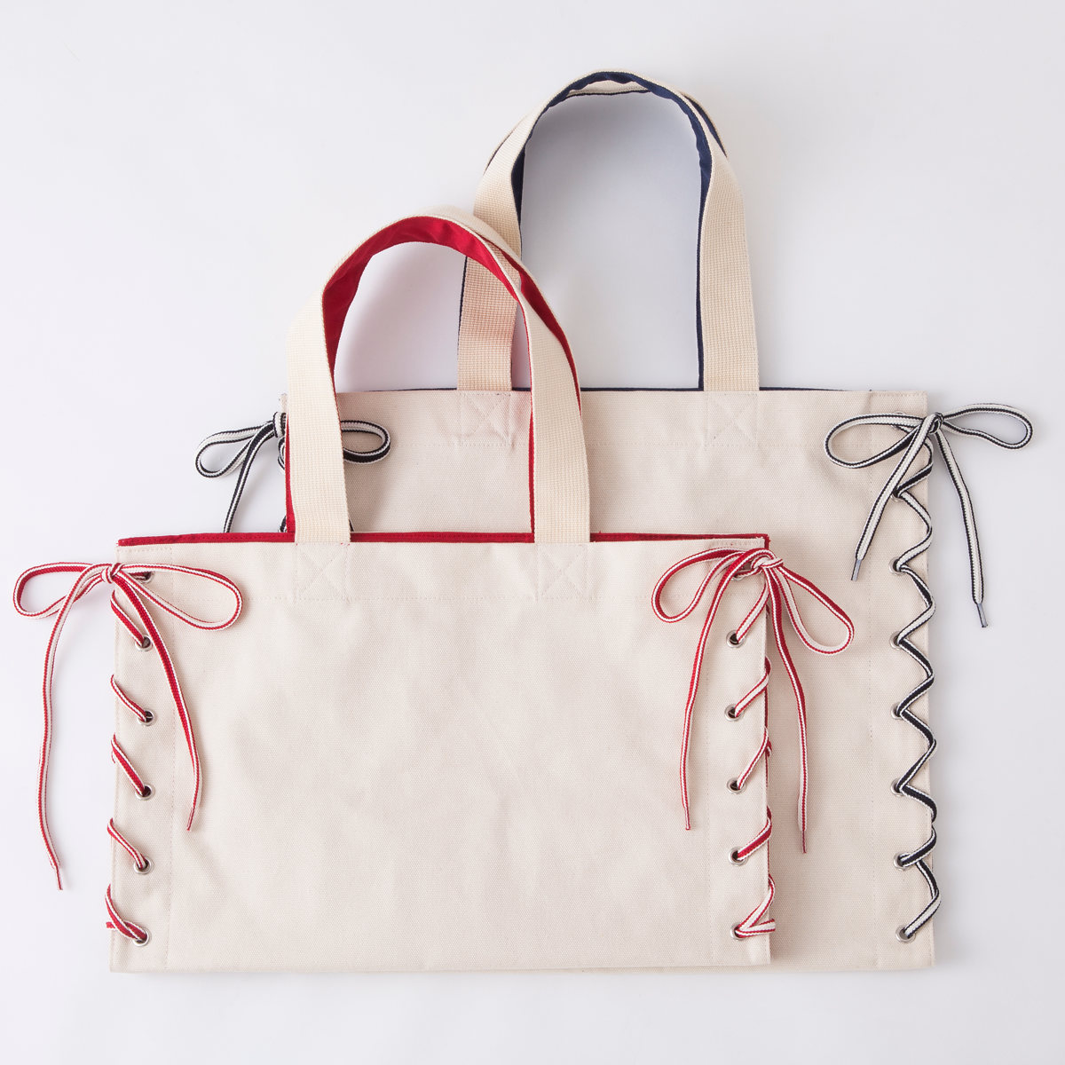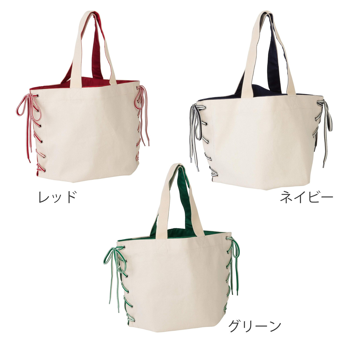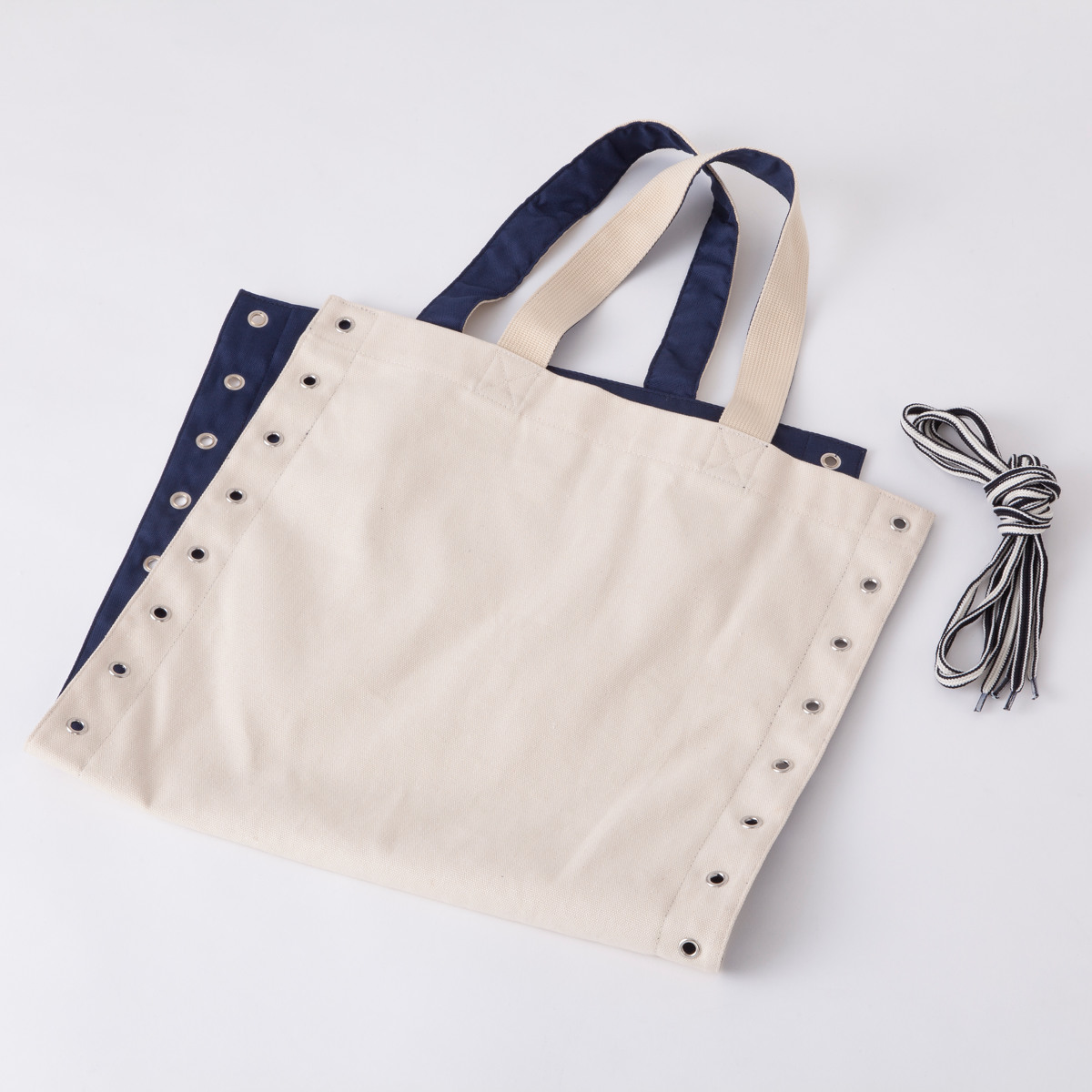 紐の通し方や色、素材を変えることでバッグの印象を変えられます。お好みの素材や通し方でアレンジをお楽しみいただけます。