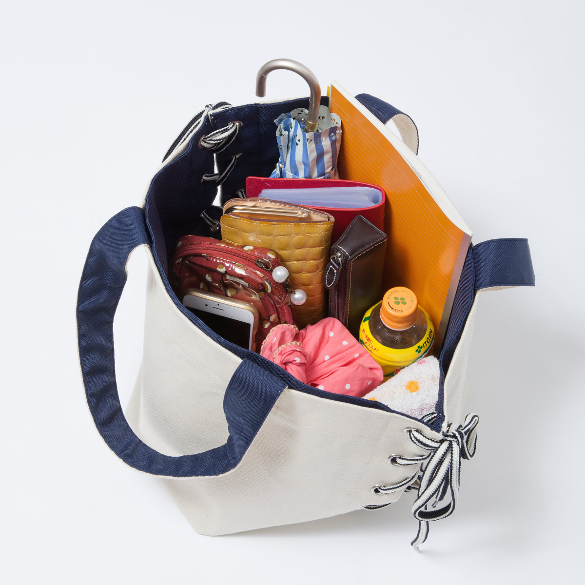 荷物の量が少なく、厚みが不要なときには二つ折りがおすすめです。マチ部分を大きく折ると、ランチバッグのように持つことができます。
