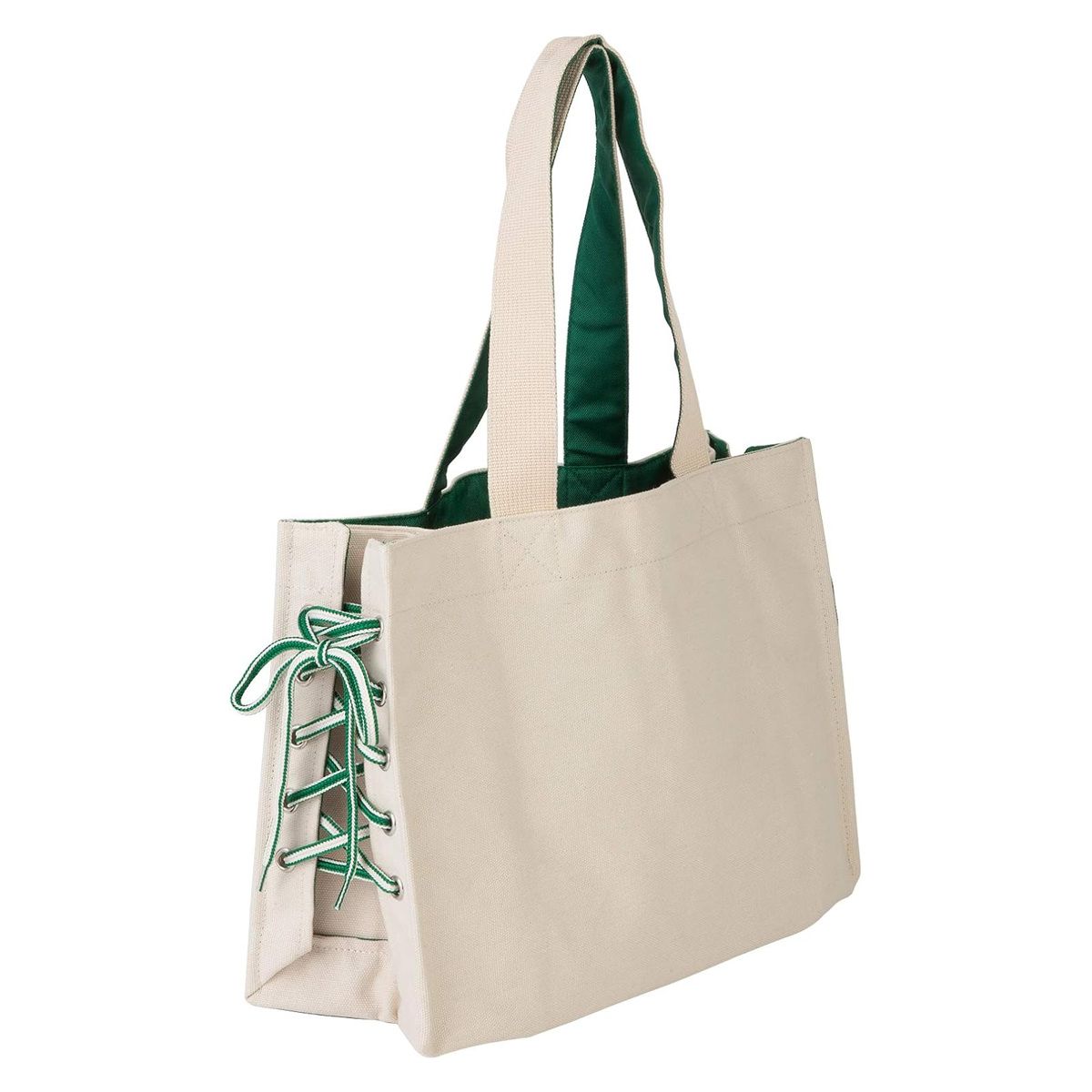 サイドの紐の締め具合でマチ幅を変えられるトートバッグです。キャンバス生地で、どんなファッションにも違和感なくなじみます。