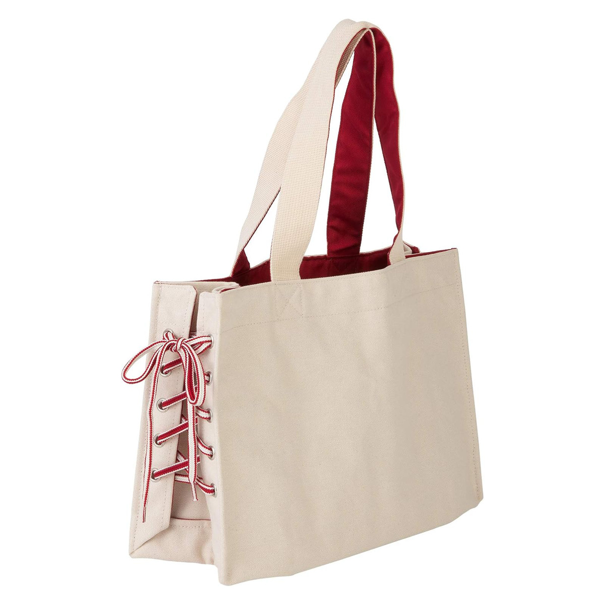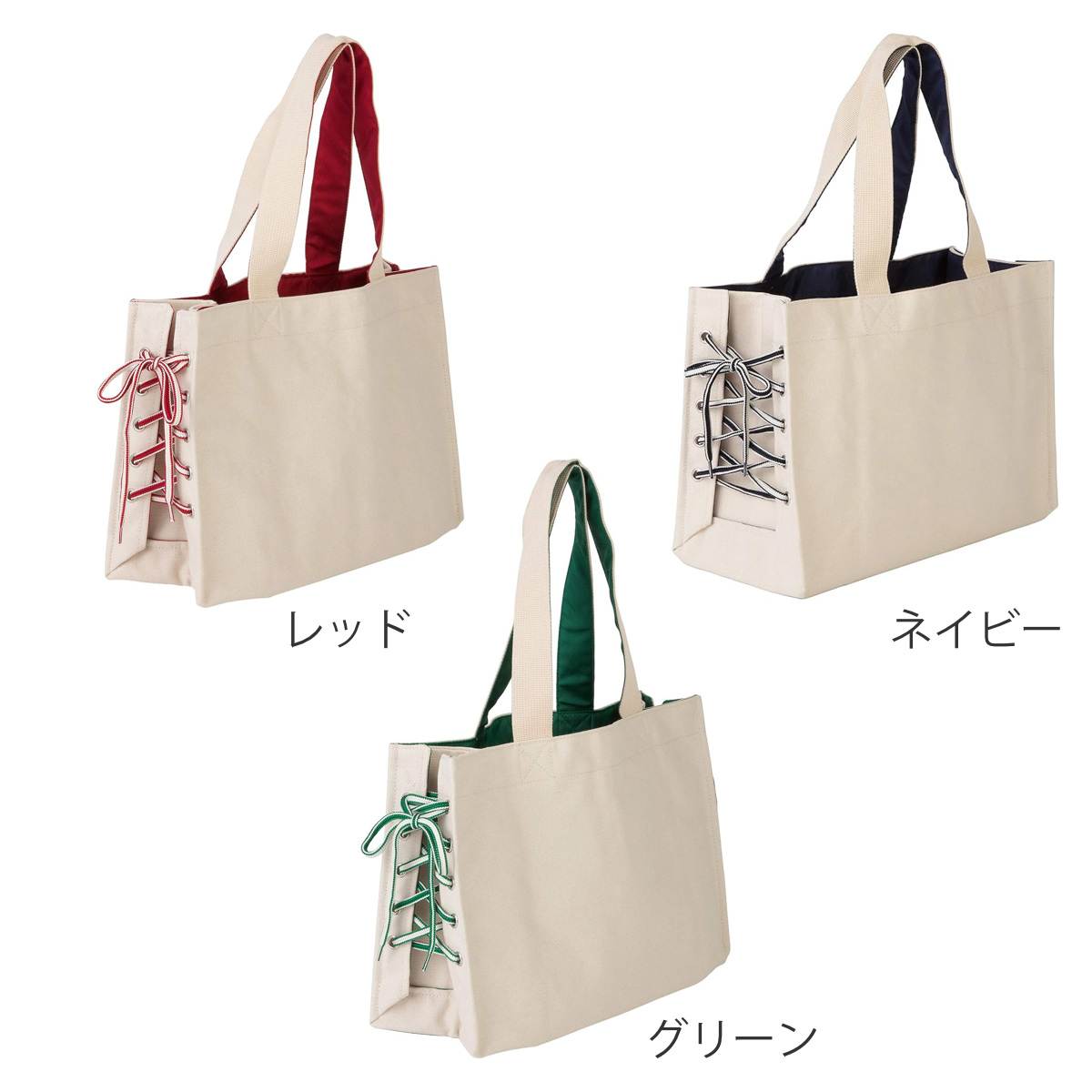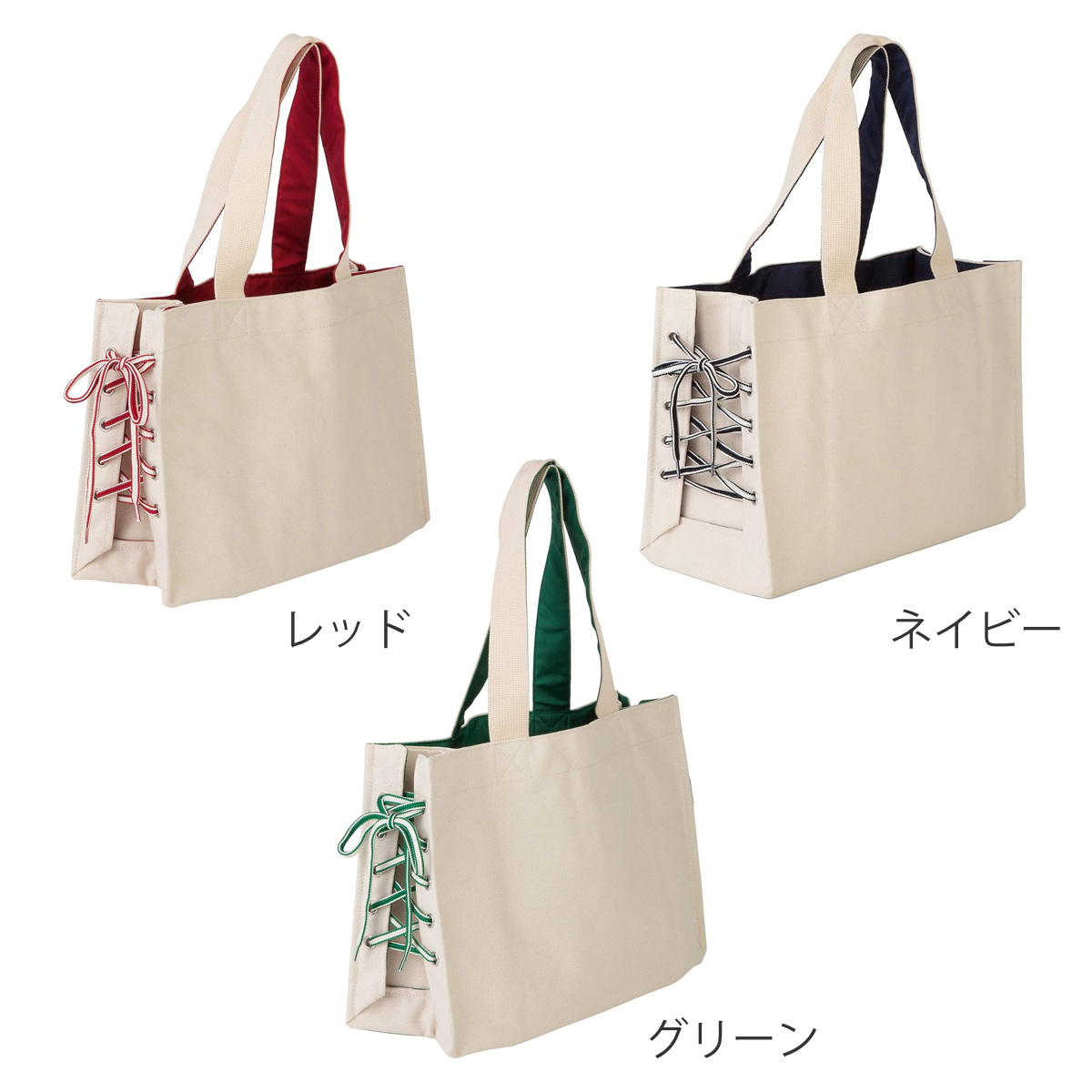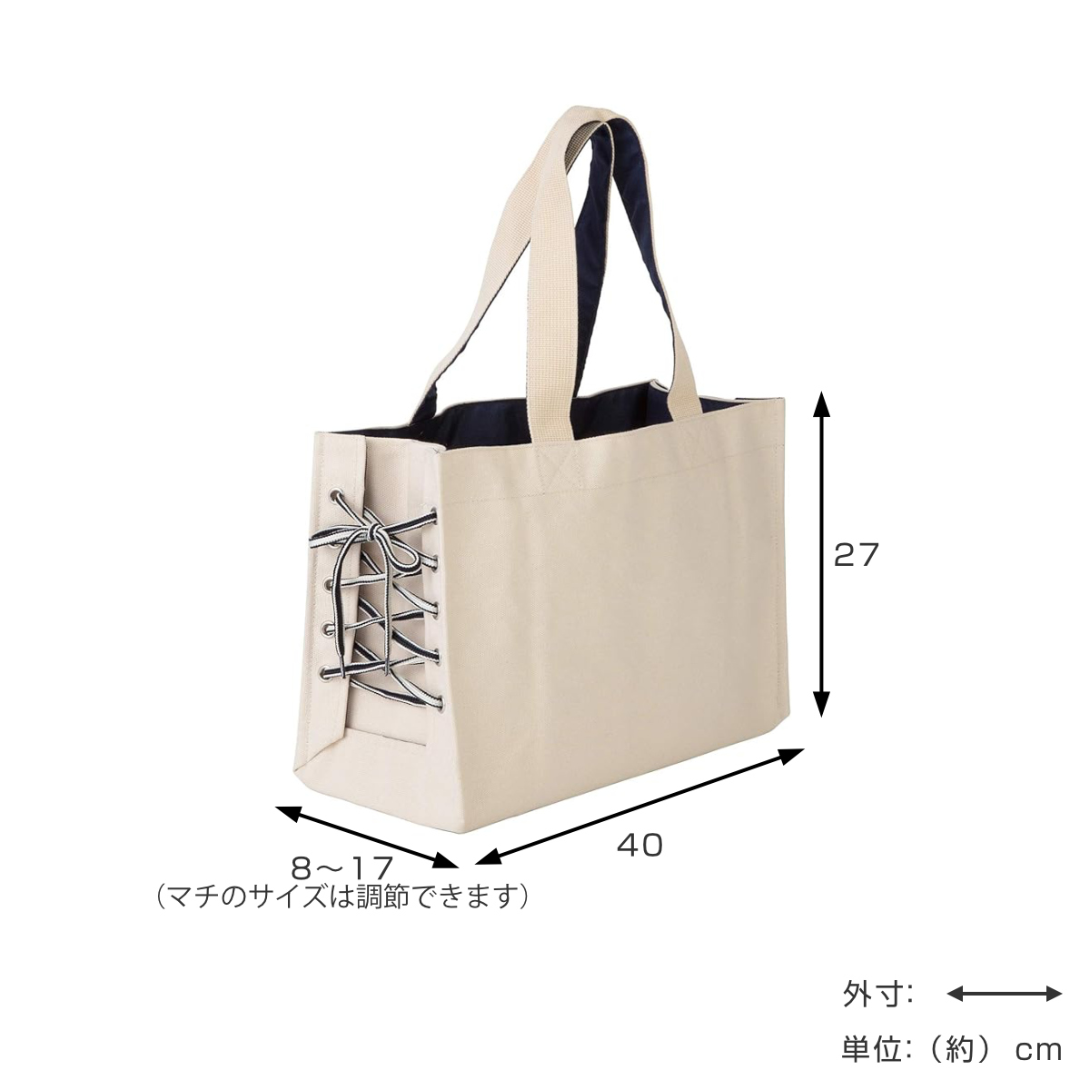 サイドの紐の締め具合でマチ幅を変えられるトートバッグです。キャンバス生地で、どんなファッションにも違和感なくなじみます。