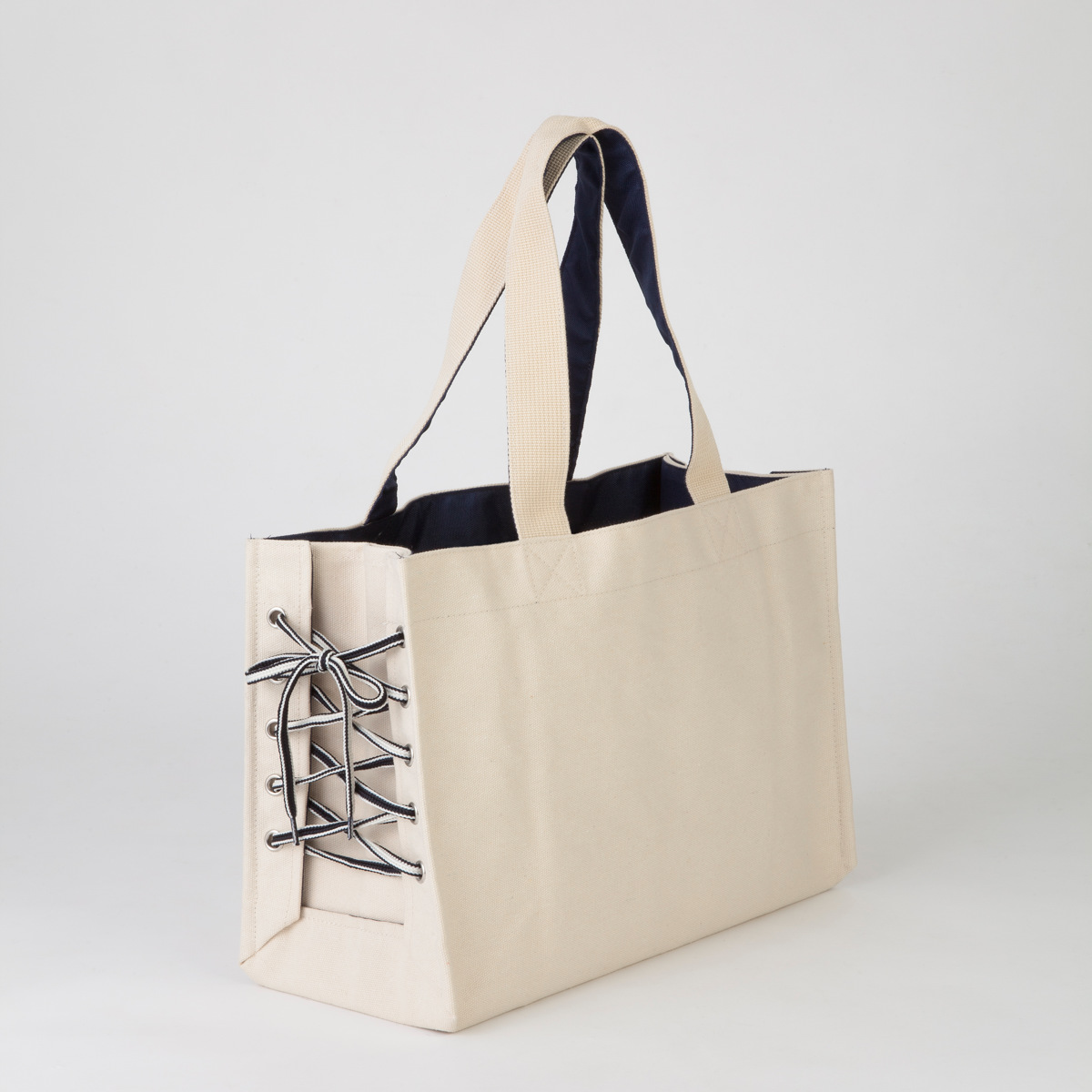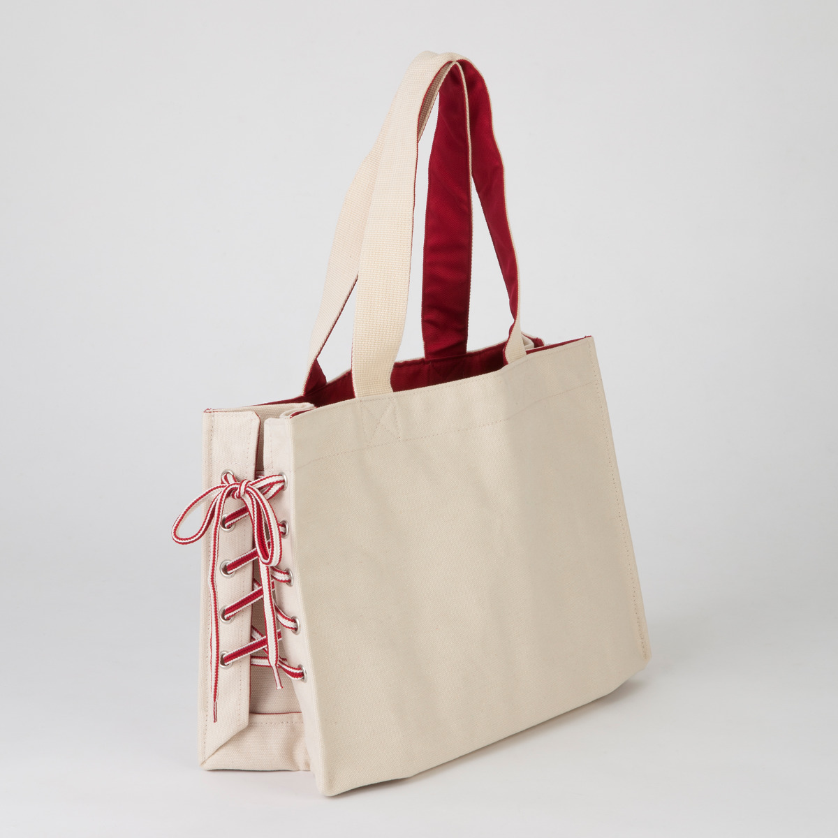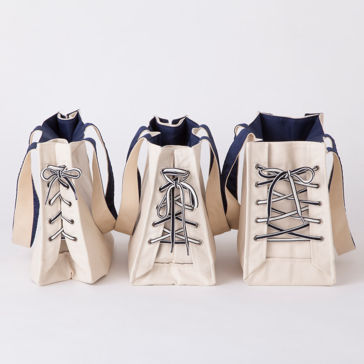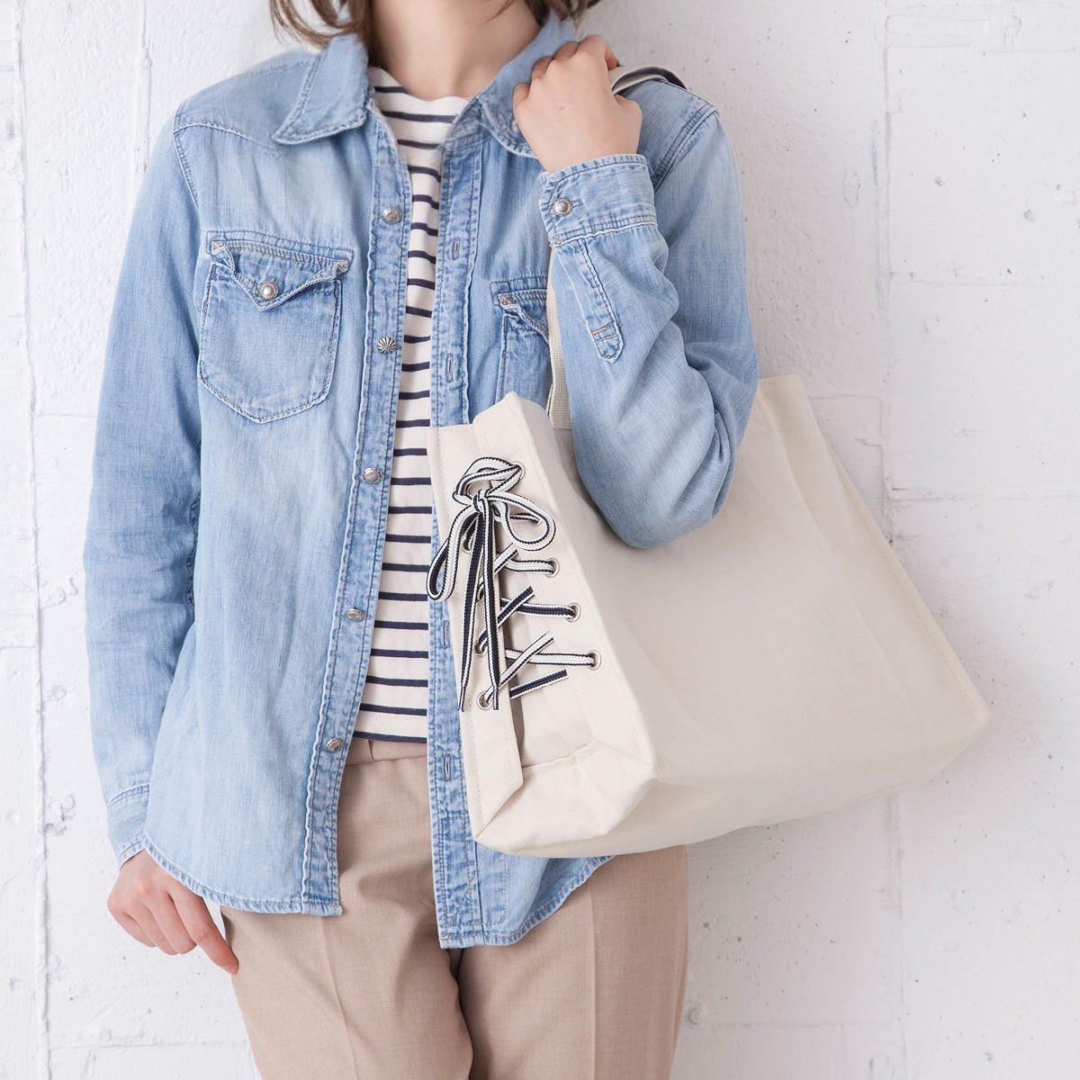 サイドの紐の締め具合でマチ幅を変えられるトートバッグです。キャンバス生地で、どんなファッションにも違和感なくなじみます。