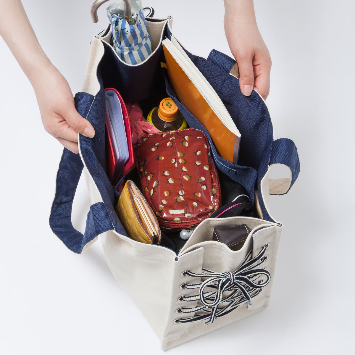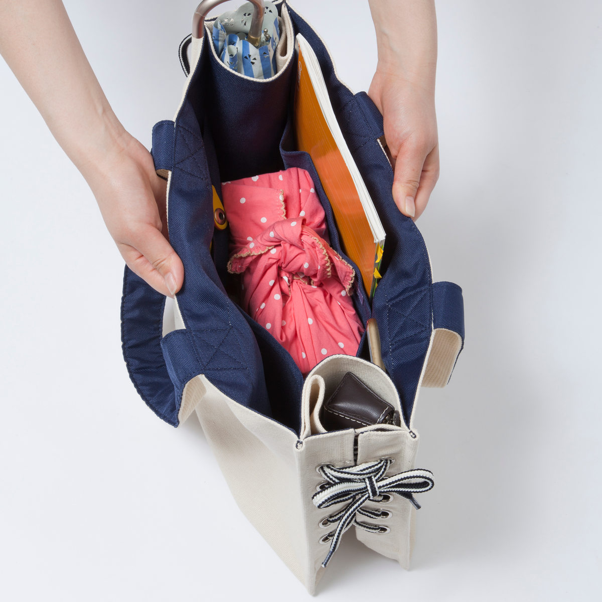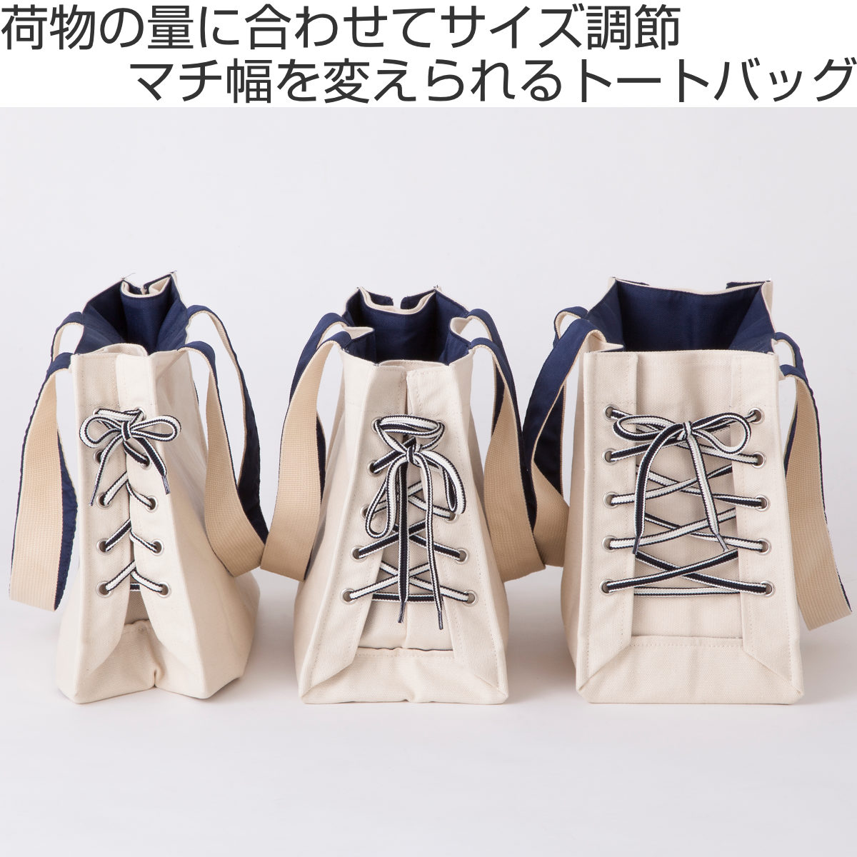 紐でマチ幅を変えられるトートバッグ