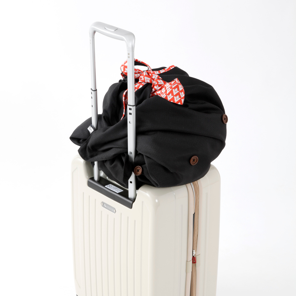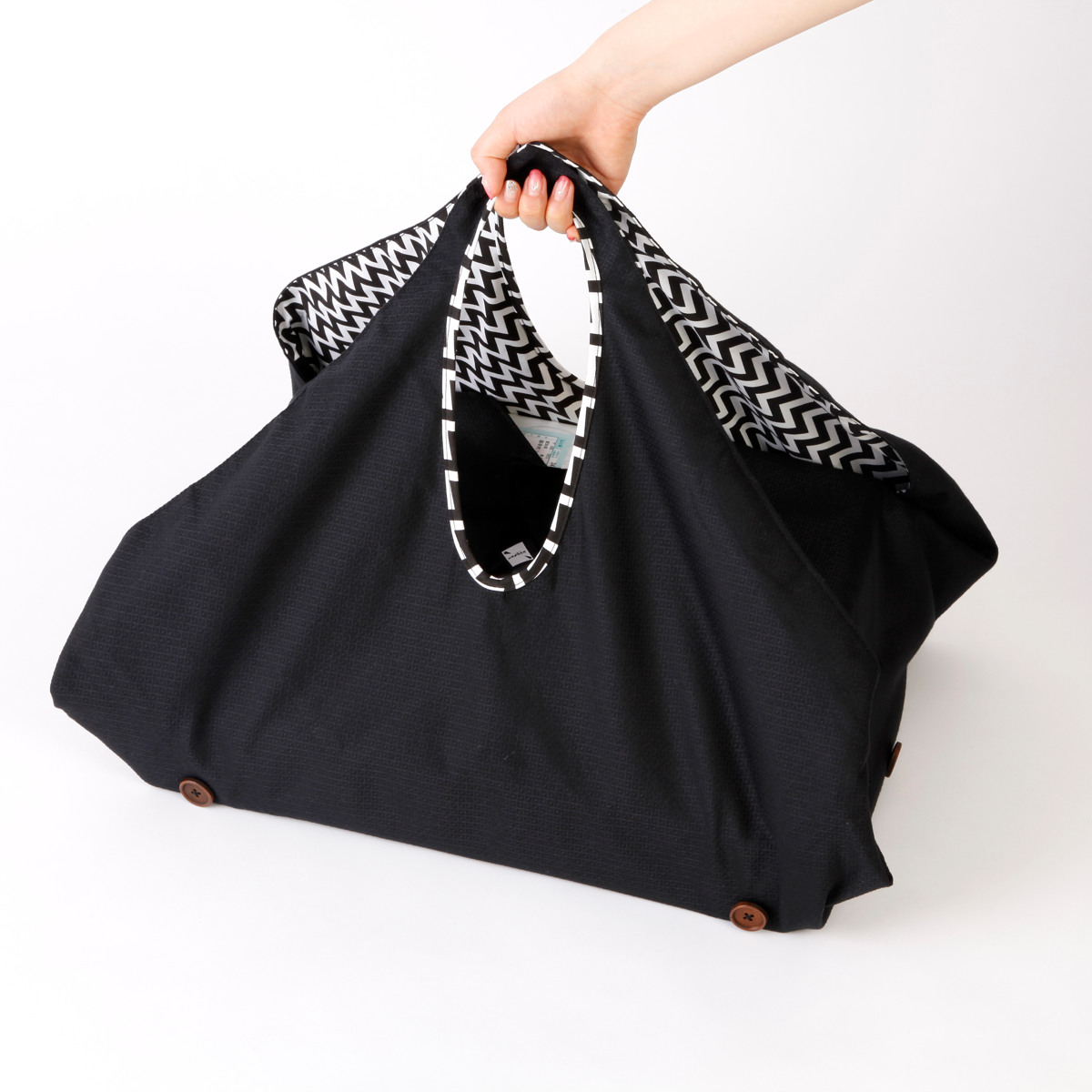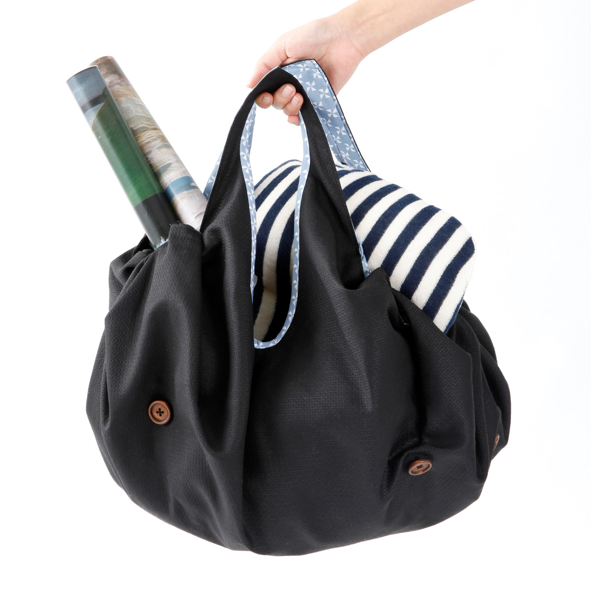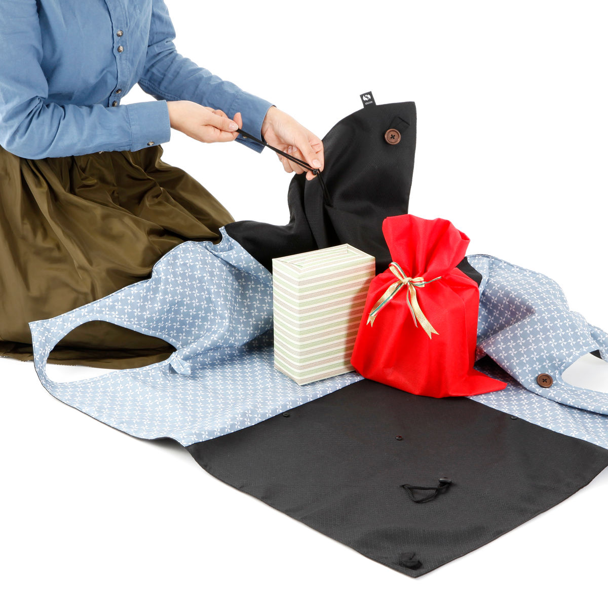 さまざまなサイズのものを、簡単に包むことができる多機能風呂敷バッグです。外出先で荷物が増えてしまったときに、サッと取り出してまとめることができます。