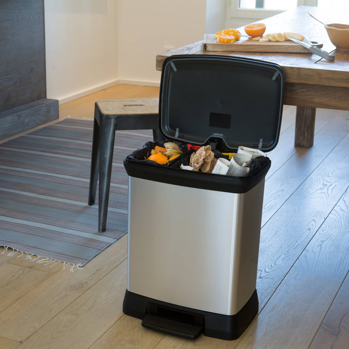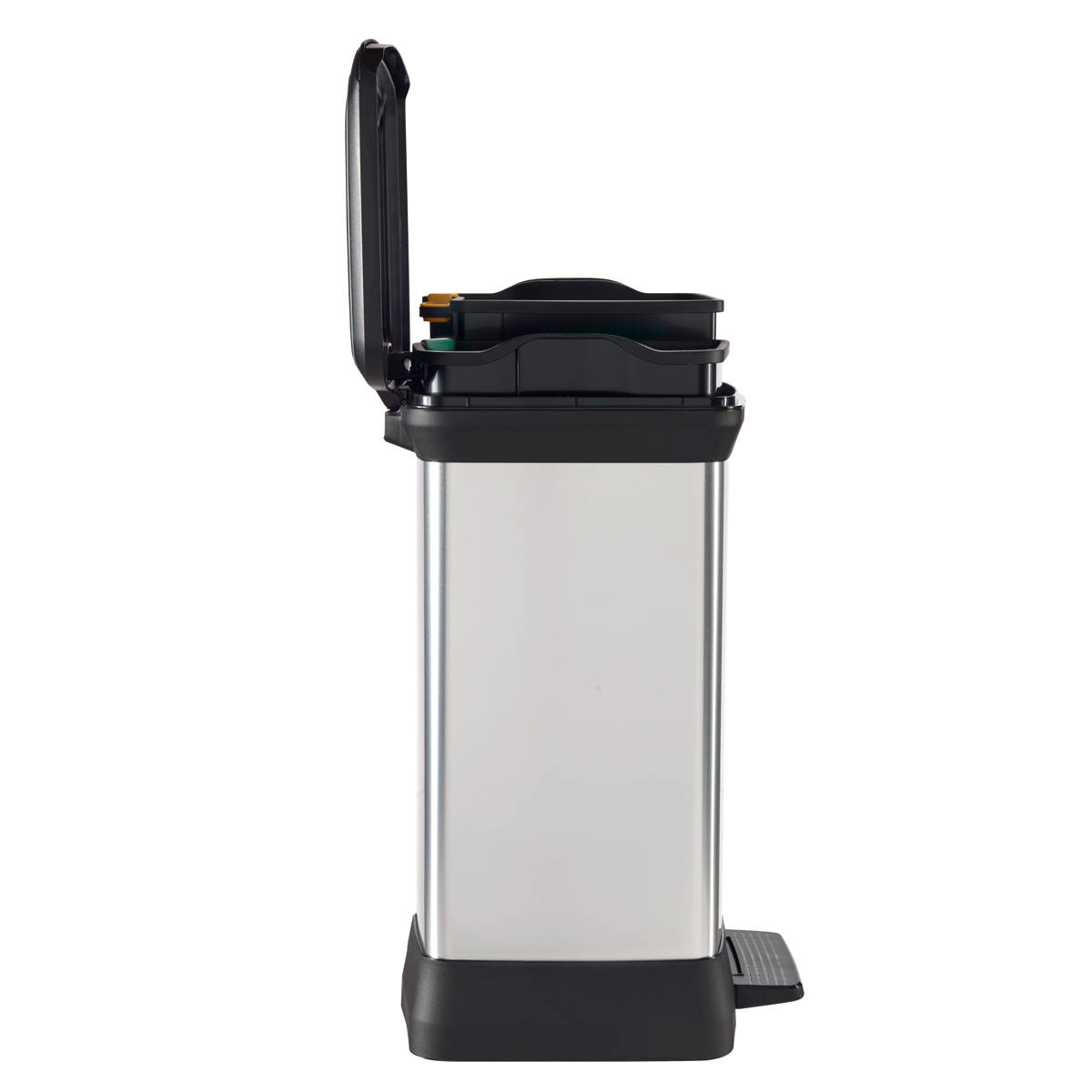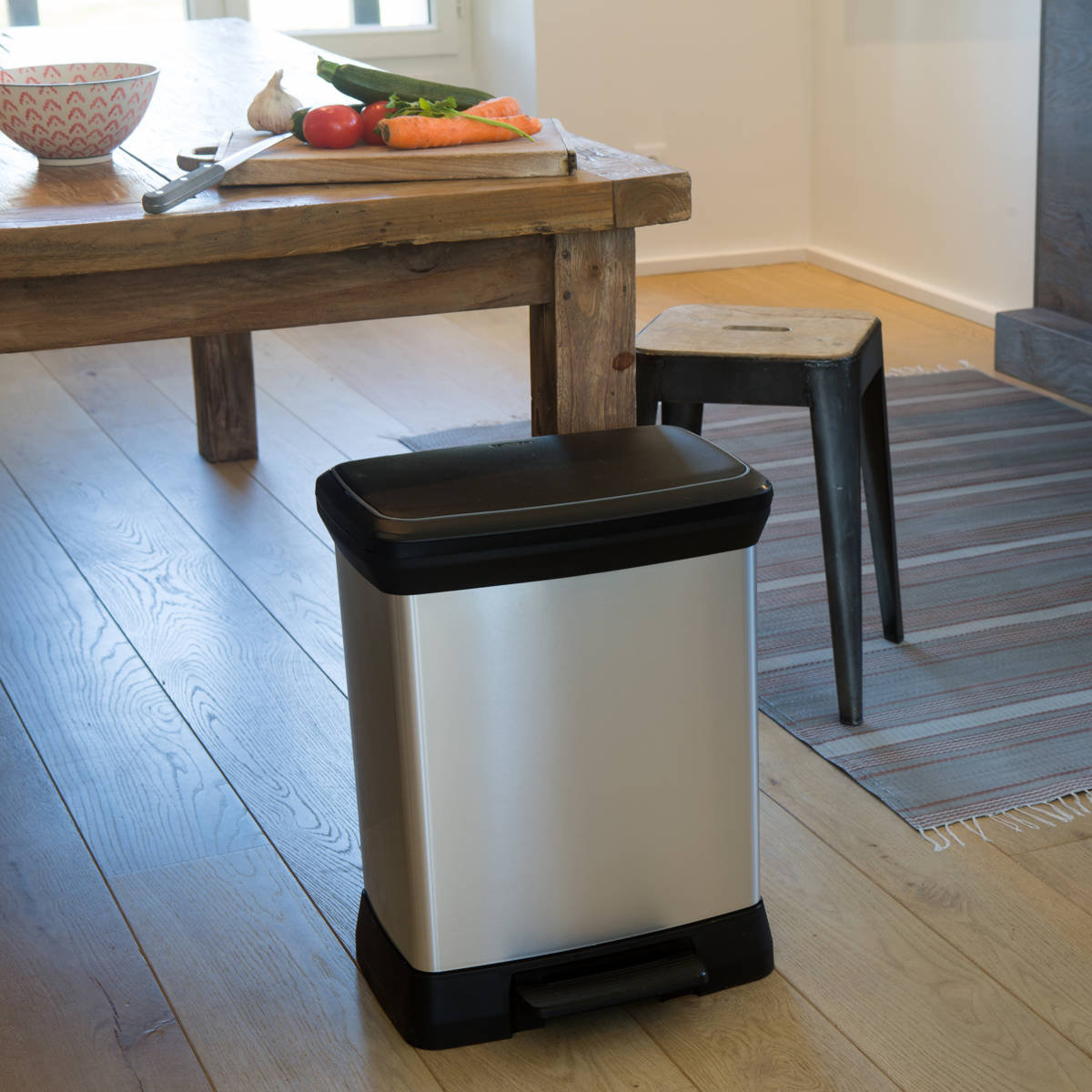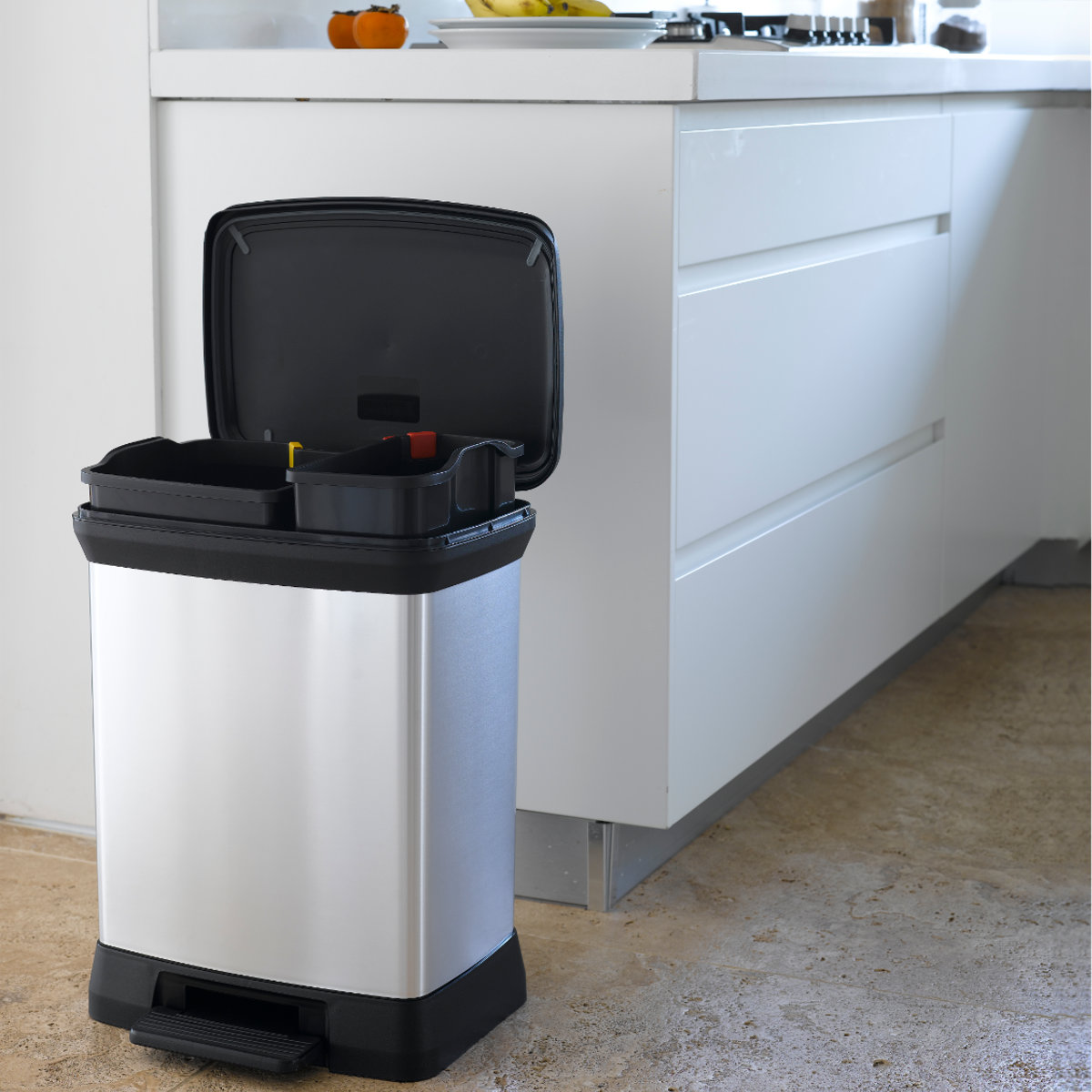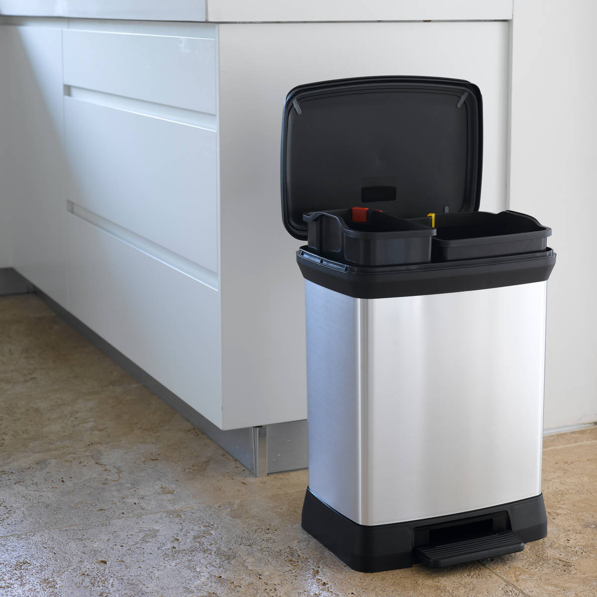 ステンレスのような上質な外観を持ちながら、リサイクルプラスチックを使用したペダル式ダストボックスです。特殊なインモールド成型により、プラスチック特有のチープさを感じさせない、美しく高級感のある質感を実現。キッチンやリビング、オフィスなど、どんなインテリアにも自然に溶け込みます。ワイド設計ながら奥行きはスリムで、場所を取らず扱いやすい28Lサイズです。